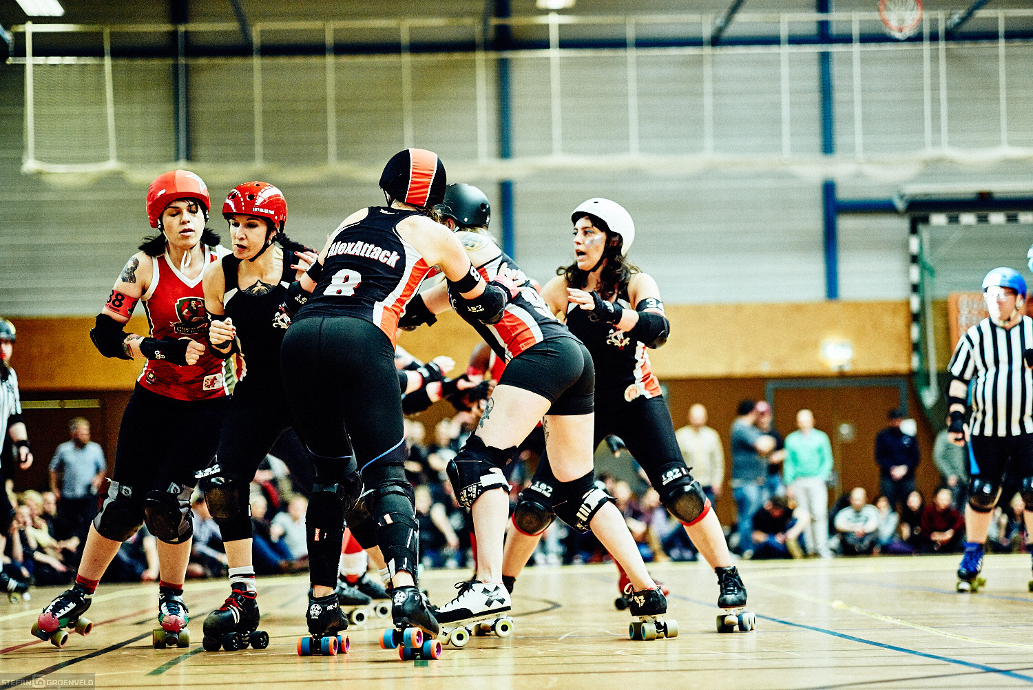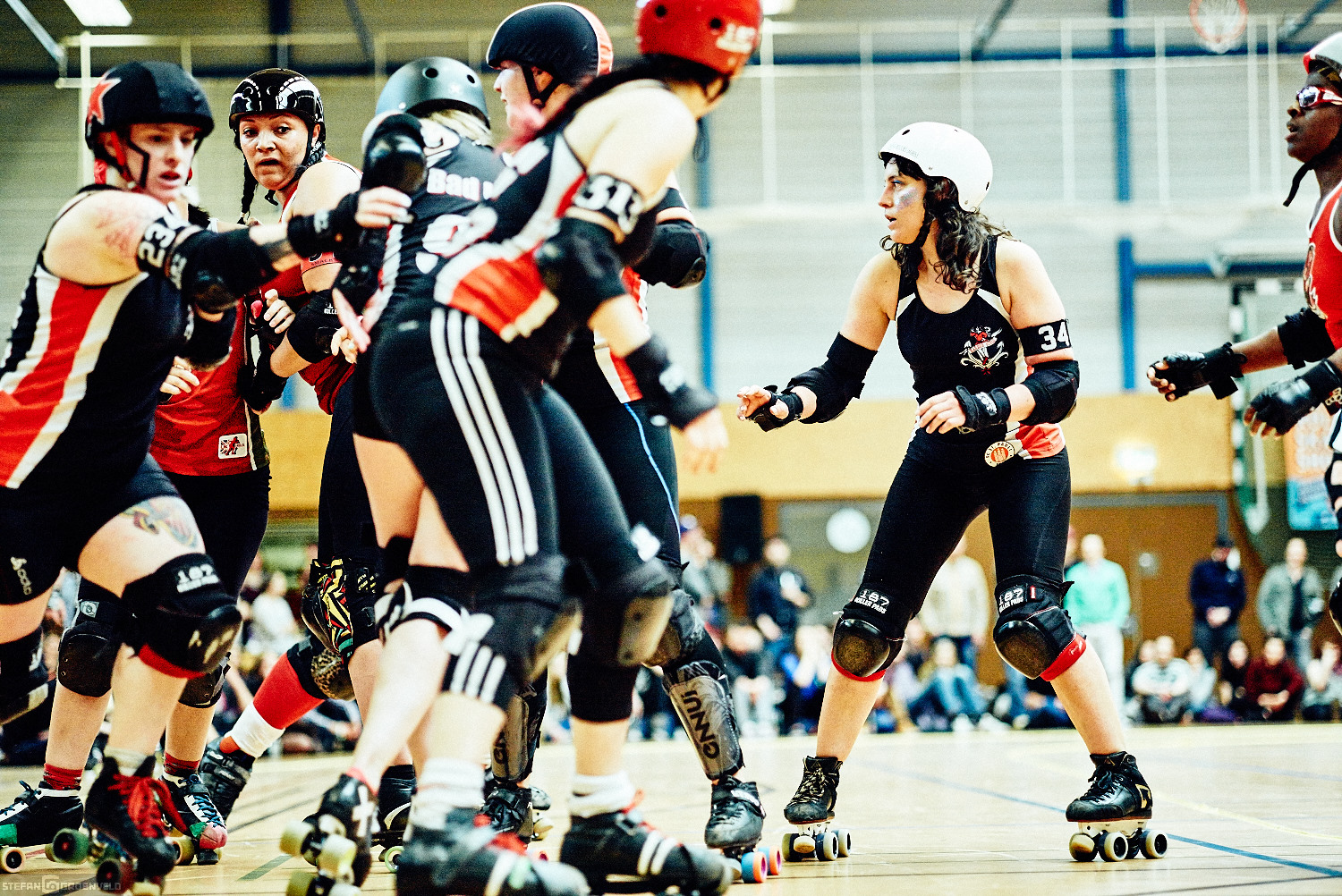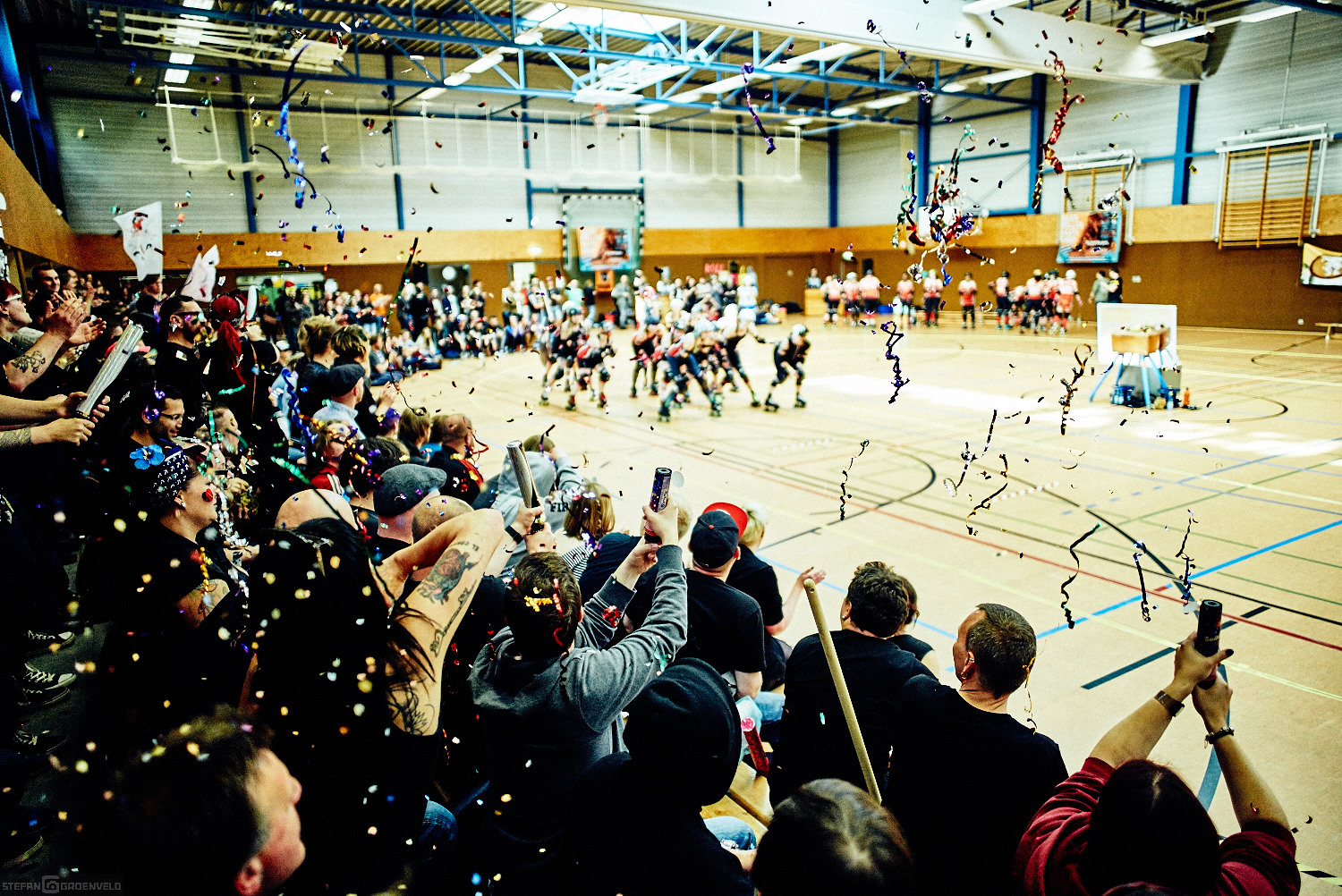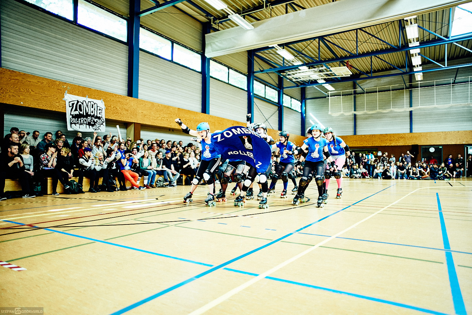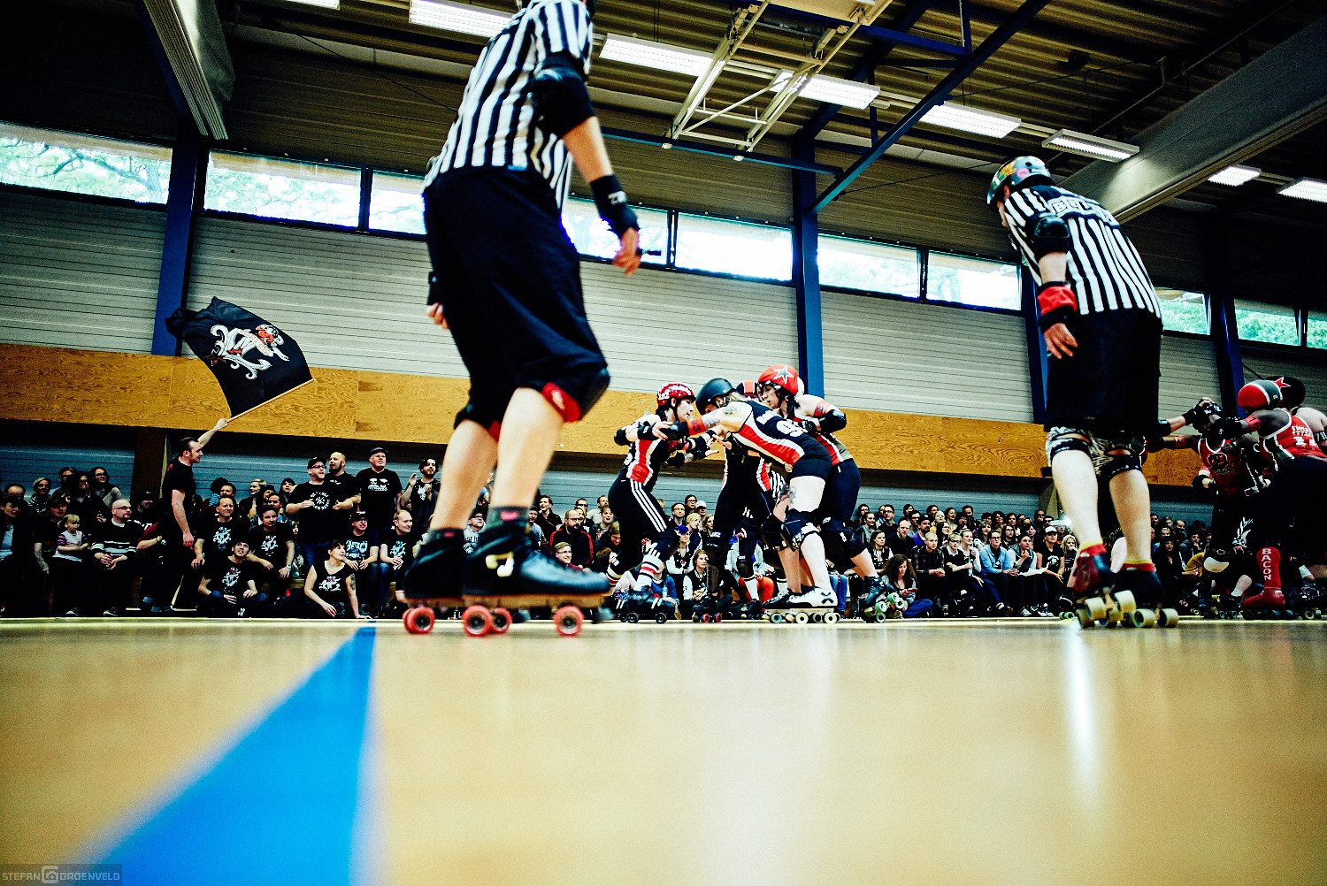 Die beiden Bouts hätten auch unterschiedlicher nicht verlaufen können. Beim Ersten überrollten die Harbor Girls die in sehr vielen belangen unterlegenen Zombies gnadenlos und gewannen spielerisch 172:96. Wunderbar anzusehen, als die Hamburger ein ums andere Mal wie ein heißes Messer durch die Butter der Zombiereihen durchglitten. Das zweite Bout war eine deutlich zähere Angelegenheit. Beide Abwehrreihen hatten Beton angerührt und es war für die Jammer kaum ein durchkommen. Wesentlich anspruchsvoller für die Zuschauer dem Treiben auf dem Track zu folgen, denn die fachkundigen Augen mussten zwei Packs gleichzeitig beobachten. Letztlich mussten sich die Harbor Girls in dem taktisch hochwertigen Spiel mit 127 zu 172 geschlagen geben. Der guten Stimmung in der Halle tat das keinen Abbruch. Und hinterher lagen sich auch die Spielerinnen wieder freudestrahlend in den Armen. Rollerderby ist eben eine faire Sportart.