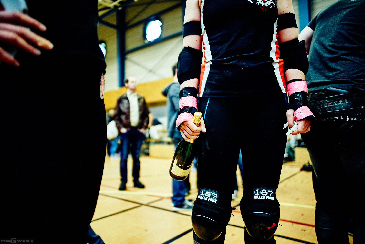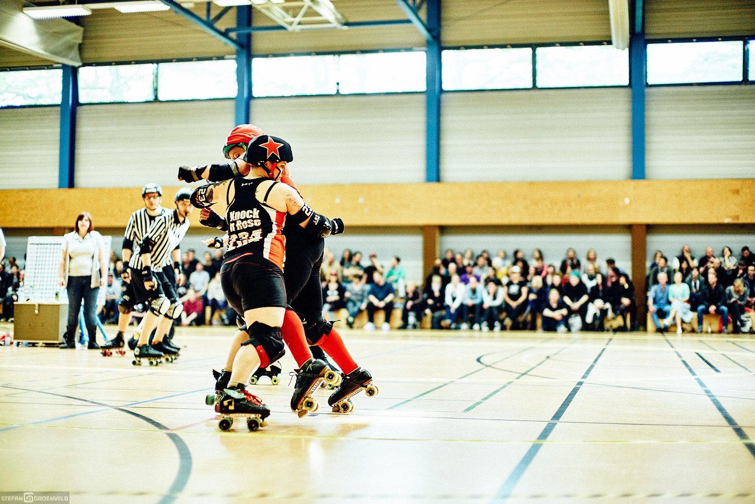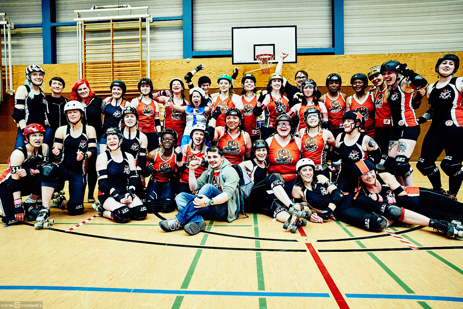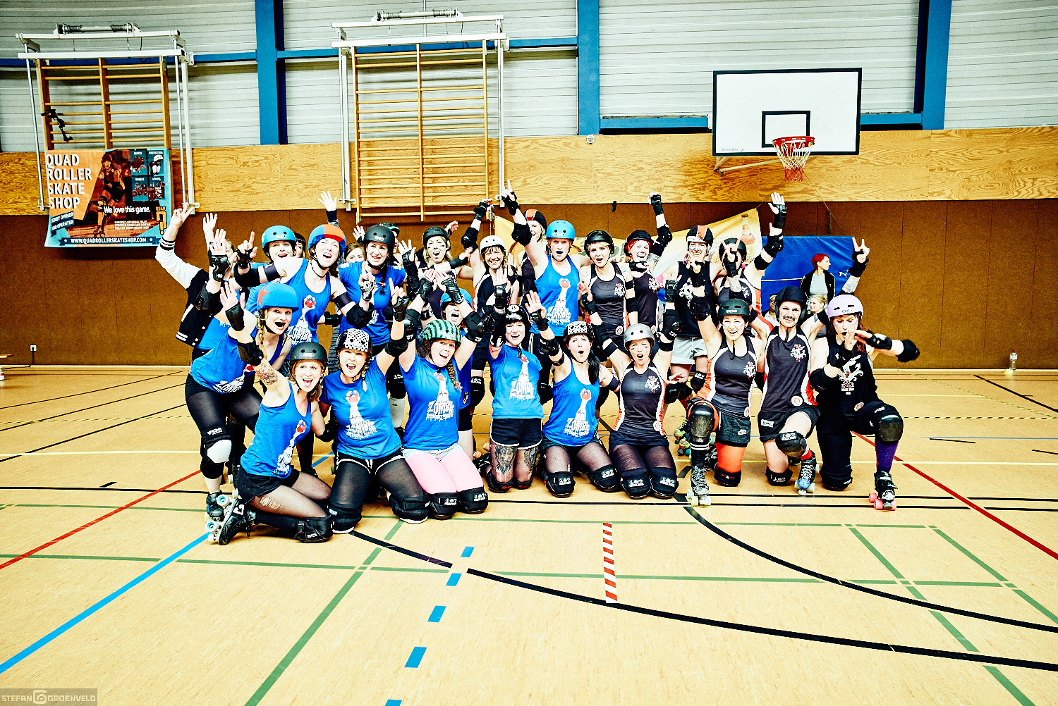 Die beiden Bouts hätten auch unterschiedlicher nicht verlaufen können. Beim Ersten überrollten die Harbor Girls die in sehr vielen belangen unterlegenen Zombies gnadenlos und gewannen spielerisch 172:96. Wunderbar anzusehen, als die Hamburger ein ums andere Mal wie ein heißes Messer durch die Butter der Zombiereihen durchglitten. Das zweite Bout war eine deutlich zähere Angelegenheit. Beide Abwehrreihen hatten Beton angerührt und es war für die Jammer kaum ein durchkommen. Wesentlich anspruchsvoller für die Zuschauer dem Treiben auf dem Track zu folgen, denn die fachkundigen Augen mussten zwei Packs gleichzeitig beobachten. Letztlich mussten sich die Harbor Girls in dem taktisch hochwertigen Spiel mit 127 zu 172 geschlagen geben. Der guten Stimmung in der Halle tat das keinen Abbruch. Und hinterher lagen sich auch die Spielerinnen wieder freudestrahlend in den Armen. Rollerderby ist eben eine faire Sportart.
