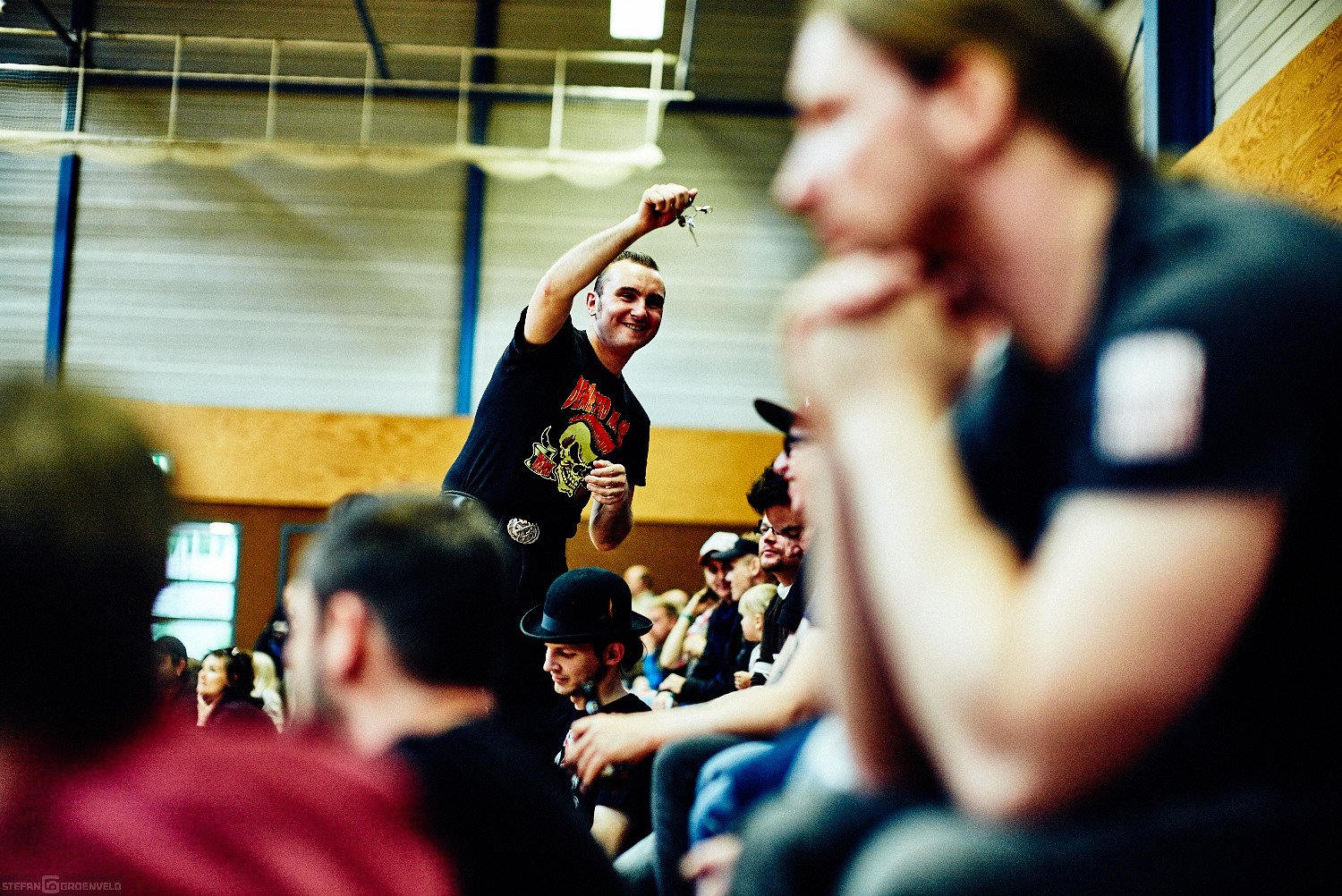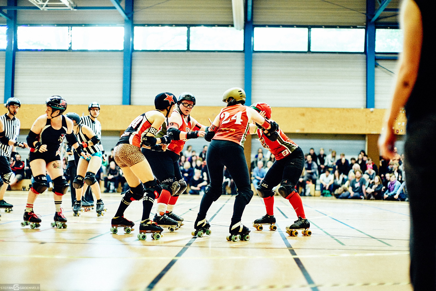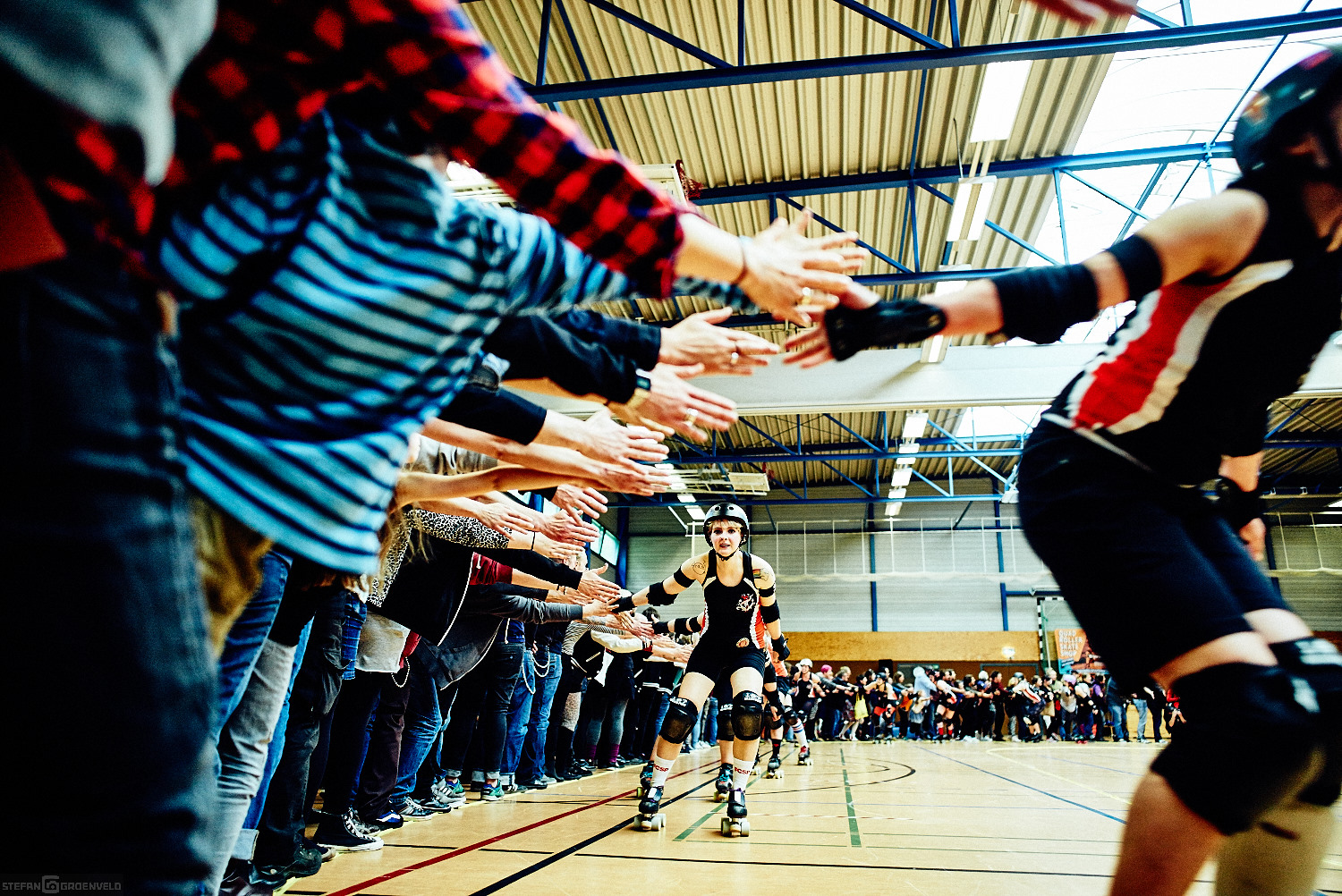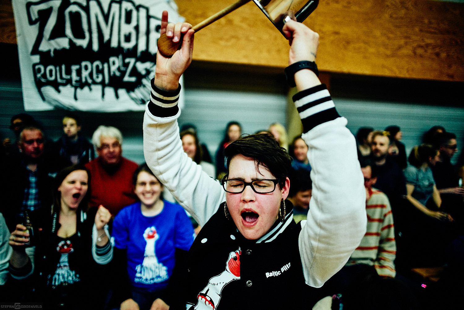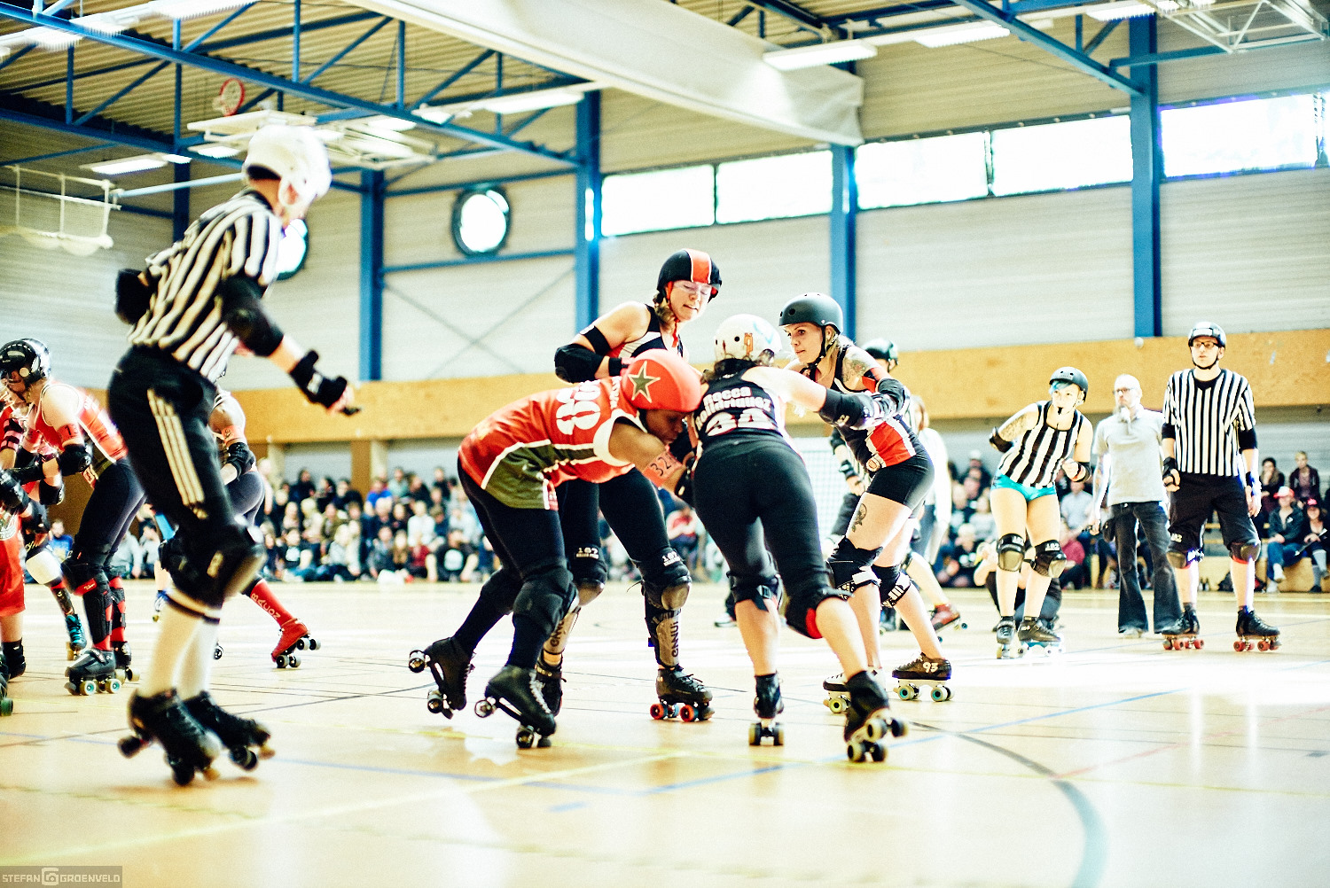 Die beiden Bouts hätten auch unterschiedlicher nicht verlaufen können. Beim Ersten überrollten die Harbor Girls die in sehr vielen belangen unterlegenen Zombies gnadenlos und gewannen spielerisch 172:96. Wunderbar anzusehen, als die Hamburger ein ums andere Mal wie ein heißes Messer durch die Butter der Zombiereihen durchglitten. Das zweite Bout war eine deutlich zähere Angelegenheit. Beide Abwehrreihen hatten Beton angerührt und es war für die Jammer kaum ein durchkommen. Wesentlich anspruchsvoller für die Zuschauer dem Treiben auf dem Track zu folgen, denn die fachkundigen Augen mussten zwei Packs gleichzeitig beobachten. Letztlich mussten sich die Harbor Girls in dem taktisch hochwertigen Spiel mit 127 zu 172 geschlagen geben. Der guten Stimmung in der Halle tat das keinen Abbruch. Und hinterher lagen sich auch die Spielerinnen wieder freudestrahlend in den Armen. Rollerderby ist eben eine faire Sportart.