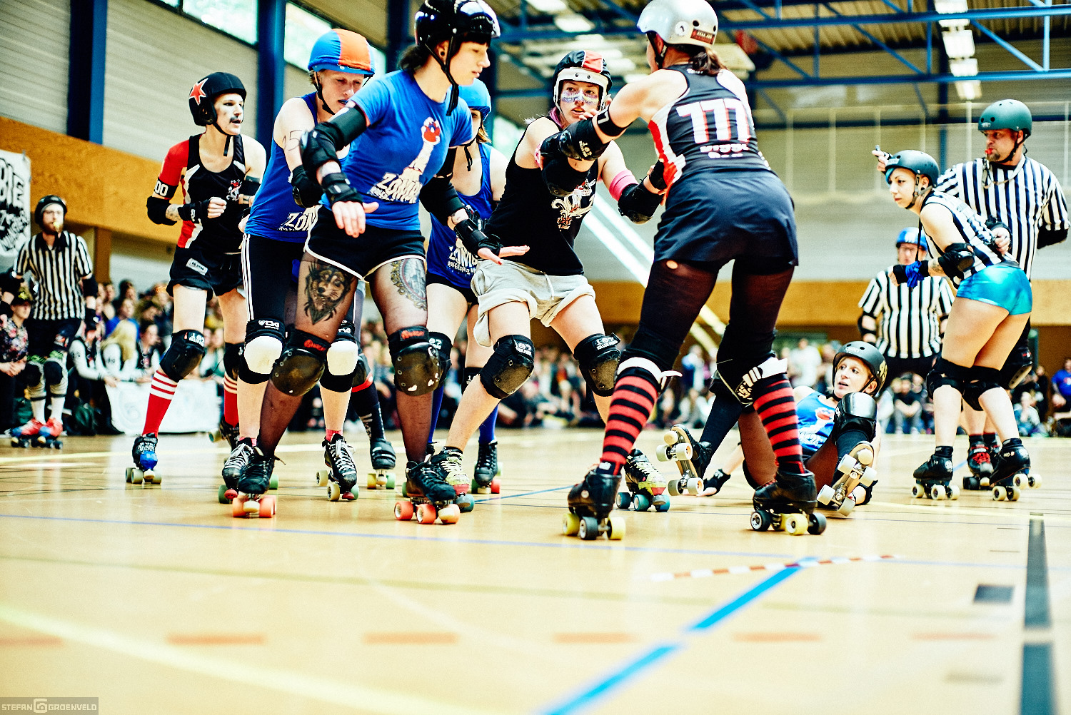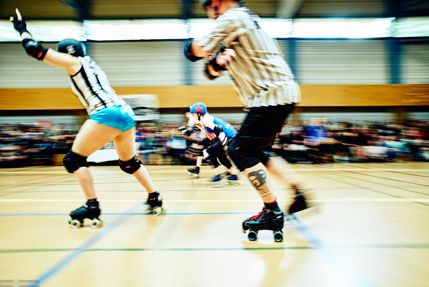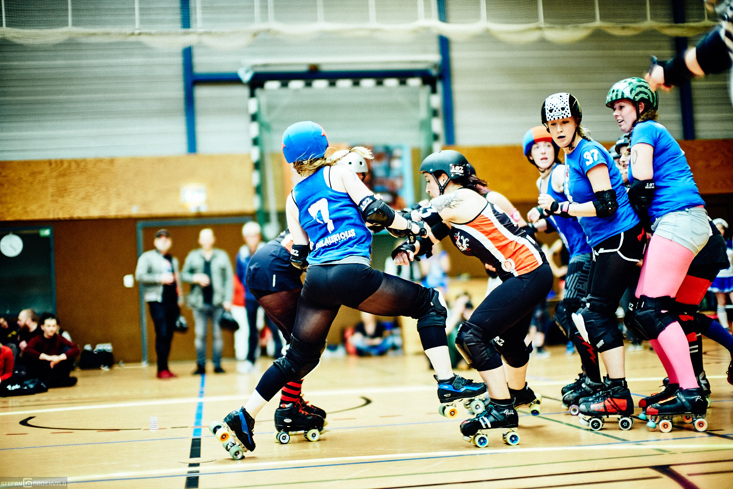 Zeitgleich zum Fanclubturnier fand nebenan in der Sporthalle vom Wirtschaftsgymnasium ein Doubleheader mit den Hamburg Harbor Girls statt. Im ersten Bout kämpfte das B Team gegen die Zombie Rollergirlz aus Münster und im Zweiten das A Team gegen die Birmingham Blitz Dames. Du hast immer noch keine Ahnung, von was ich schreibe? Natürlich vom Rollerderby. Diesem wunderbaren Sport auf 8 Rollen, den du trotz relativ einfacher Regeln erst nach dem dritten oder vierten Mal ansatzweise verstehst. Und glaube mir, ich weiß von was ich spreche: ich habe seit zwei Jahren nur sehr wenige Bouts verpasst.