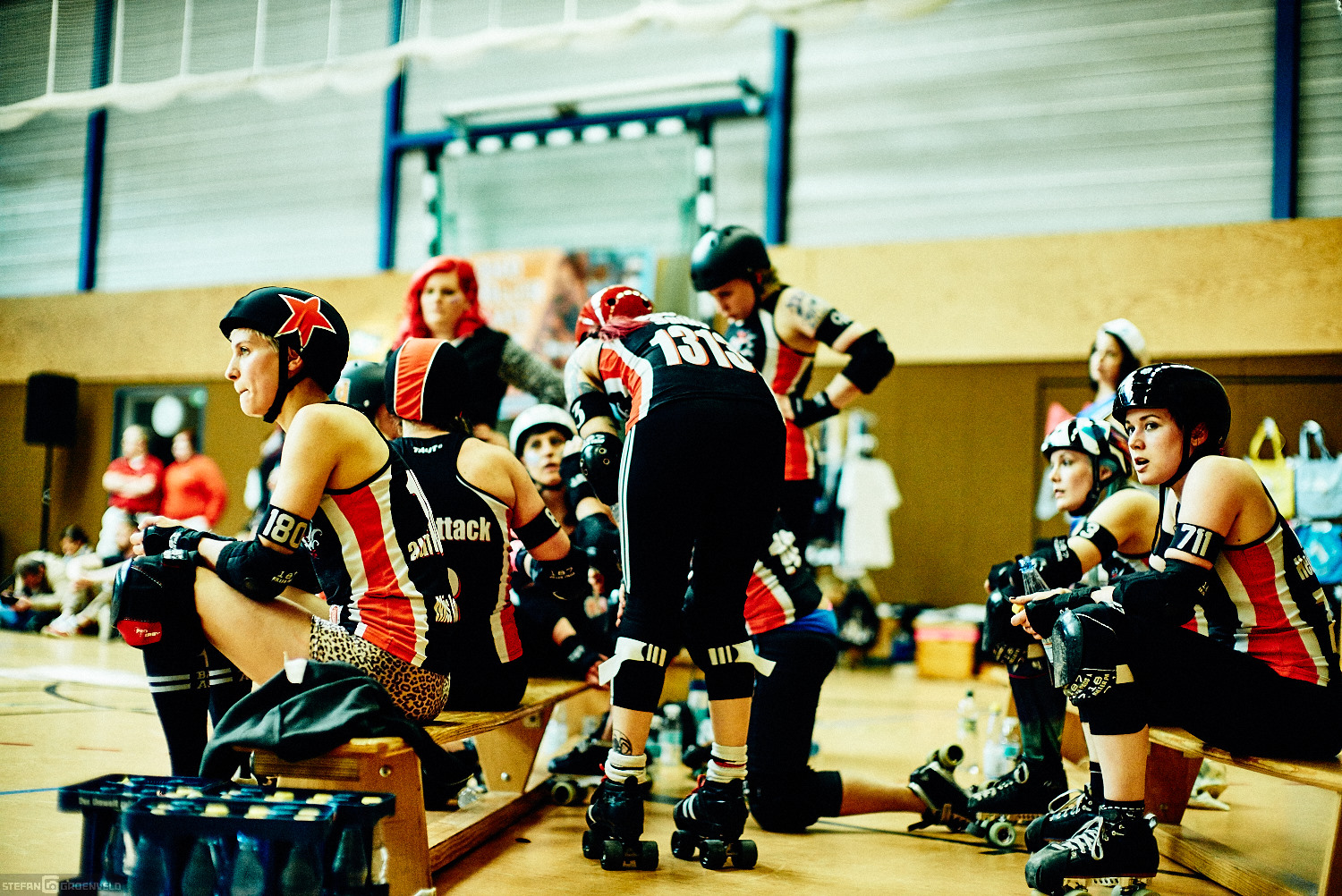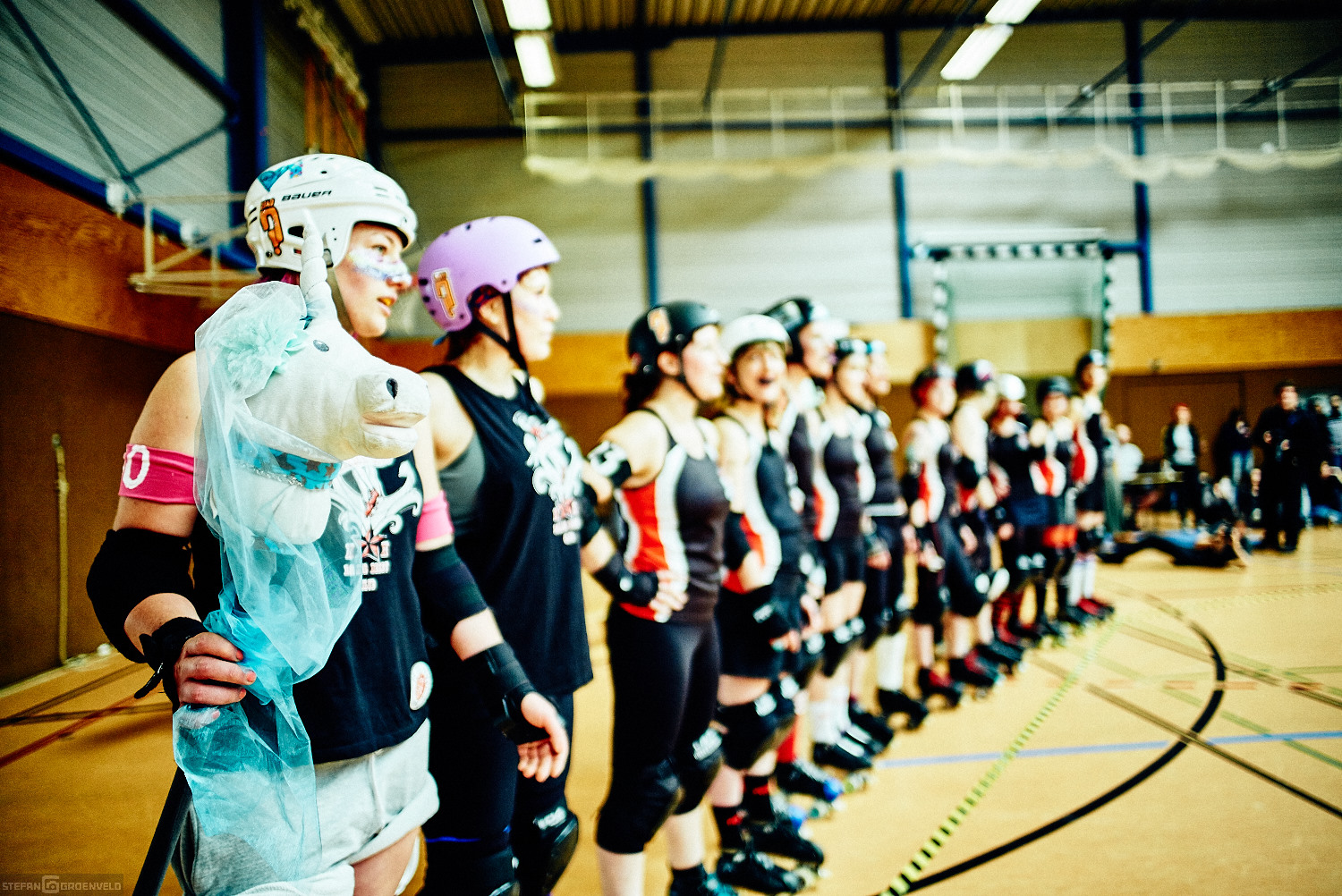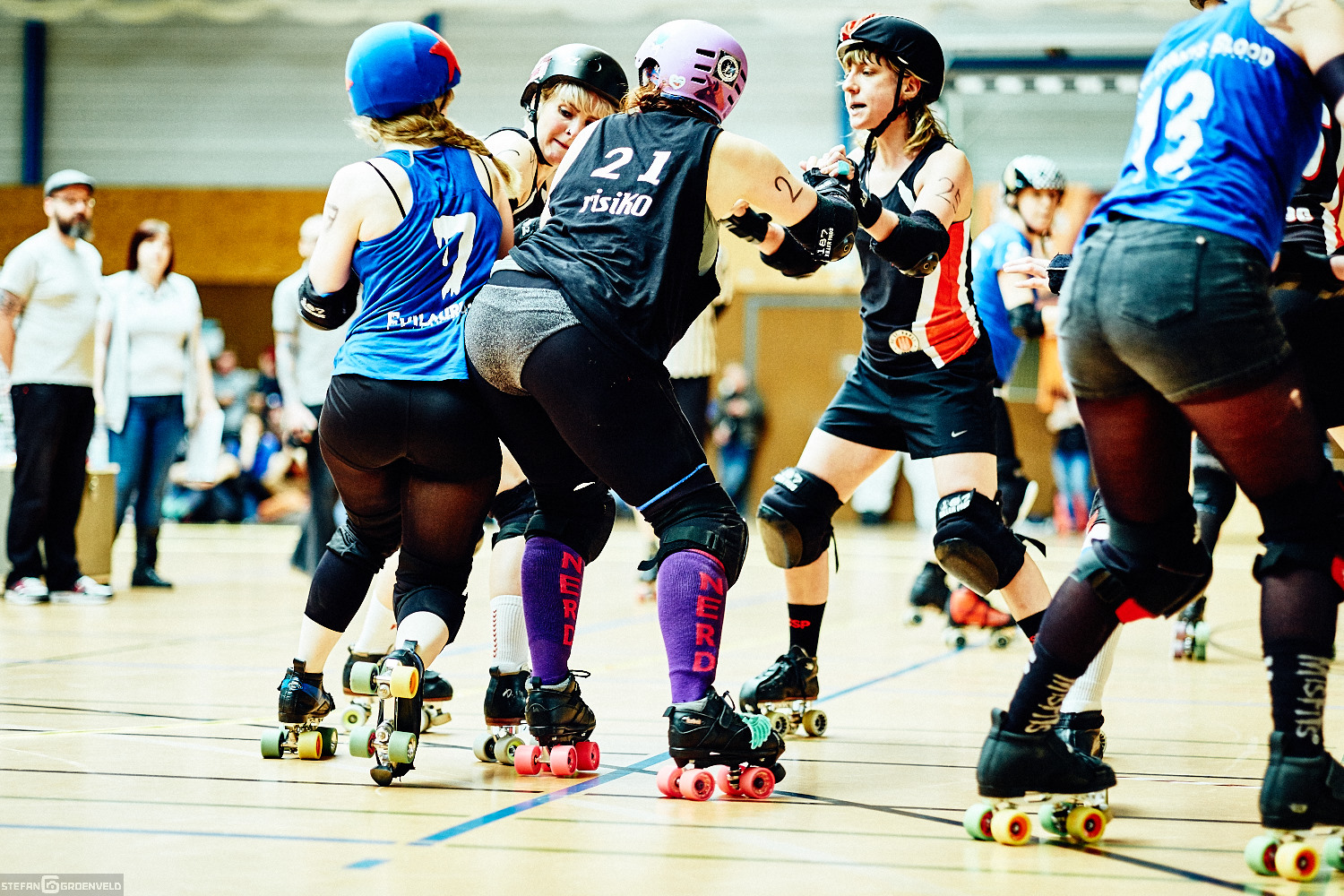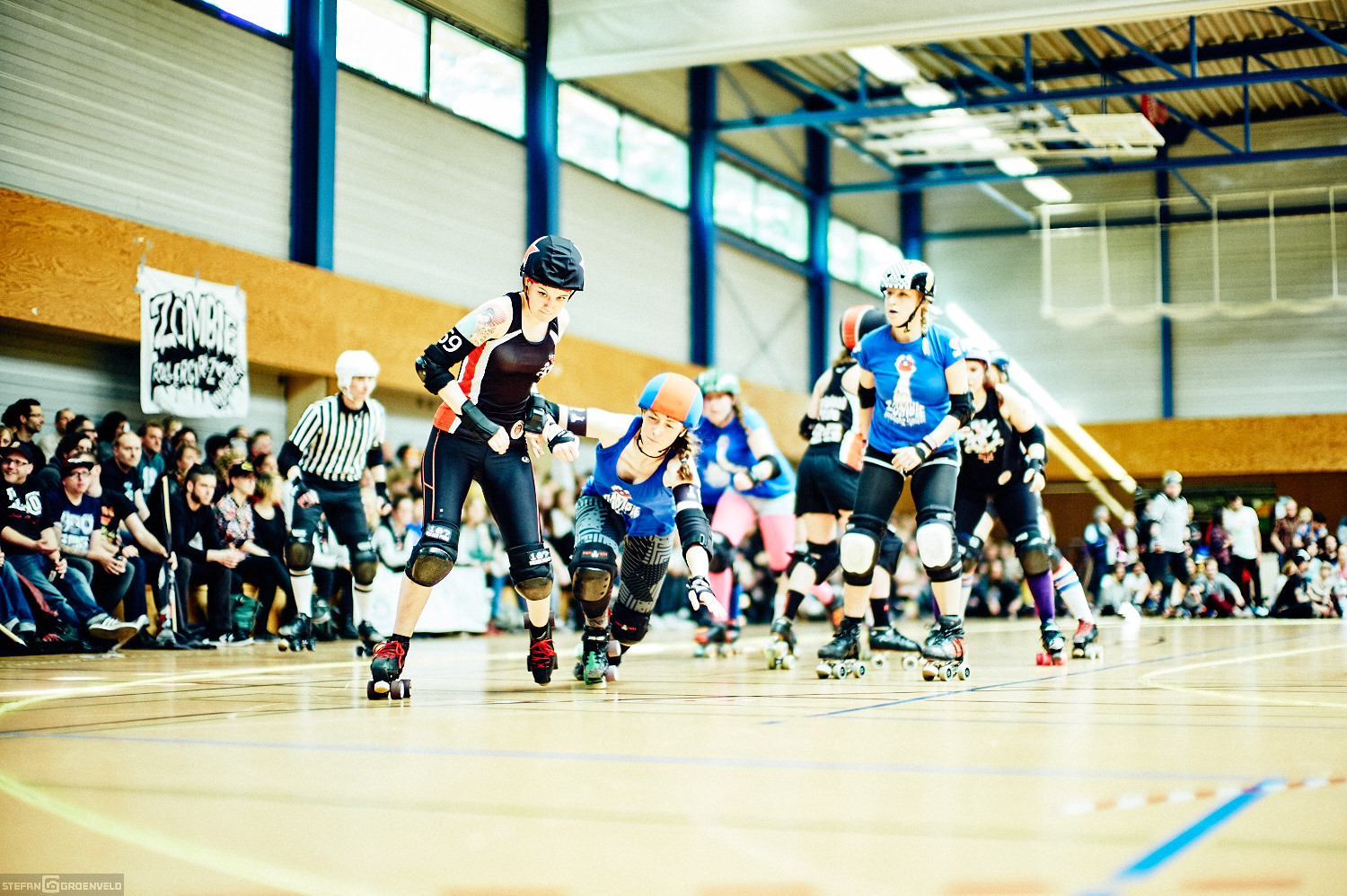 Zeitgleich zum Fanclubturnier fand nebenan in der Sporthalle vom Wirtschaftsgymnasium ein Doubleheader mit den Hamburg Harbor Girls statt. Im ersten Bout kämpfte das B Team gegen die Zombie Rollergirlz aus Münster und im Zweiten das A Team gegen die Birmingham Blitz Dames. Du hast immer noch keine Ahnung, von was ich schreibe? Natürlich vom Rollerderby. Diesem wunderbaren Sport auf 8 Rollen, den du trotz relativ einfacher Regeln erst nach dem dritten oder vierten Mal ansatzweise verstehst. Und glaube mir, ich weiß von was ich spreche: ich habe seit zwei Jahren nur sehr wenige Bouts verpasst.