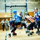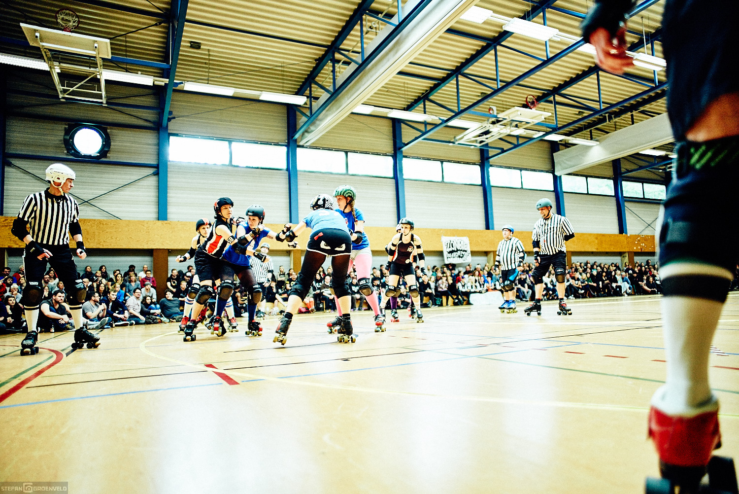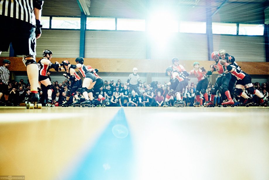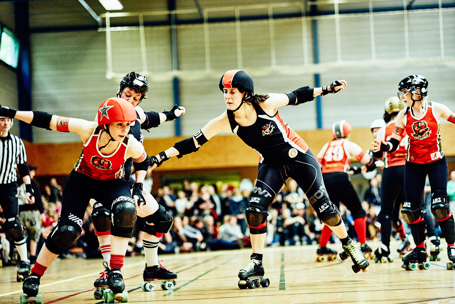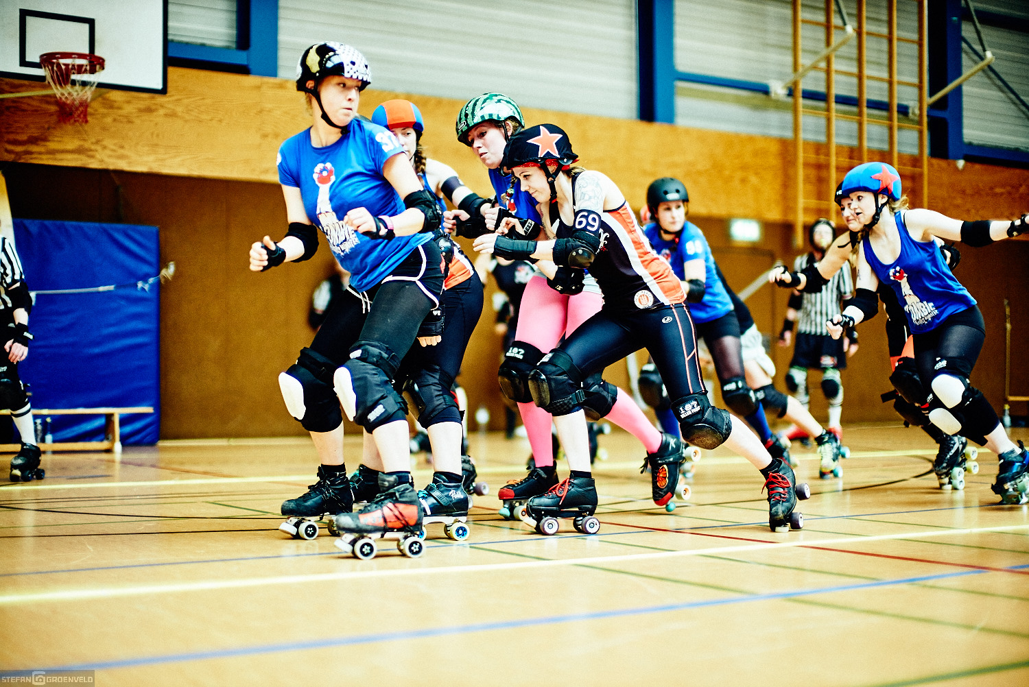 Zeitgleich zum Fanclubturnier fand nebenan in der Sporthalle vom Wirtschaftsgymnasium ein Doubleheader mit den Hamburg Harbor Girls statt. Im ersten Bout kämpfte das B Team gegen die Zombie Rollergirlz aus Münster und im Zweiten das A Team gegen die Birmingham Blitz Dames. Du hast immer noch keine Ahnung, von was ich schreibe? Natürlich vom Rollerderby. Diesem wunderbaren Sport auf 8 Rollen, den du trotz relativ einfacher Regeln erst nach dem dritten oder vierten Mal ansatzweise verstehst. Und glaube mir, ich weiß von was ich spreche: ich habe seit zwei Jahren nur sehr wenige Bouts verpasst.