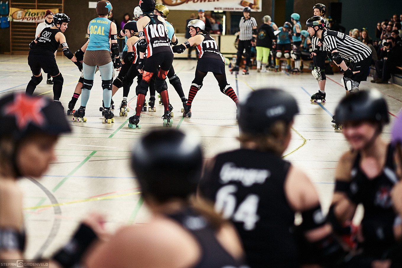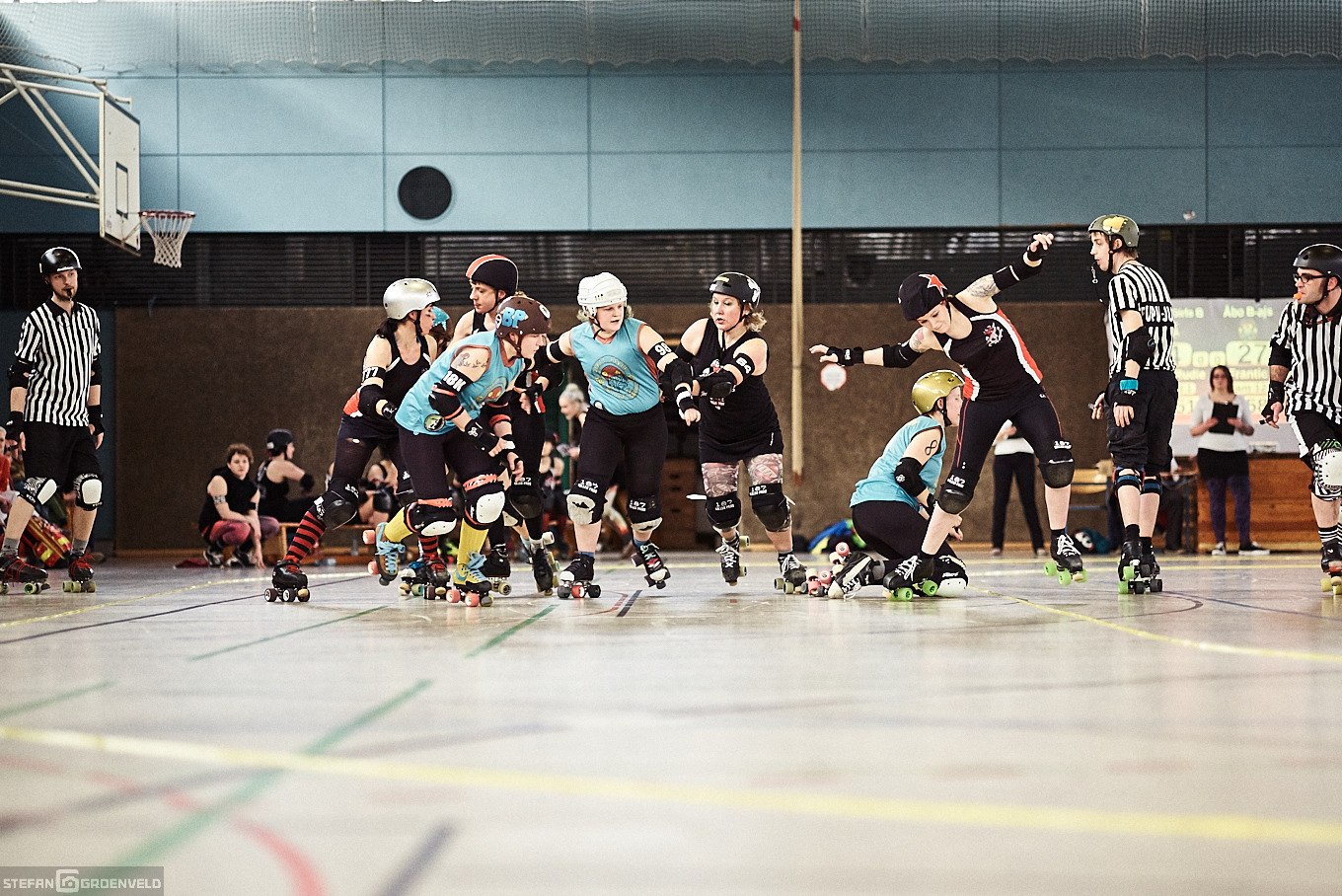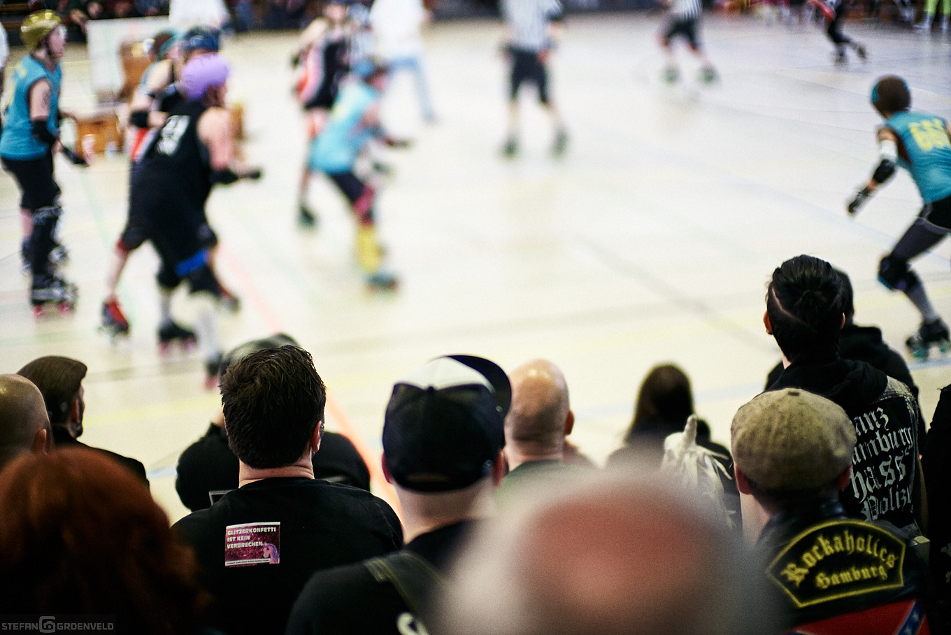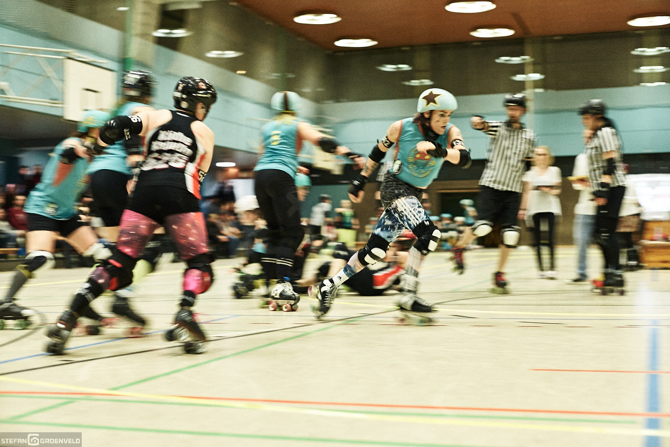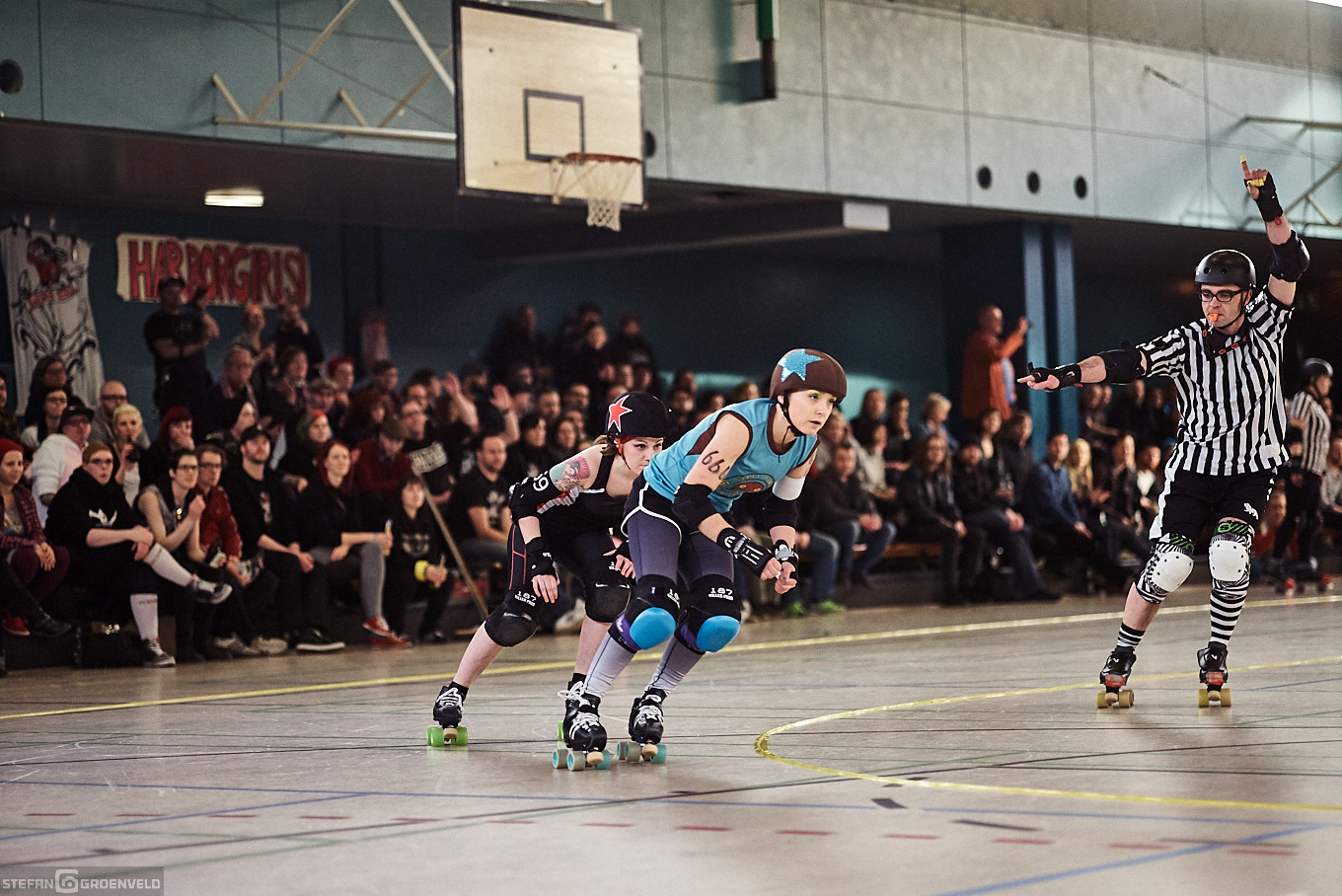 Um es kurz zu machen: gegen die internationalen Gäste hatten die Harbor Girls keine Chance. Beide Bouts gingen deutlich verloren. Das tat der guten Stimmung untereinander und auch in Reihen der Fans keinen Abbruch. Gekämpft wurde nämlich trotzdem mit harten Bandagen, aber fairen Mitteln. Ich habe mal wieder ein paar Bilder mitgebracht.