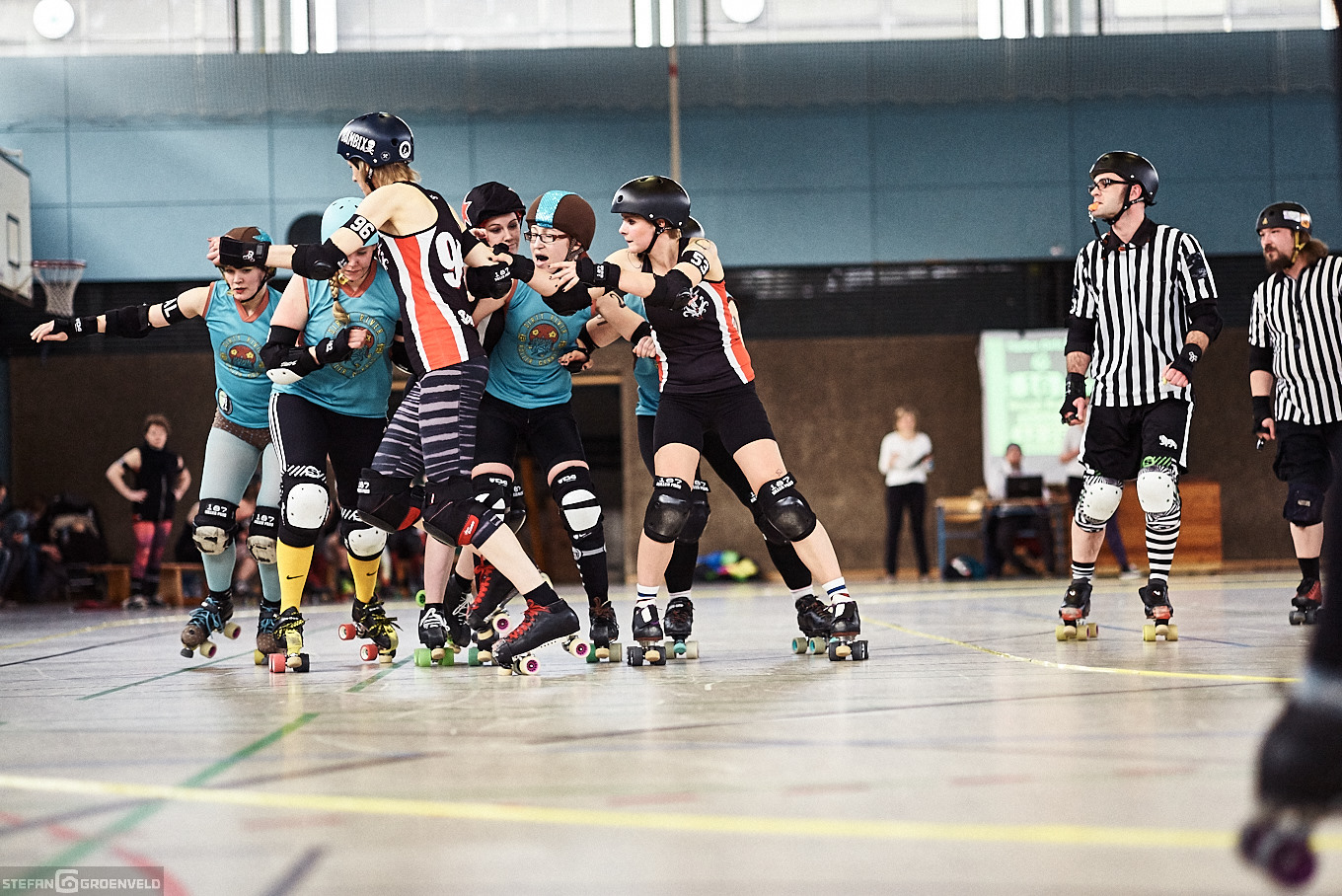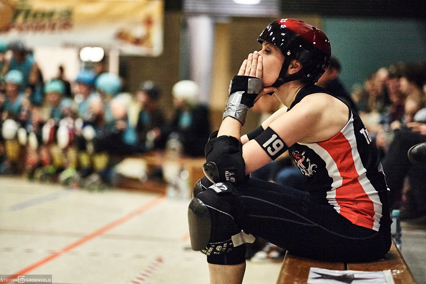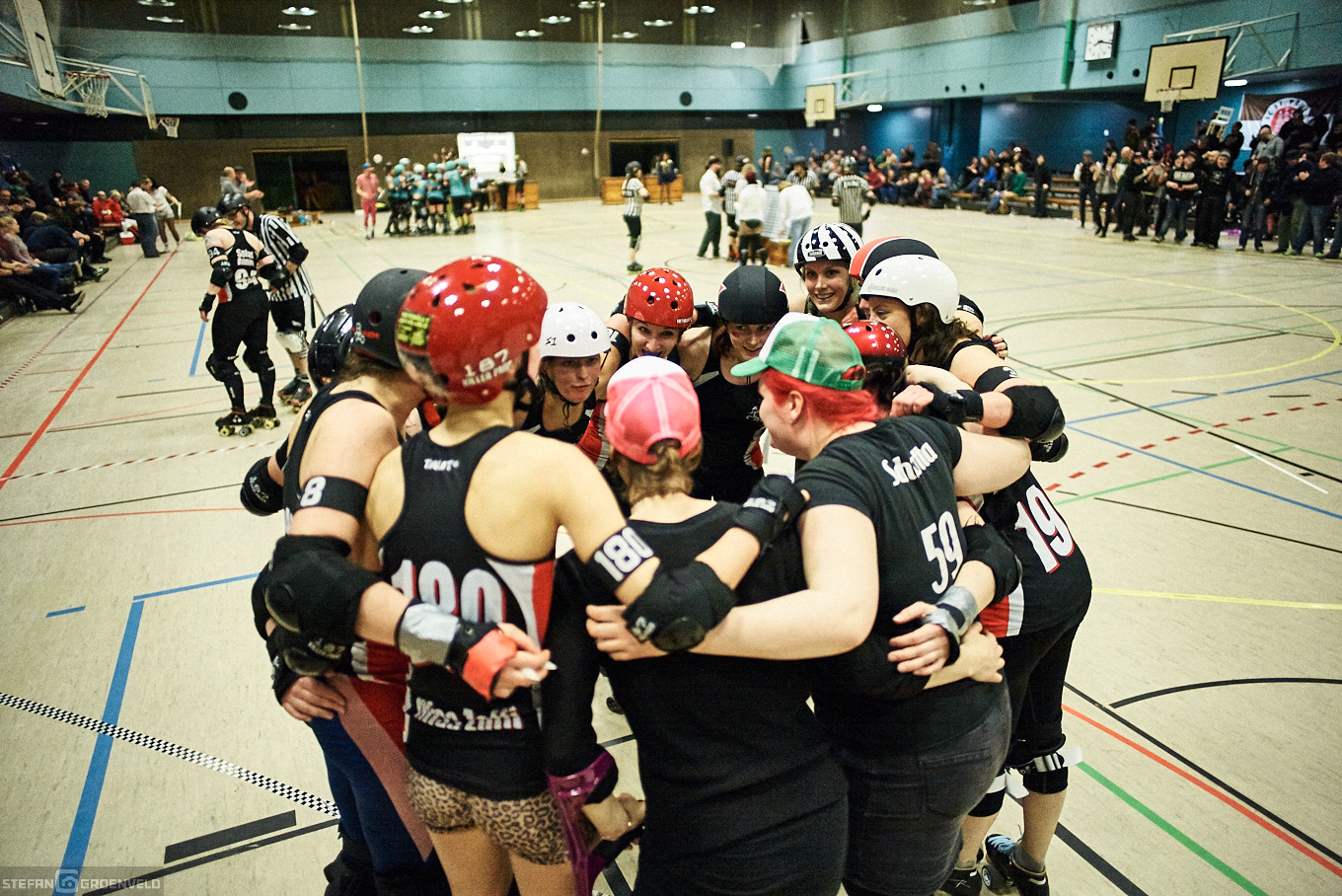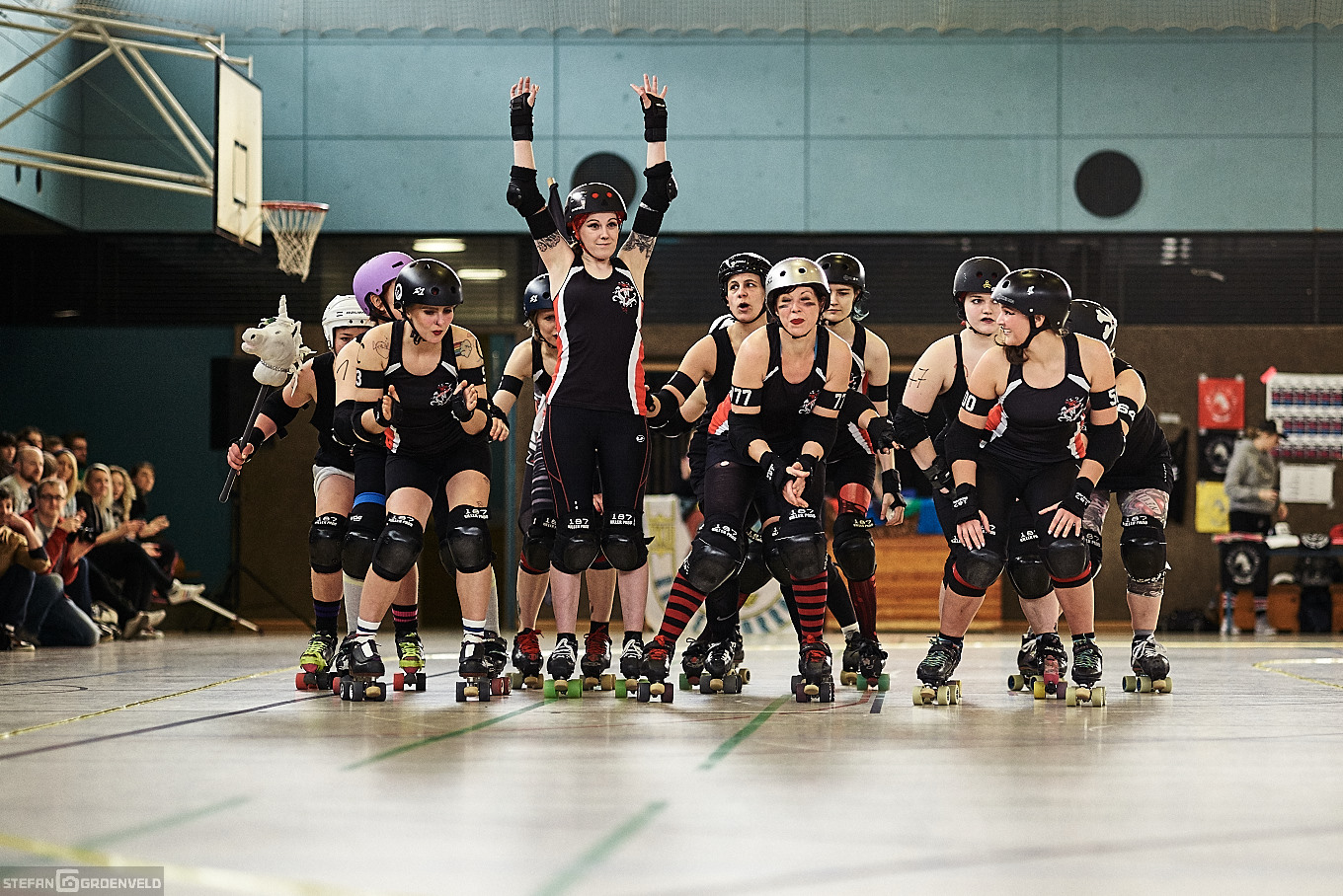 Um es kurz zu machen: gegen die internationalen Gäste hatten die Harbor Girls keine Chance. Beide Bouts gingen deutlich verloren. Das tat der guten Stimmung untereinander und auch in Reihen der Fans keinen Abbruch. Gekämpft wurde nämlich trotzdem mit harten Bandagen, aber fairen Mitteln. Ich habe mal wieder ein paar Bilder mitgebracht.