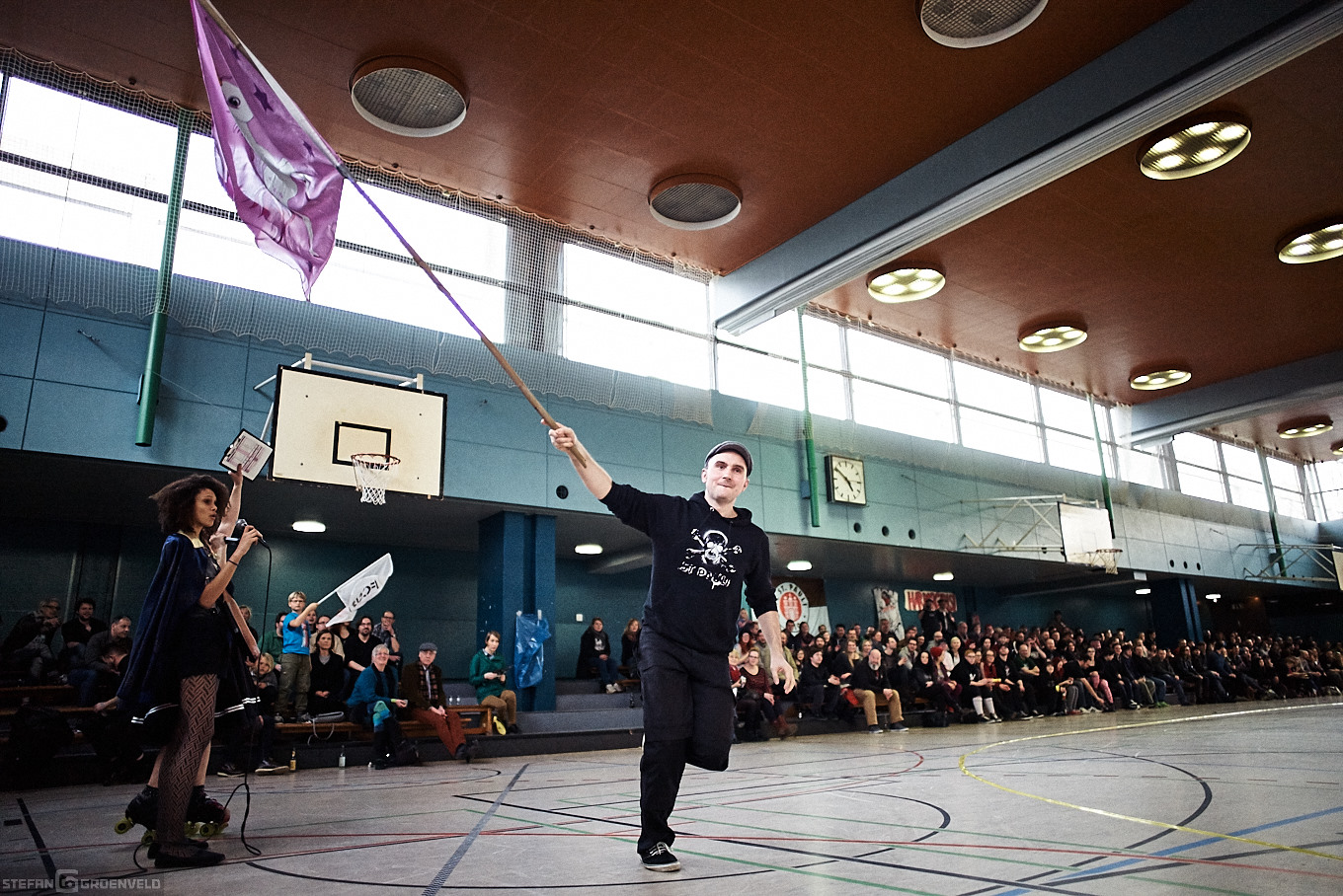 Ich hoffe, dir sind die beiden Stellen aufgefallen, an denen sich meine Überschrift in den Bildern widerspiegelt. Da in der Halle Pyrotechnik verboten ist, skandieren Fans beim Rollerderby gerne „Glitzerkonfetti ist kein Verbrechen“. Und das Einhorn ist schon fast so etwas wie ein Ersatzmaskottchen geworden. Diesmal sogar in Mannesgröße. Und das Glitzerkonfetti war auch nicht einfach nur Konfetti, sondern aufwändig hergestelltes echtes Glitzerkonfetti. Ich habe das anwesende Einhorn nicht gefragt, wie lange es für die Herstellung des Glitzerkonfettis benötigt hat. Ich bin mir nicht mehr sicher: kommt das beim Einhorn vorne oder hinten raus?
