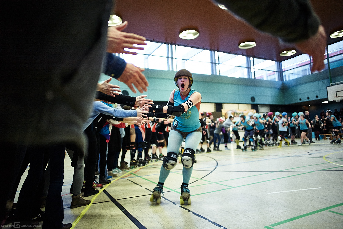 Zurück zum sportlichen Geschehen: die Blockarbeit der Packs werden immer besser. Die Jammer brauchen mittlerweile viel länger, um sich durch die Packs zu wühlen, um Punkte fürs Team zu holen. Im Harbor Girl A-Team fiel mir die geschickte Taktik von Knock ’n Rose auf, die sich mit Pirouetten fein aus der Affäre zog. Dafür gab es dann auch Szeneapplaus vom Publikum. Das Bout ging dann allerdings trotzdem 140:208 verloren. Die Finninnen hatten eine sehr starke Jammerin in ihren Reihen. Völlig zurecht inszenierte sie sich im Programmheft mit Molotow-Cocktail. So bewaffnet sprengte sie sich ein ums andere Mal den Weg durch das Hamburger Pack, egal mit welcher Taktik diese sich wehrten. Spannenderweise hatte die Jammerin die Nummer 1312 und hörte auf den wohlklingenden Namen ACABella. Gegen Spielerinnen mit solchen Namen verliert man auch mal gerne…