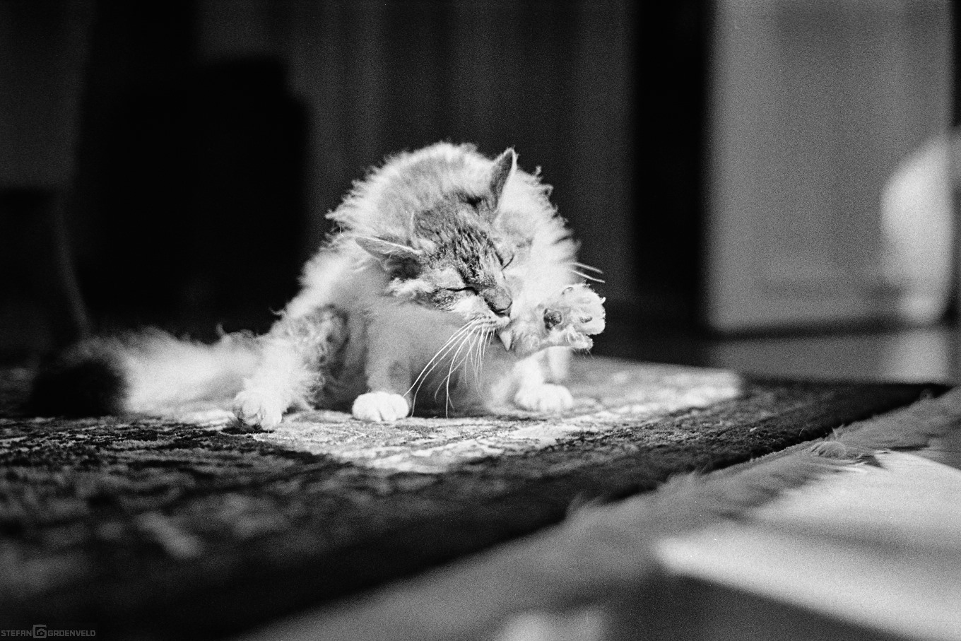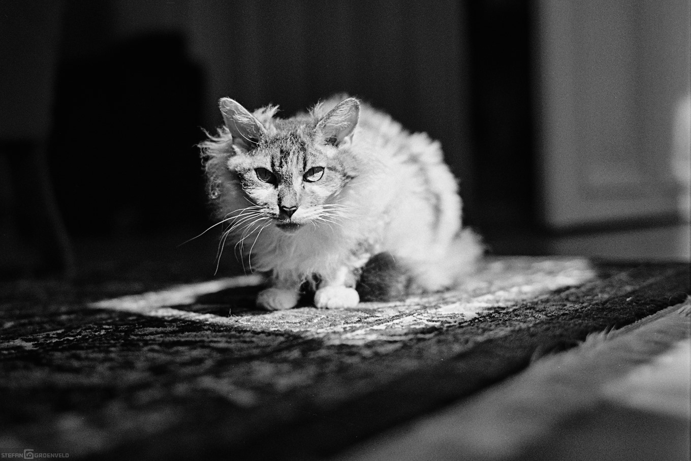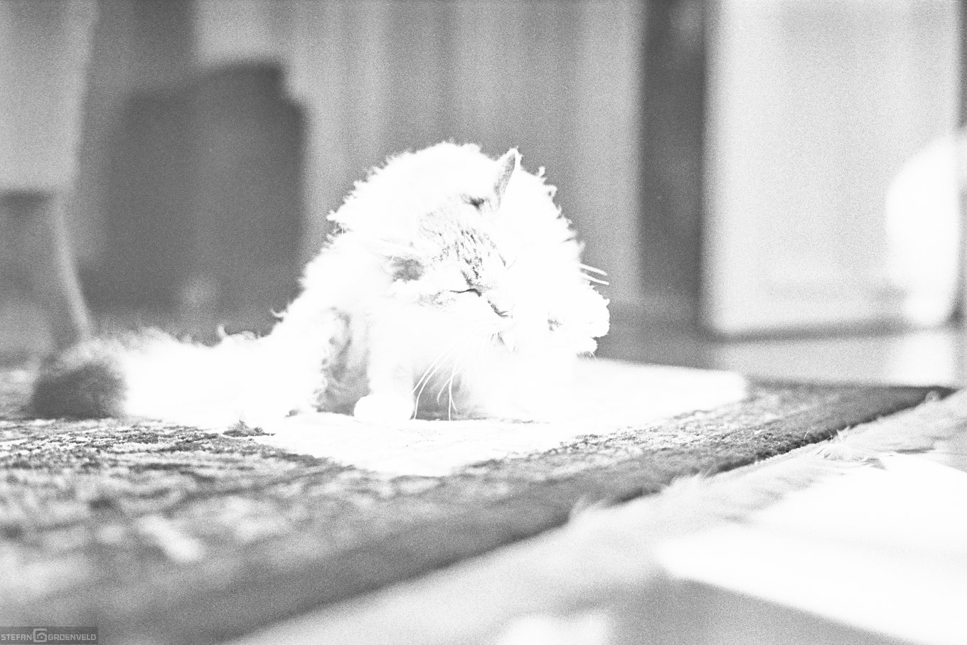 Ich weiß gar nicht, wie ich den so richtig mit einem Schlagwort beschreiben soll. Nach meinen bisherigen Erfahrungen wusste ich, dass die Filme mindestens einen ebenso großen Dynamikumfang darstellen können wie digitale Kameras. Aber wie funktioniert das im echten Leben? Wie viele Informationen sind in einem nicht optimal fotografierten Negativ enthalten? Glücklicherweise suchte sich eine meiner beiden Katzen einen schönen sonnigen Platz, der kaum größer als sie selbst war. Gelernt habe ich, dass ich auf die Schatten belichten sollte. Jeder, der regelmäßig mit digitalen Kameras arbeitet, wird nun zusammenzucken: Katze mit viel weissem Fell in der Sonne und ich belichte mit einem Handbelichtungsmesser den Schatten. Da kann ja nichts bei rauskommen…