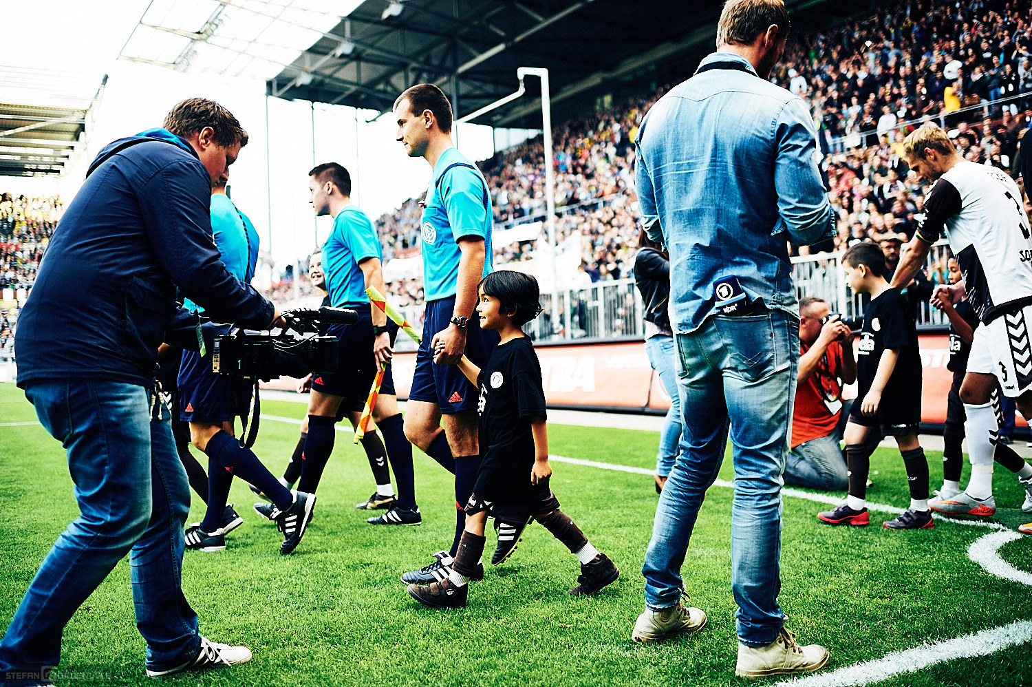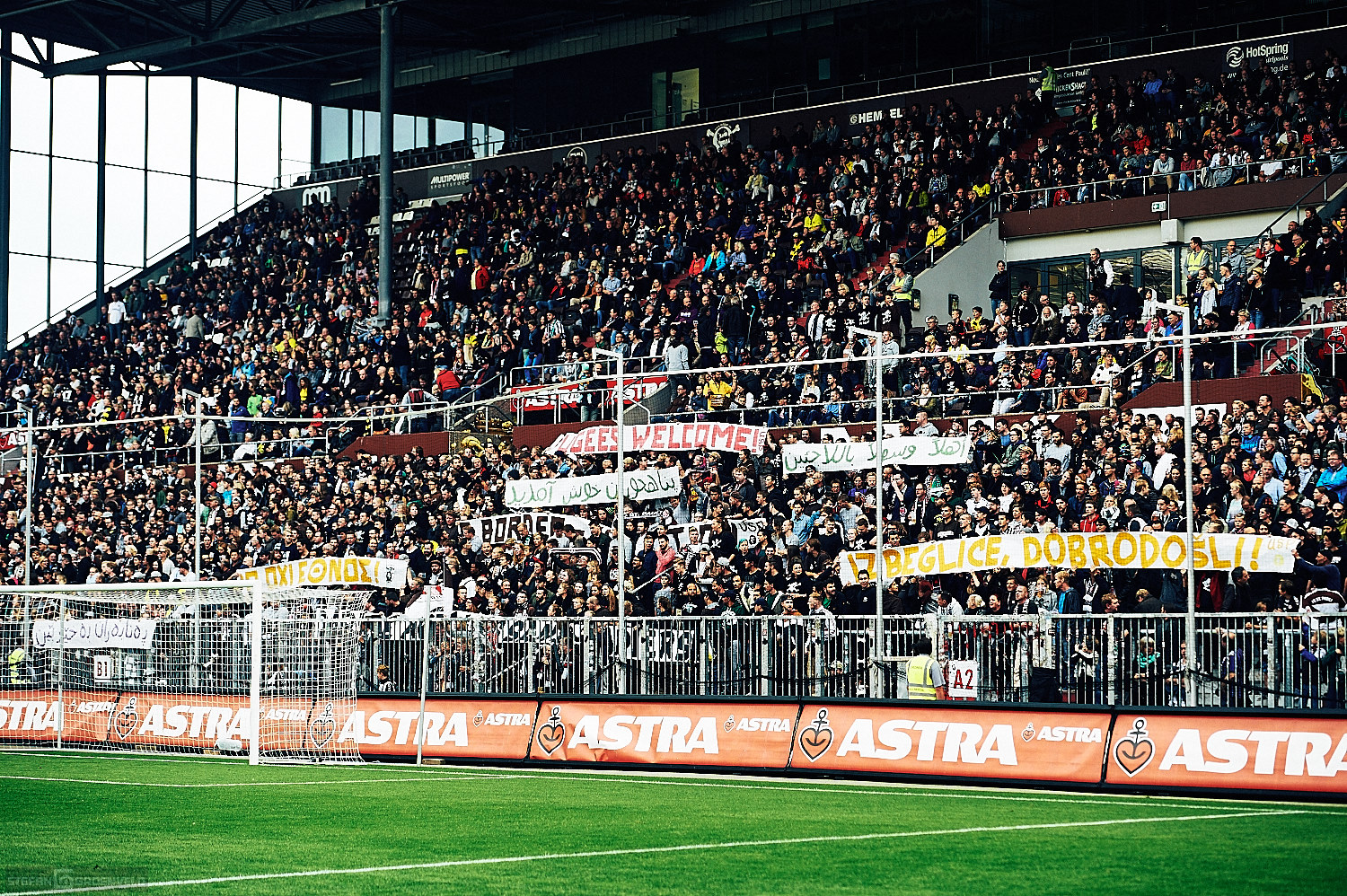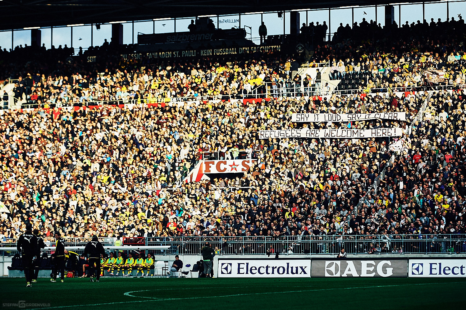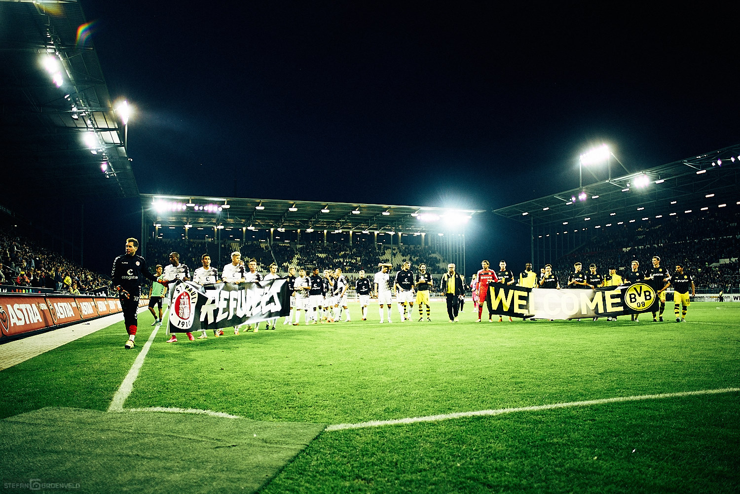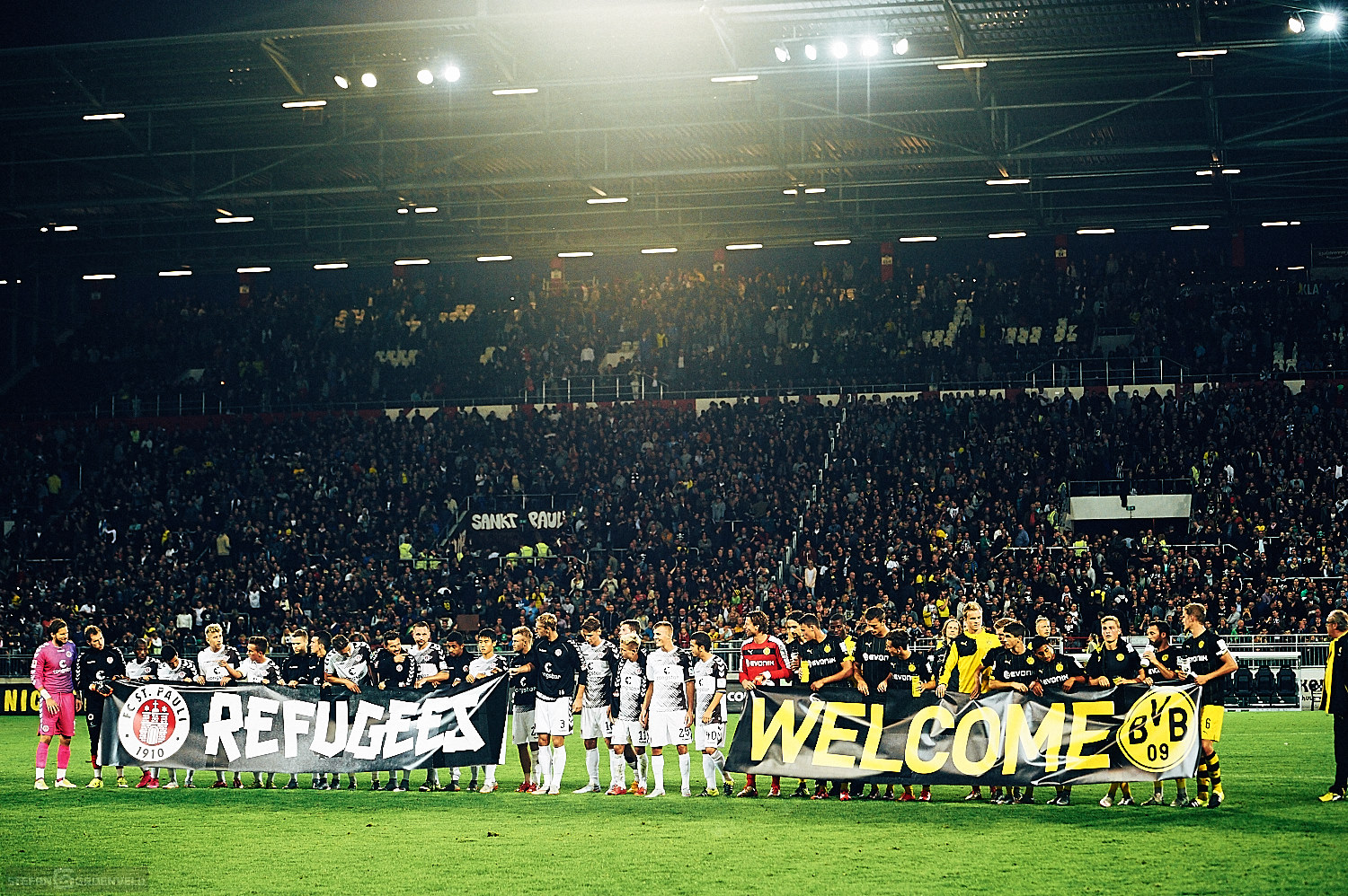 Das Fussballspiel FC St. Pauli gegen Borussia Dortmund war ein schmückendes Beiwerk zu einem wichtigen Signal: „Refugees welcome“. Wer aus seiner Heimat flüchten muss, ist willkommen in etwas temporärer Sicherheit. Und so leuchteten die Augen der Einlaufkinder gestern Abend heller als das Flutlicht. Schön, dass der Verein sowas möglich macht. Denn die Einlaufkinder waren Flüchtlinge aus dem Erstaufnahmelager in den Messehallen. Obwohl ich mich sehr für diese Kinder freue, möchte ich kurz darauf verweisen, dass eigentlich andere Kinder diese Plätze hatten. Auch Flüchtlinge. Aber diese wurden zum Großteil am Wochenende Hals über Kopf von den zuständigen Behörden in andere Einrichtungen außerhalb Hamburgs verfrachtet. Gerade ein wenig eingewöhnt und zur Ruhe gekommen, wirst du auch schon wieder weggeschickt. Auch wenn ich gerne positiv erwähne, dass Hamburg ein Vielfaches der nach dem sogenannten Königsteiner Schlüssel notwendigen Flüchtlinge aufgenommen hat (ich glaube aktuell 5 mal so viel) ist ein menschenwürdiger Umgang mit diesen Menschen absolut geboten. Anhand der überragend vielen Freiwilligen kann die Stadt ja sehen, dass das möglich ist. Überhaupt glaube ich, dass die Menschen aktuell weiter im Umgang mit den Menschen aus anderen Ländern sind, als das die Politik ist. (Der NDR bestärkt mich in meinem Eindruck.)