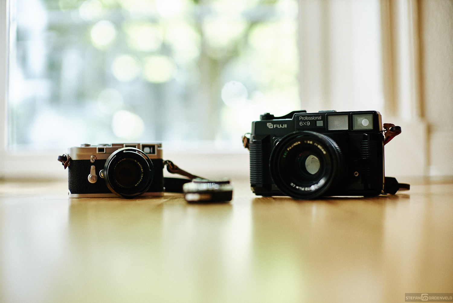 Da die GW690 kein Wechselobjektiv ermöglicht könnte man sie auch als eine Fuji X100 auf Steroiden bezeichnen. Der Unterschied wird durch die verwendeten Objektive deutlich: das 23mm Objektiv bei der beliebten X100(S/T) hat nämlich nur einen geringfügig größeren Blickwinkel als das 90mm Objektiv an der GW690. Die Offenblende von 3.5 benötigt viel Licht, entspricht im Schärfenbereich (andere schreiben Schärfentiefe oder Tiefenschärfe) einer 1.7er Optik im Kleinbildformat. Der Zentralverschluß ermöglicht Blitzen auch mit der kürzesten Belichtungszeit von 1/500s.