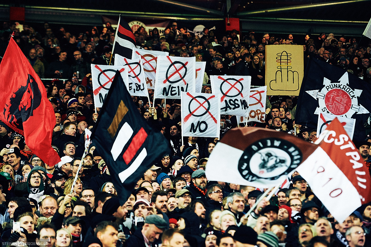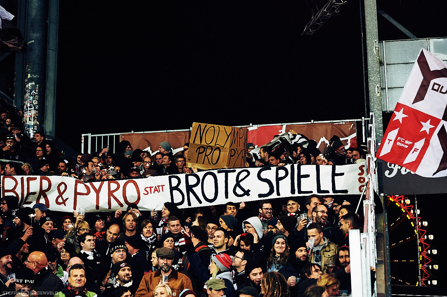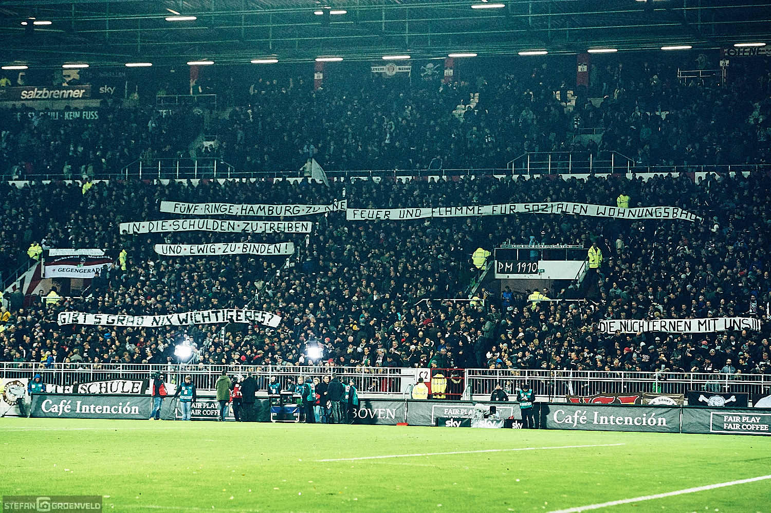 Einig waren sich alle vier Stadionseiten bei der Meinung zu Olympia. Zumindest konnte man auf allen Tribünen entsprechende, ablehnende Transparente erkennen. Der mit Ringen in olympischen Farben symbolisierte Fastringfinger hat mir persönlich am Besten gefallen. Das war grafisch mal was anderes. Entsprechende Transpis begleitete die Musik von den Boomtown Rats in der Halbzeit. „I don’t like Monday“ schallte es aus den Boxen. Ja, die Anstosszeiten sind doof – an das Ergebnis kann ich mich allerdings problemlos gewöhnen. Wenn es eine Garantie darauf gäbe, würde ich auch mit Montagabendspielen leben können. Nächstes Mal kann ja wieder jemand anders treffen…