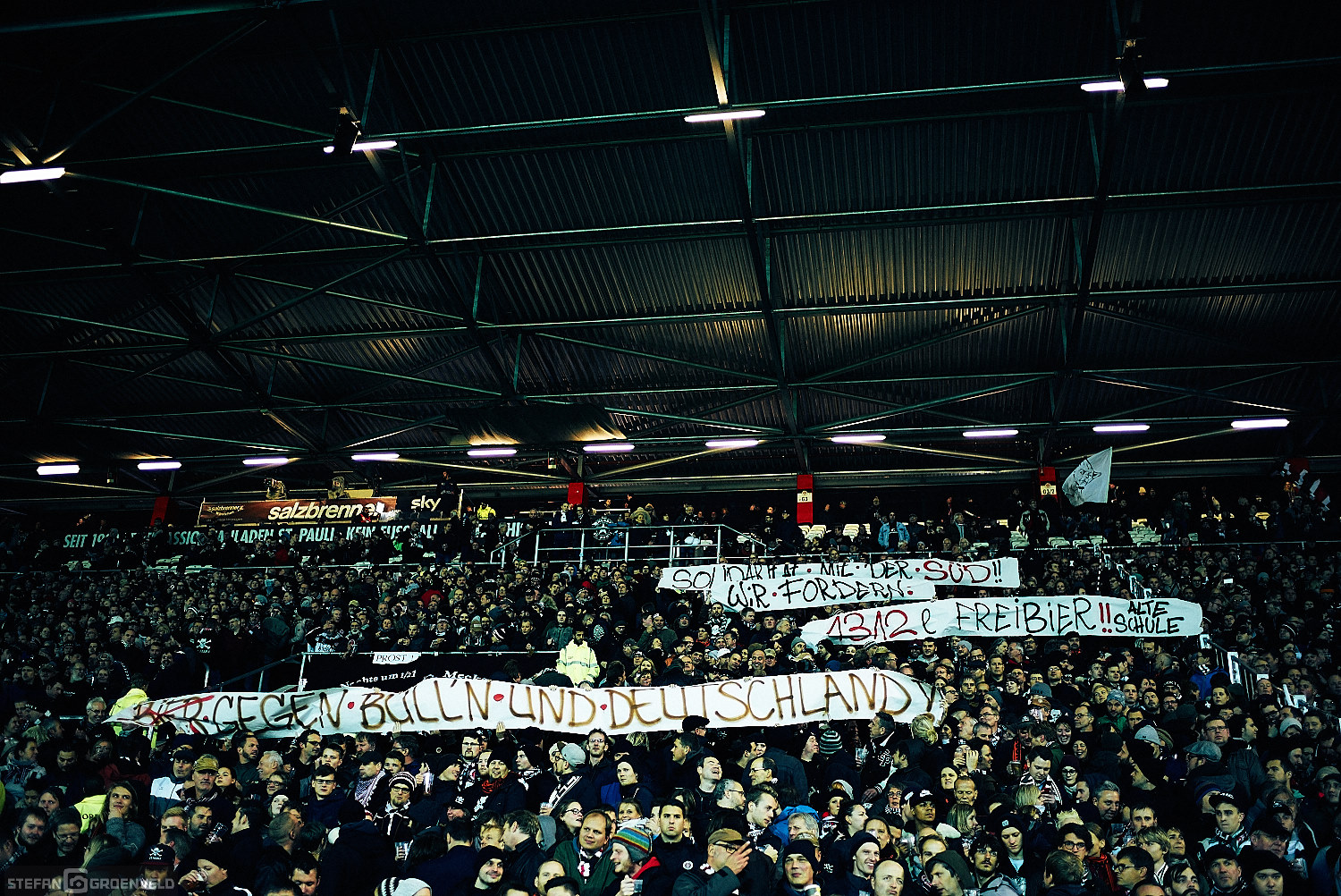 Ansonsten gab es rund um das Spiel sicherlich mehr Geschichten als zum Spiel. Die Süd konterte das Bierausschankverbot nach der letzten geilen Choreo mit Konterbier ..äh.. Freibier. Während sich die Gegengerade solidarisch zeigte und „1312 Liter Bier gegen Bullen und Deutschland“ forderte, hatte ich das Gefühl, dass diesmal besonders viel auf der Süd gekifft wurde. Vielleicht lag es aber auch nur am berauschenden Spiel der Jungs in braun und weiß. Wieviel Scorerpunkte hat eigentlich Ziereis schon auf dem Konto? Aber ich schweife ab.