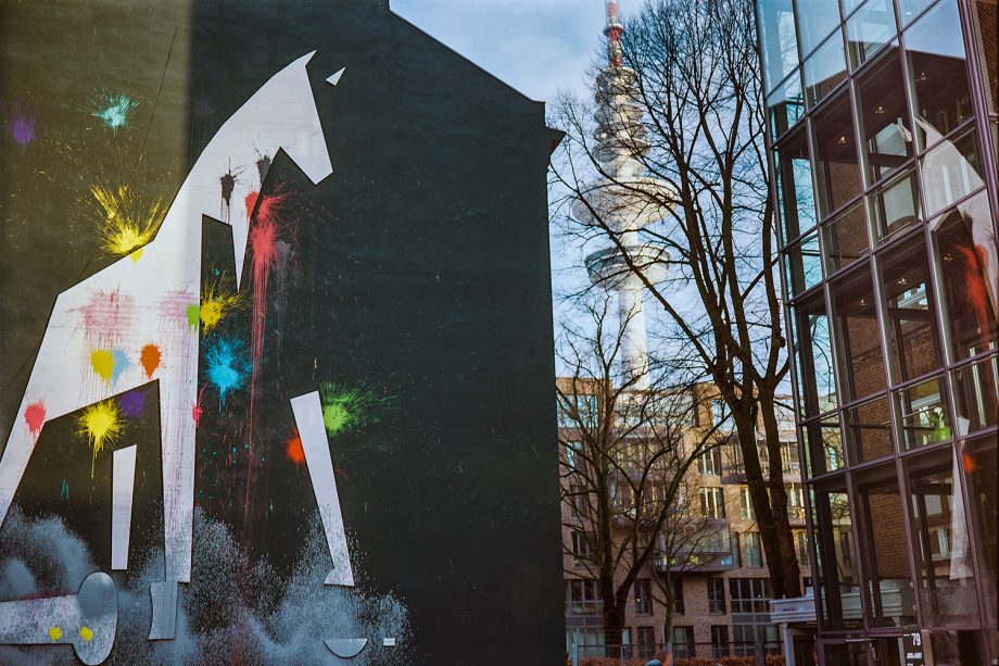 This sunny morning I just wanted to take a picture of the Heinrich-Hertz-Tower, when I saw the colorful backyard with maybe the honest symbol an advertising agency can have painted on their walls.