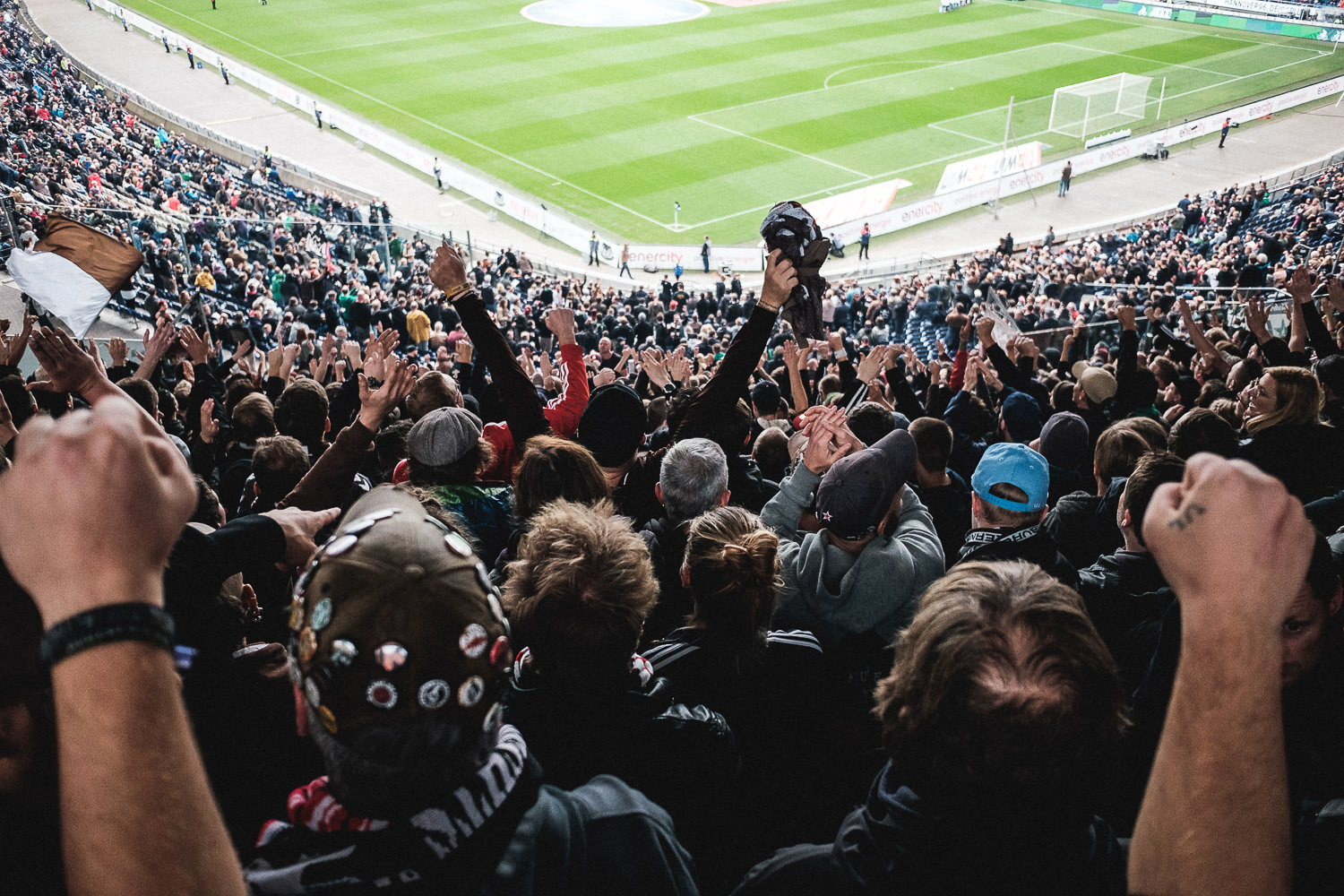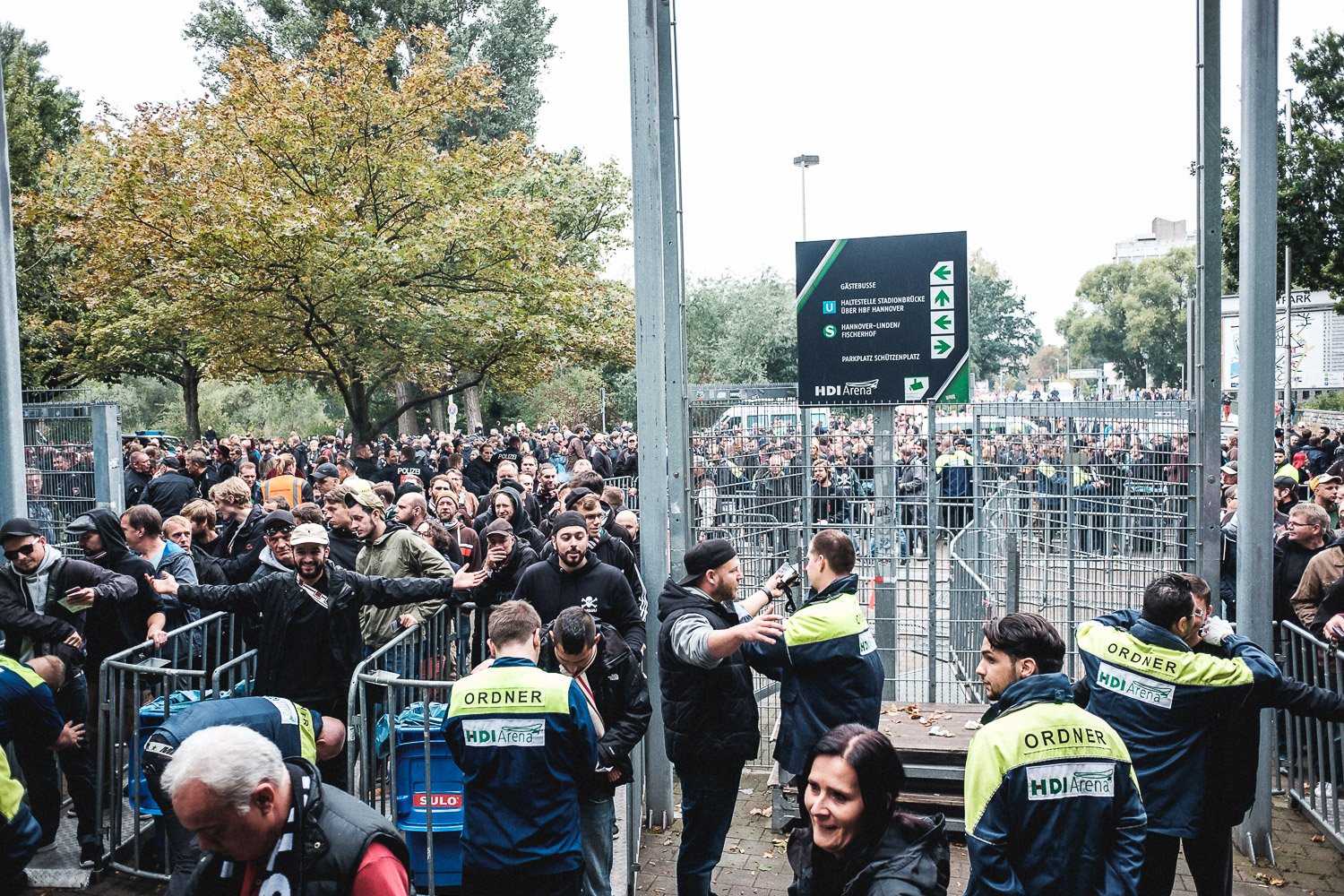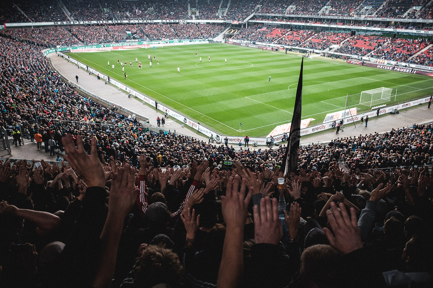 Verlängertes Wochenende und ein Auswärtsspiel in der Nähe mit halbwegs humaner Anstosszeit plus Sonderzugfahrt mit dem Reisebüro Fanladen – klar, dass ich da nicht nein sagen konnte. Ich hatte aber ehrlicherweise keine Lust, in Hannover unten am Rasen zu fotografieren. Also bin ich einfach so mitgekommen, ohne Schlepperei mit schwerer Ausrüstung und dafür mit viel Spaß mit meinem und anderen Fanclubs. Aber ohne Kamera kann ich natürlich auch nicht aus dem Haus. Leider sind als Zuschauer in Hannover keine Kameras mit Wechselobjektive zugelassen und das hat die Auswahl meiner mitnahmefähigen Kameras auf ganze 2 minimiert. Und als ich dann am Vorabend meine kürzlich noch gut funktionierende Nikon Ti35 mit einem 1997 abgelaufenen Film beladen wollte, tat sie auch mit frischen Batterien keinen Mucks. Deswegen gibt es heute digitales zu sehen, mit dem Vorteil, dass es eben jetzt schon Bilder gibt – und mich danach nicht mehr über den Besuch in Hannover aufregen muss.
