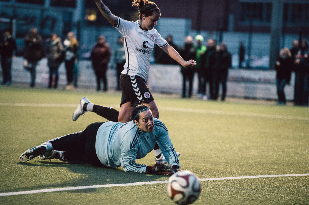 Das Spiel selbst startete kampfbetont mit mehr Schüssen Richtung braun-weisses Tor durch den HSV als umgekehrt. Es dauerte bis zur 30. Minute, bis die Frauen im braun-weißem Dress das erste Mal gefährlich vor dem Tor der HSVerinnen auftauchte. Es spricht für dieses starke St. Pauli Team, dass der gefühlt zweite Torschuss dann schon zum Erfolg führte. Nina Philipp sorgte mal wieder zum wichtigen 1:0.