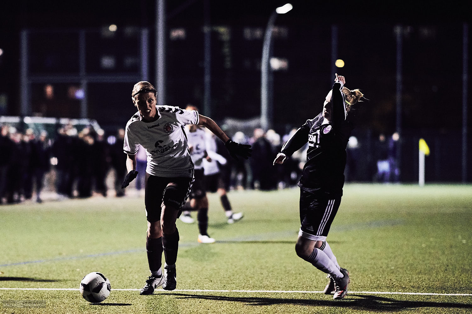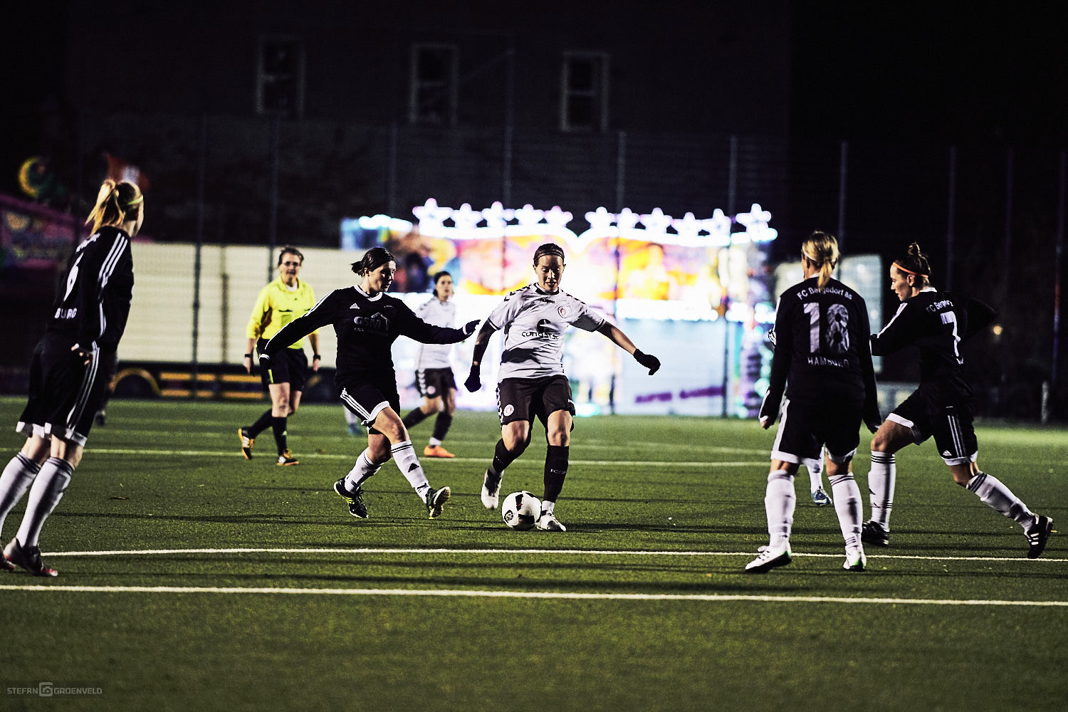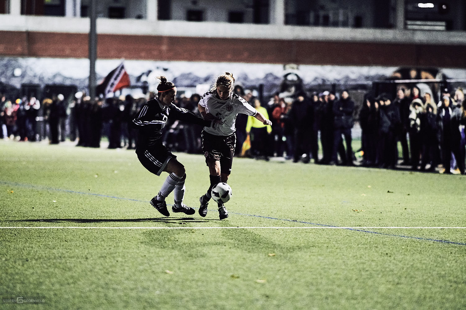 FC St. Pauli machte weiter Druck, zwang durch frühes Pressing Bergedorf zu Fehlern und AnSo Greifenberg nutze einen solchen konsequent: überlegt schaute sie sich die Ecke aus und schoss souverän zum 2:0 ein. Damit ging es in die Halbzeit. Glühweinduft schob sich in meine Nase, aber bei den eiskalten Temperaturen wollte ich erst nach getaner Arbeit Alkohol zu mir nehmen. Ein Fehler, wie sich herausstellte, denn in der zweiten Halbzeit zog es vor den noch fehlenden Dom-Aufbauten empfindlich und vor meiner Linse passierte die ersten 20 Minuten auch nichts mehr. Bergedorf hatte den Pokalfight angenommen und wollte nicht erstmals geschlagen aus dieser Begegnung gehen. Genau nach 20 Minuten sprang aber ein Freistoß der braun-weißen vor das Tor von Bergedorf, konnte nicht klar von deren Abwehr geklärt werden und der Ball fiel AnSo am 5-Meter-Raum vor die Füße. Eine solche Chance läßt sie sich nicht entgehen und entschied das Spiel mit ihrem zweiten Tor zum 3:0.