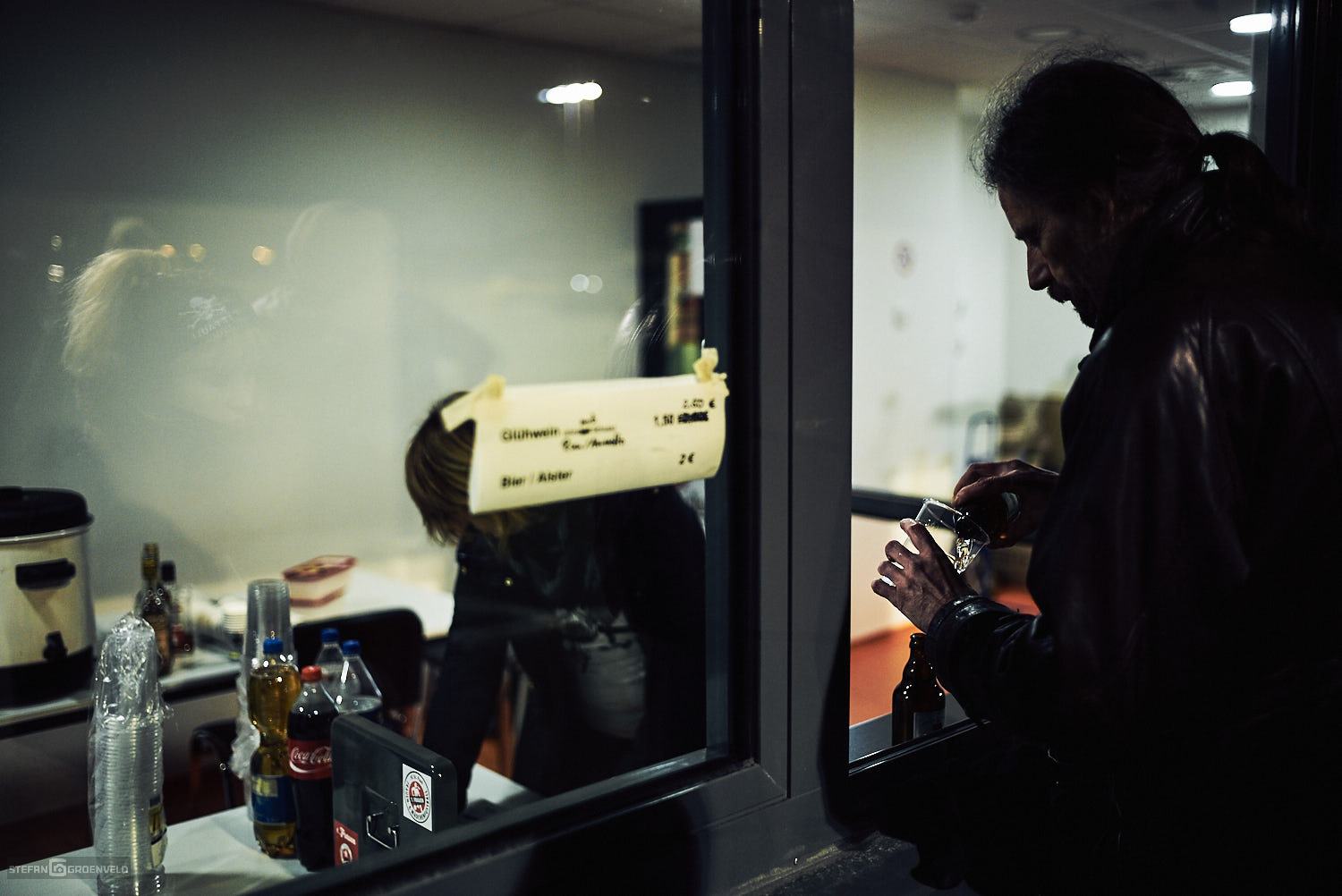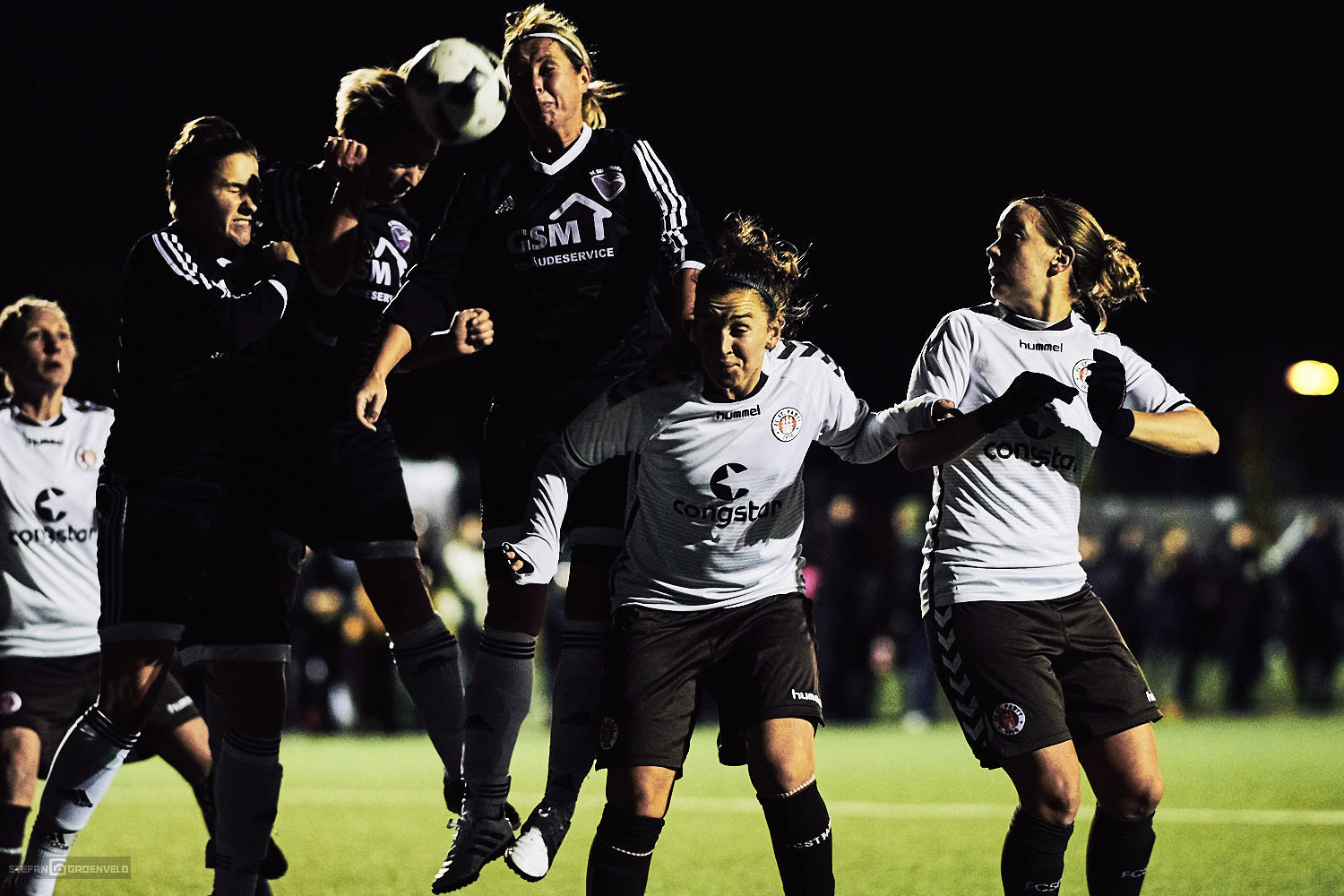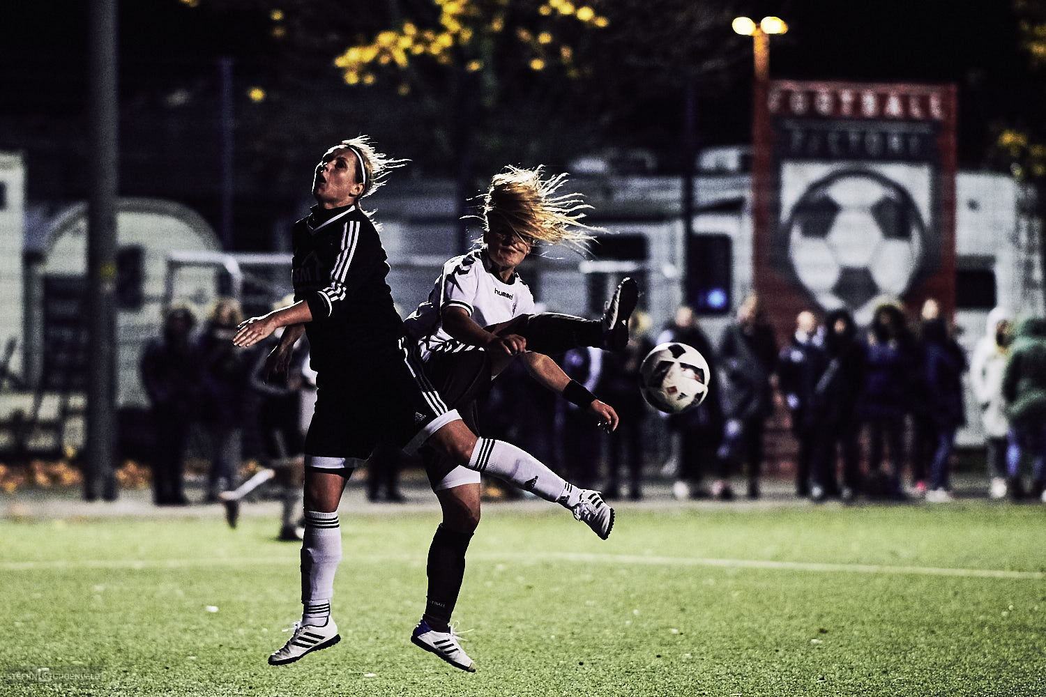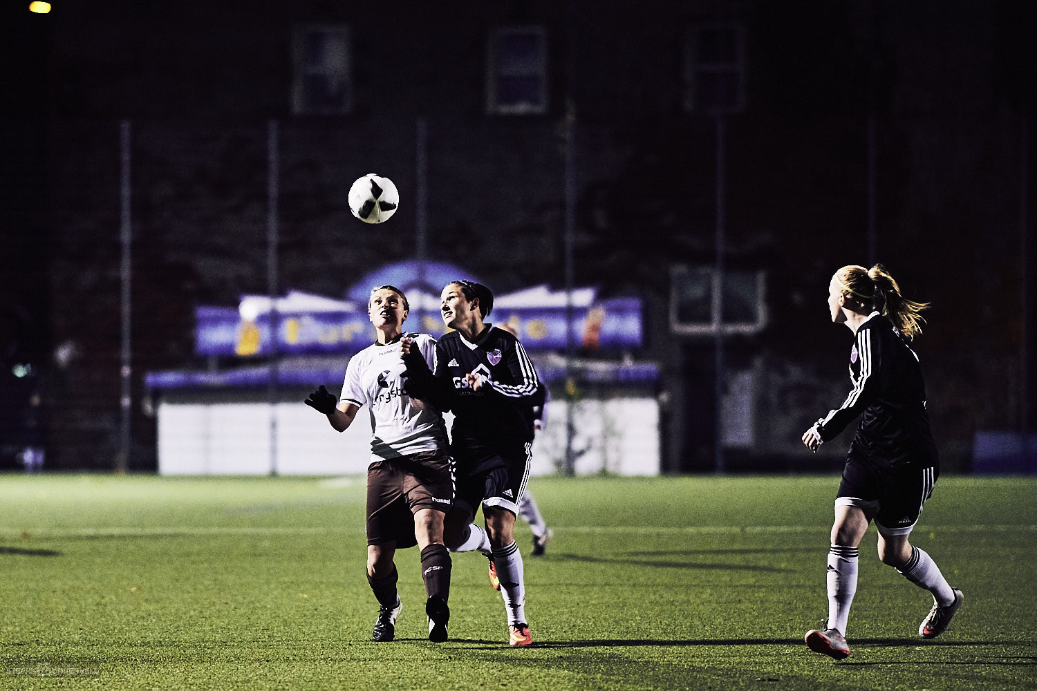 FC St. Pauli machte weiter Druck, zwang durch frühes Pressing Bergedorf zu Fehlern und AnSo Greifenberg nutze einen solchen konsequent: überlegt schaute sie sich die Ecke aus und schoss souverän zum 2:0 ein. Damit ging es in die Halbzeit. Glühweinduft schob sich in meine Nase, aber bei den eiskalten Temperaturen wollte ich erst nach getaner Arbeit Alkohol zu mir nehmen. Ein Fehler, wie sich herausstellte, denn in der zweiten Halbzeit zog es vor den noch fehlenden Dom-Aufbauten empfindlich und vor meiner Linse passierte die ersten 20 Minuten auch nichts mehr. Bergedorf hatte den Pokalfight angenommen und wollte nicht erstmals geschlagen aus dieser Begegnung gehen. Genau nach 20 Minuten sprang aber ein Freistoß der braun-weißen vor das Tor von Bergedorf, konnte nicht klar von deren Abwehr geklärt werden und der Ball fiel AnSo am 5-Meter-Raum vor die Füße. Eine solche Chance läßt sie sich nicht entgehen und entschied das Spiel mit ihrem zweiten Tor zum 3:0.