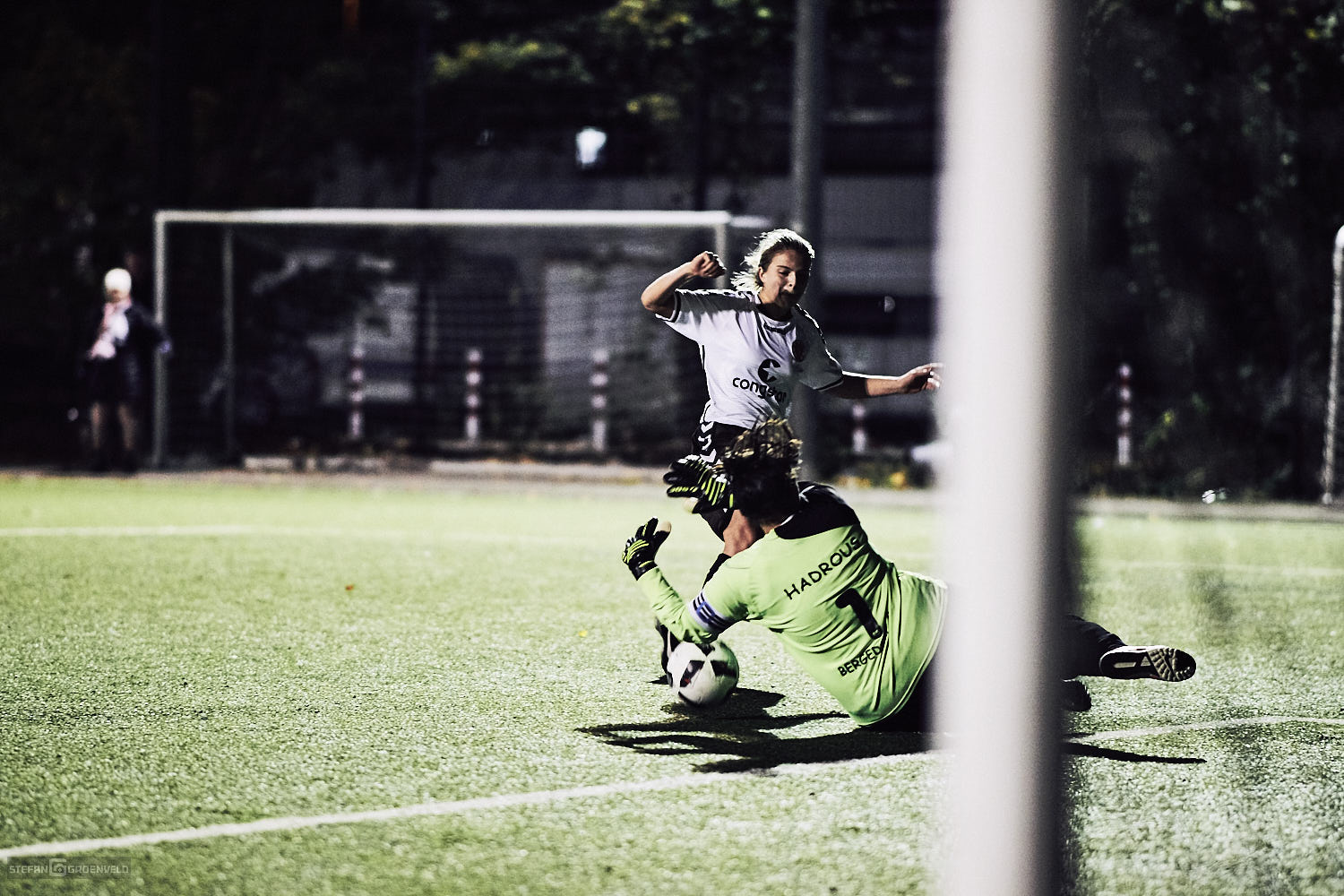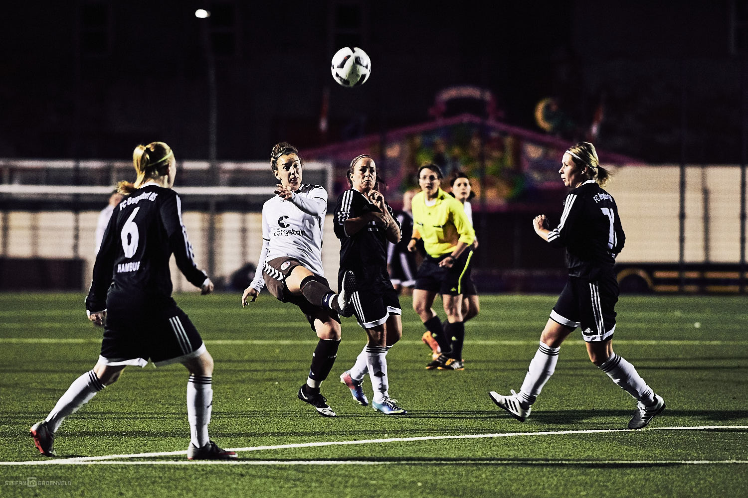 Der Pokal hat seine eigenen Gesetze. Gestern Abend beim Spiel FC St. Pauli gegen Bergedorf 85 allerdings nicht. Oder doch? Die Wiederholung des Pokalfinales der letzten Saison war ein tolles, rasantes Fussballspiel mit gutem Kombinationspassspiel und frühem Pressing. Während das letzte Spiel der beiden Teams gegeneinander allerdings eine klare Sache für Bergedorf war, konnte diesmal das Team in braun-weiß überzeugen. Allein der sehr guten Torhüterin von Bergedorf Hadrous war es zu verdanken, dass es nicht schon 3:0 stand als Carlotta Kuhnert sehr frei vor ihrem Tor stehend zum 1:0 einschieben konnte. Ob das Abseits war? Das konnte ich hinter dem Tor nicht entscheiden, die Linienrichterin ließ ihre Fahne allerdings unten – sie war aber auch nicht immer auf Ballhöhe. Egal, der Treffer zählte.