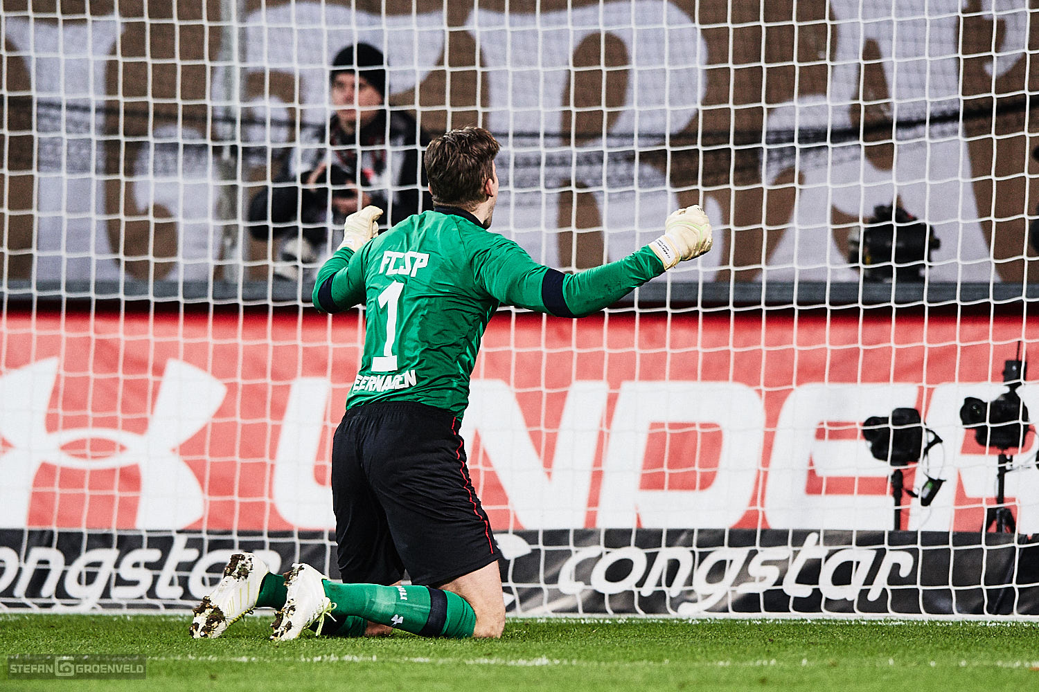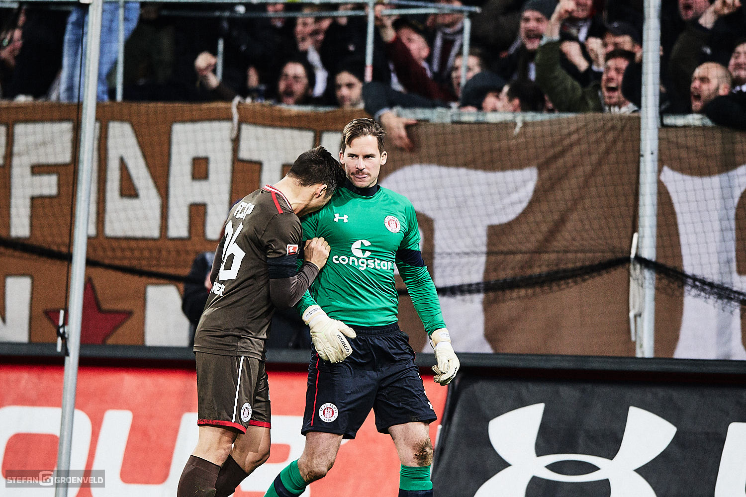 Zumindest letzte Frage kann ich eindeutig beantworten: Heerwagen hält den Kasten sauber! Und das war wirklich ein Fortschritt: wie eigentlich immer scheint der Gegner trotz spielerischer Überlegenheit der Jungs in braun und weiß mit der ersten nennenswerten Torchance zum Erfolg zu kommen. Ich schüttelte von weit weg schon den Kopf, als ich den Pfiff und die Geste vom Schiedsrichter sah. Erst als Himmelmann verletzt runter musste, spürte ich Hoffnung – denn natürlich verunsichert die lange Wartezeit bis zum Elfmeterschuss jeden Schützen. Also rannte ich bis in die Hälfte von St. Pauli, um den gehaltenen Elfmeter zu fotografieren. Hat ja auch geklappt 🙂