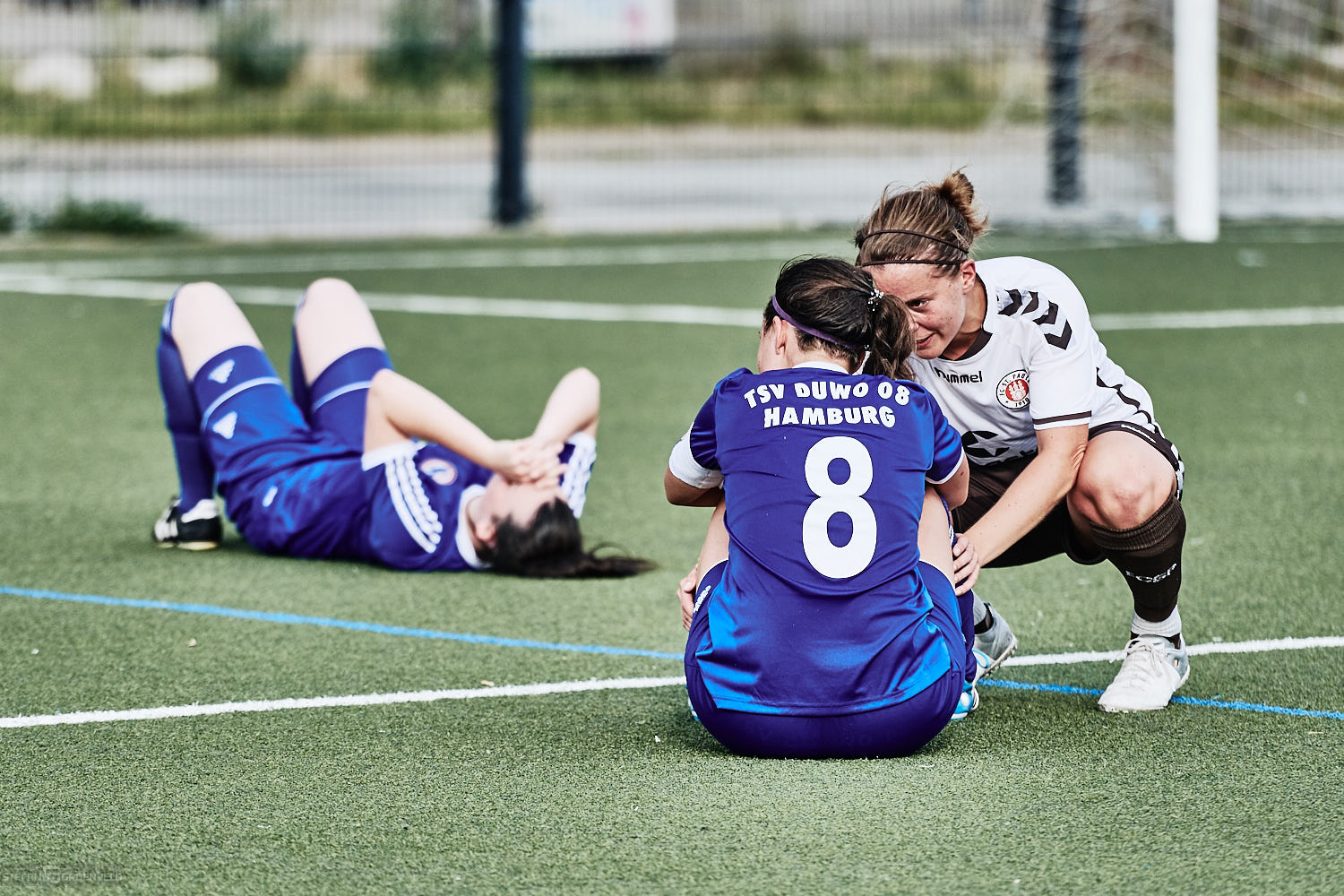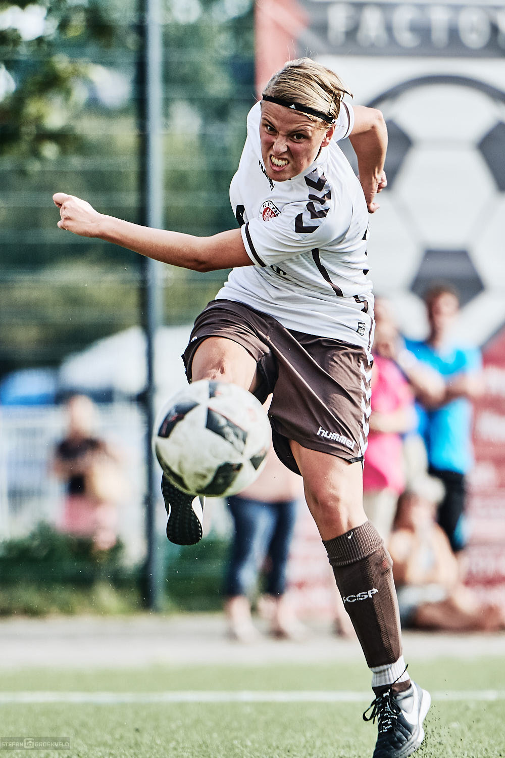 In der zweiten Halbzeit spielten die 1. Frauen vom FC St. Pauli deutlich strukturierter, mussten aber erst mal in der 50. Minute nach tollem Konter von Duwo und sehr unglücklichem Stellungsspiel von St. Pauli das 1:3 hinnehmen. Wieder so eine psychologisch ungünstige Situation. FC St. Pauli ließ sich aber nicht aus der Ruhe bringen und verzückten die rund 200 Zuschauer am Seitenrand mit druckvollem Spiel. Irgendwann wurde der Druck für Duwo 08 zu stark und auch deren Abwehrreihen machten Fehler. In der 78. Minute war es soweit: ein Eigentor bescherte dem FC St. Pauli den Anschlußtreffer.