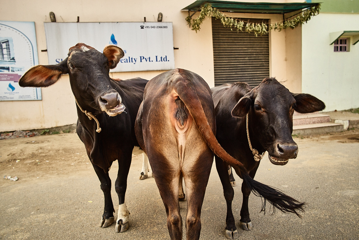 Varanasi ist eine der heiligsten Städte der Hindus, die in der Stadt rund Zweidrittel der Bevölkerung stellen. Schon auf der Taxifahrt hatte ich eine wichtige Lektion über Indien gelernt: Urteile nicht. Sicherlich erzähle ich dir nichts neues, dass Kühe den Hindus heilig sind. Sie sind im Stadtbild völlig normal. Während der Taxifahrt überholten wir ein Lastenfahrrad mit auf der Ladefläche festgezurrten 5 oder 6 junge Kälbchen. „Das ist ein Moslem“, sagte der Taxifahrer, „die essen die.“ So einfach kann Zusammenleben sein.