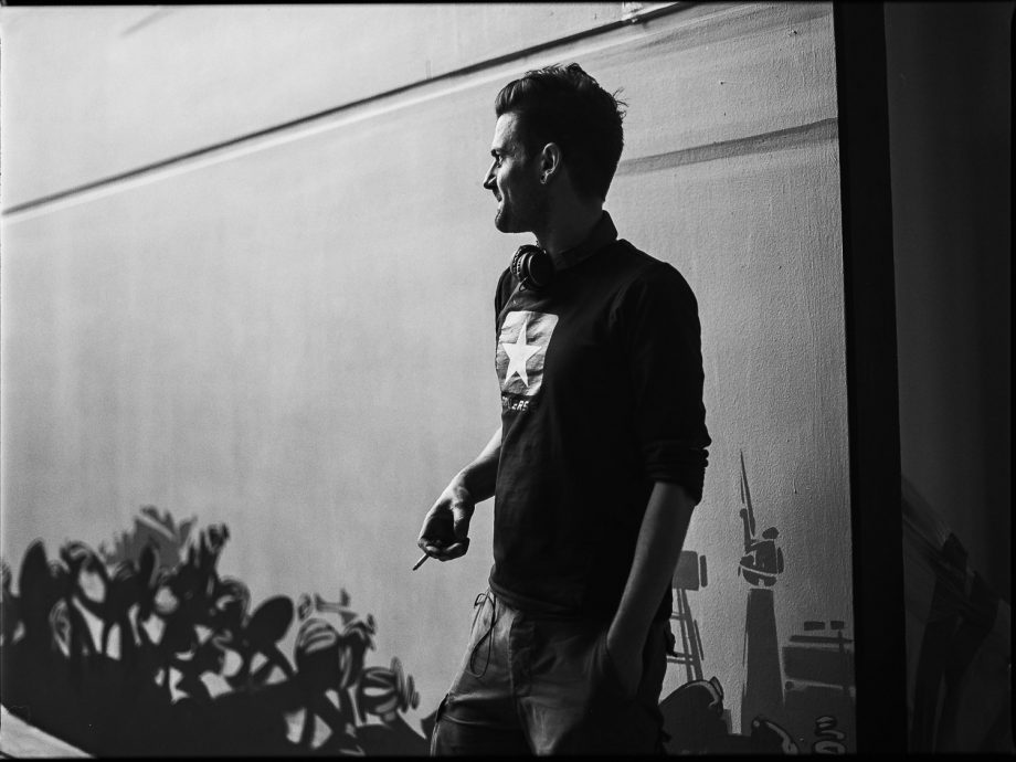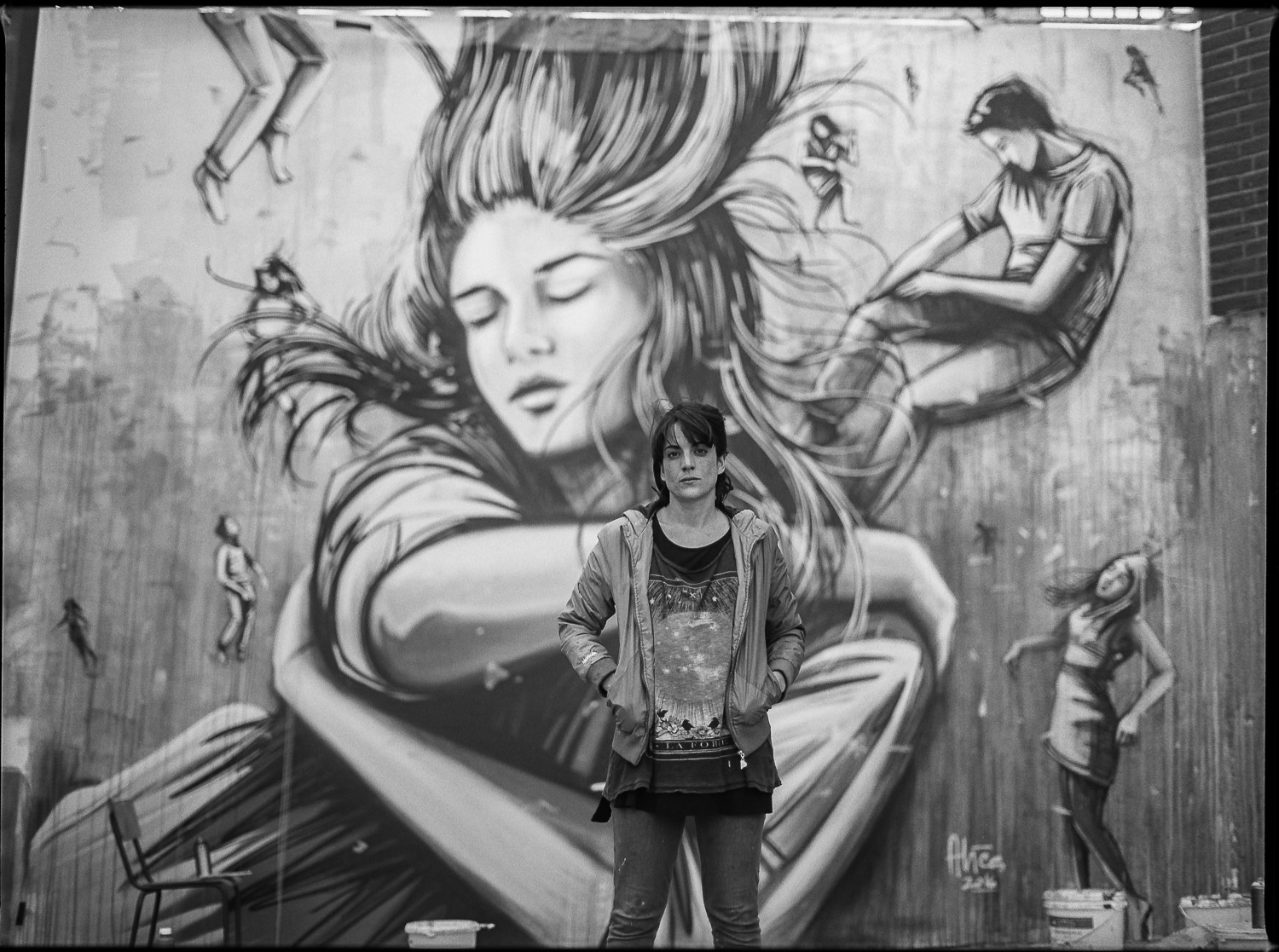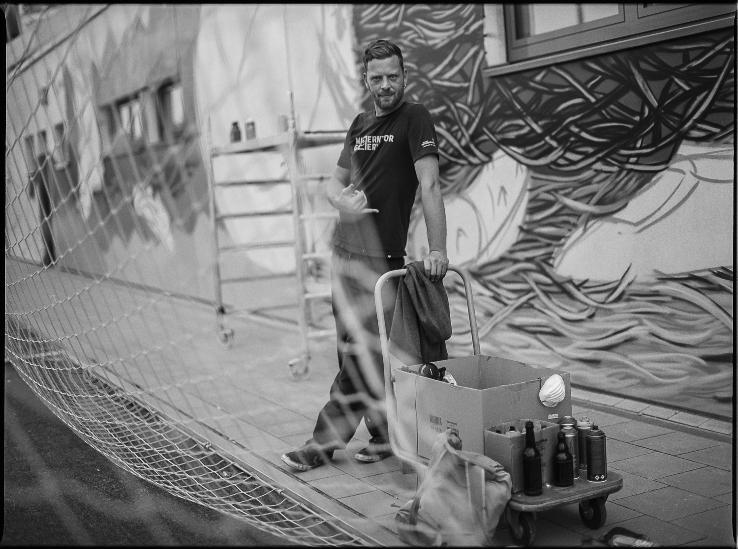 Während der Aufbauphase der Millerntor Gallery #6 bin ich auch mit meiner Mamiya 645 und dem 80/1.9 (aka „Mittelformat-Noctilux“) umhergelaufen und konnte den ein oder anderen Künstler für ein schnelles Portrait überzeugen. Die meisten waren allerdings zu sehr im Stress oder in der Kreativität, dass ich nicht stören wollte und daher erst gar nicht gefragt habe.