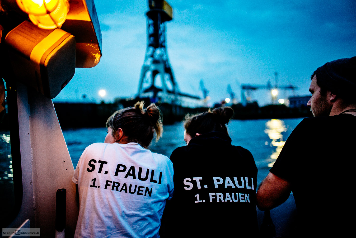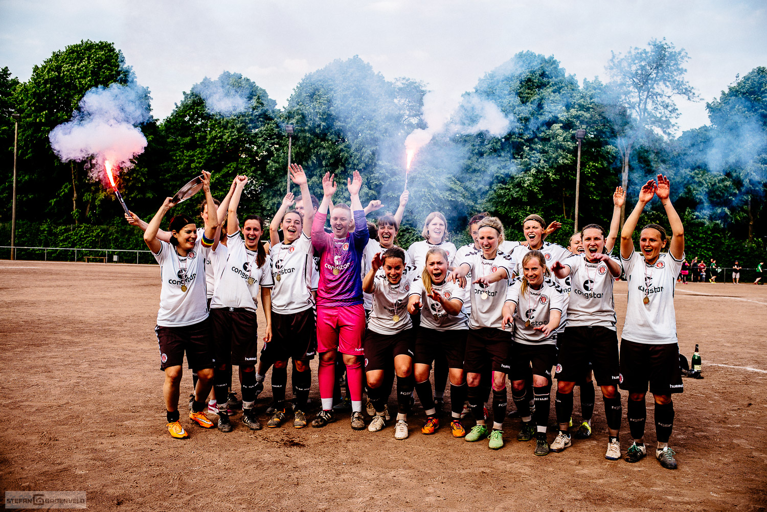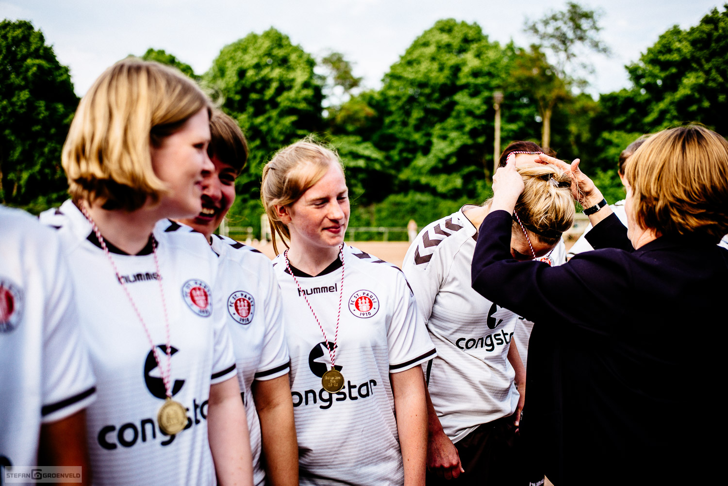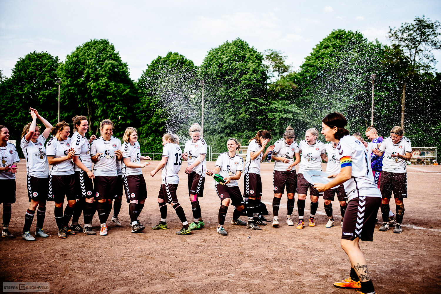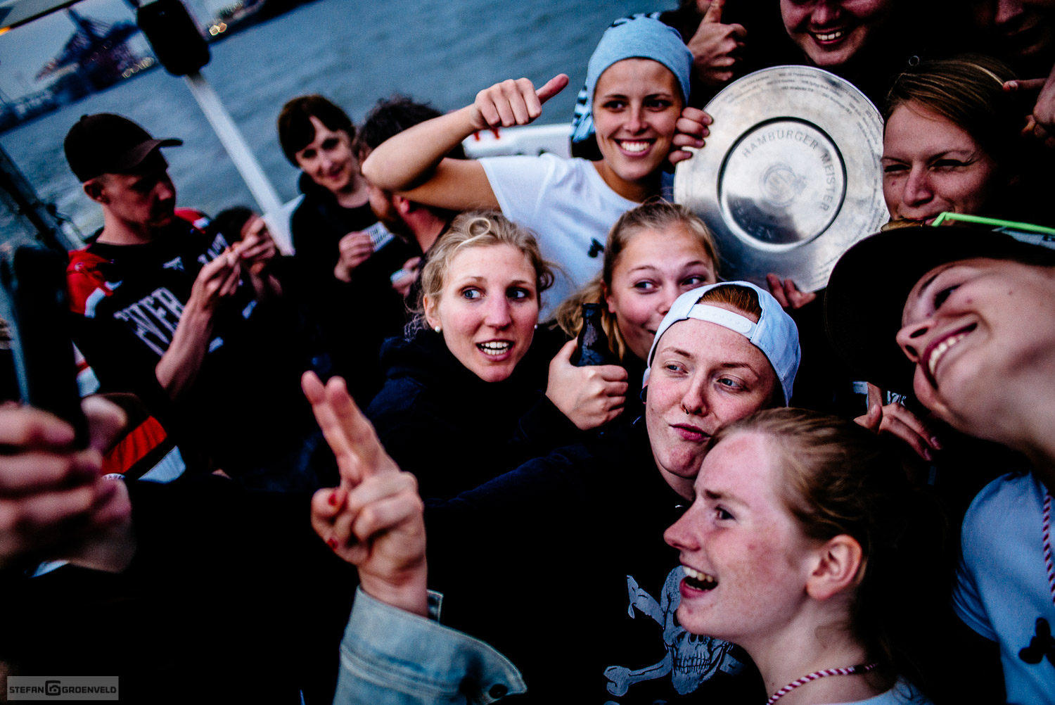 Was für eine Saison bei den 1. Frauen vom FC St. Pauli – 103 zu 9 Tore, ungeschlagen Hamburger Meister geworden, eine Wahnsinnsspielzeit. Und es ist ja lange noch nicht Schluss. In zwei Relegationsspielen geht es nun am nächsten Sonntag gegen die Teilnehmerinnen aus Schleswig-Holstein und noch eine Woche später auswärts gegen das teilnehmende Team aus Bremen. Aber gestern wurde erst mal gefeiert: die Meisterschaft. Aber das war schon die Kür, vorher kam noch die Pflicht mit dem Spiel gegen Eilbek, das souverän mit 9:1 gewonnen wurde. Und hinterher gab es eine wunderschöne Meisterinnenfeier zusammen mit den treusten Fans auf der Barkasse St. Pauli.