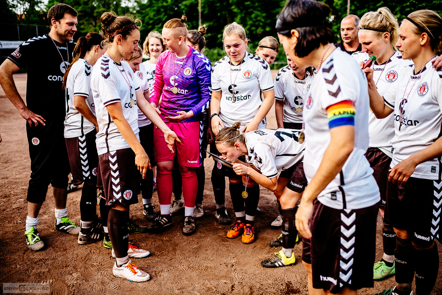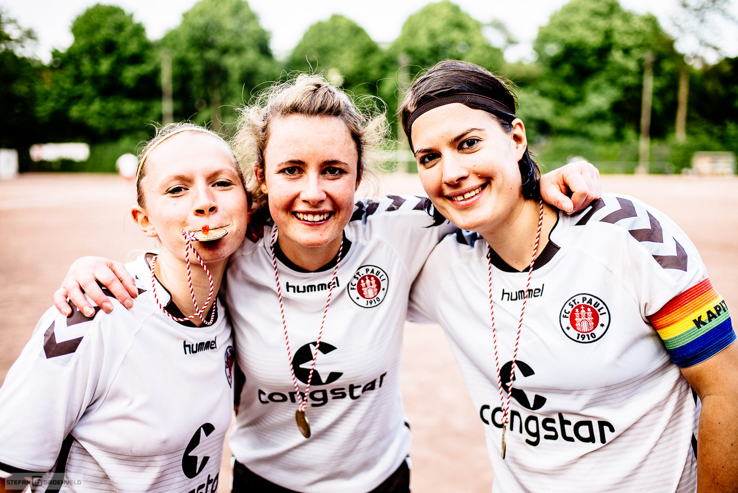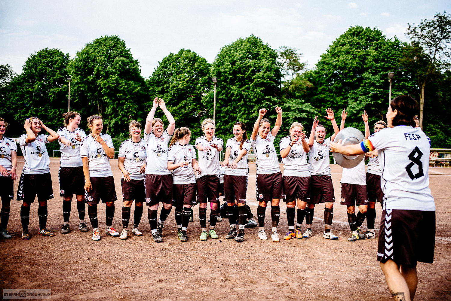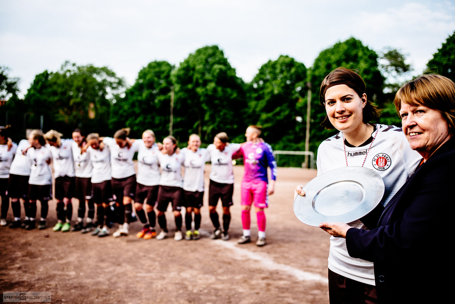 Was für eine Saison bei den 1. Frauen vom FC St. Pauli – 103 zu 9 Tore, ungeschlagen Hamburger Meister geworden, eine Wahnsinnsspielzeit. Und es ist ja lange noch nicht Schluss. In zwei Relegationsspielen geht es nun am nächsten Sonntag gegen die Teilnehmerinnen aus Schleswig-Holstein und noch eine Woche später auswärts gegen das teilnehmende Team aus Bremen. Aber gestern wurde erst mal gefeiert: die Meisterschaft. Aber das war schon die Kür, vorher kam noch die Pflicht mit dem Spiel gegen Eilbek, das souverän mit 9:1 gewonnen wurde. Und hinterher gab es eine wunderschöne Meisterinnenfeier zusammen mit den treusten Fans auf der Barkasse St. Pauli.