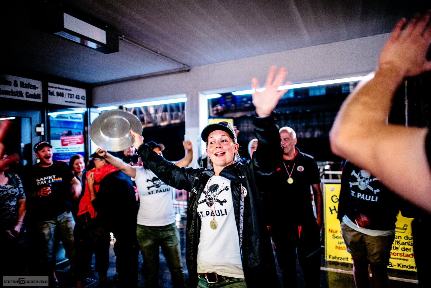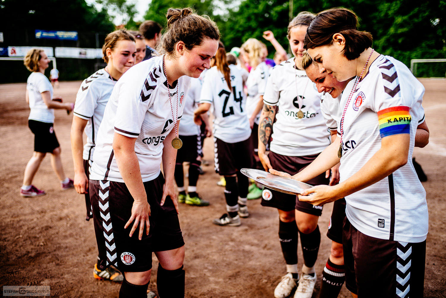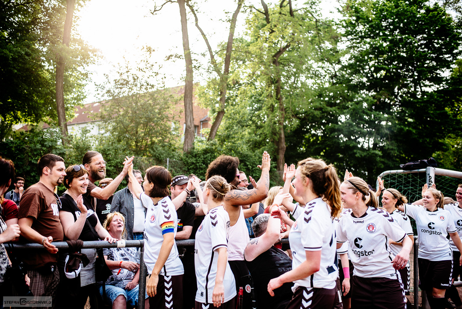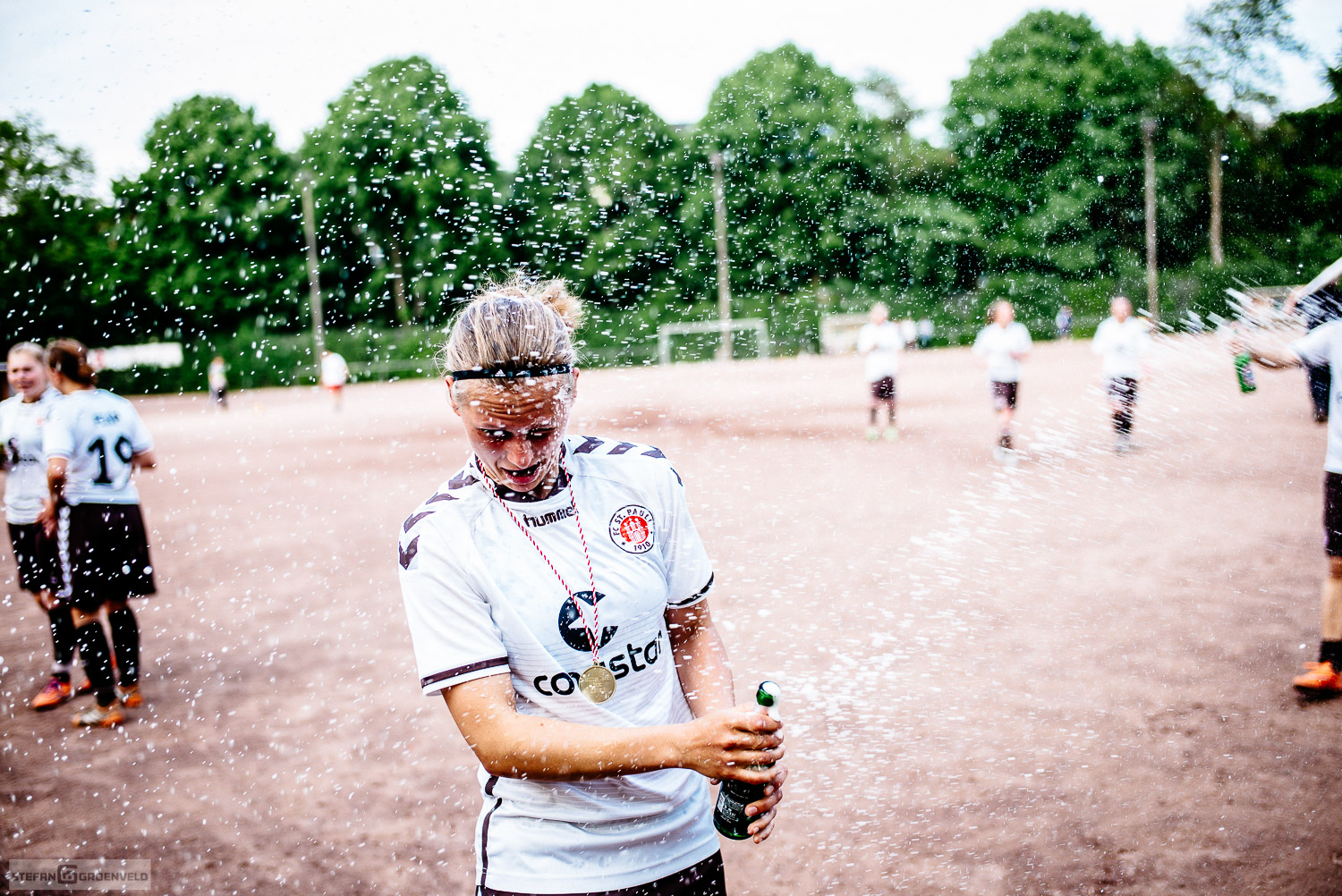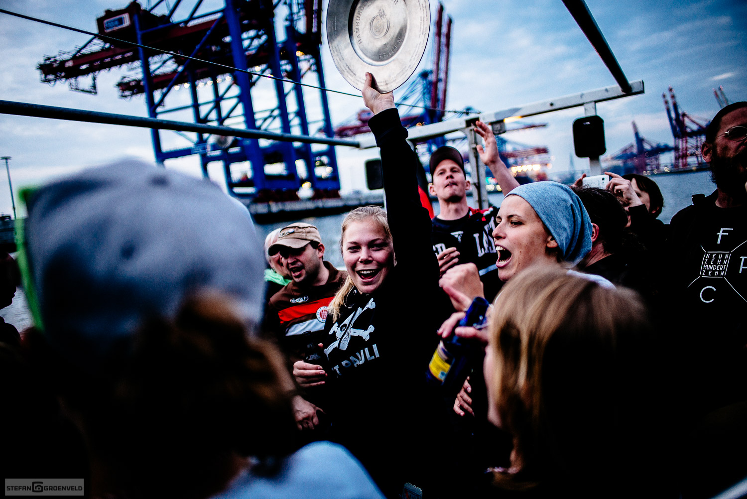 Was für eine Saison bei den 1. Frauen vom FC St. Pauli – 103 zu 9 Tore, ungeschlagen Hamburger Meister geworden, eine Wahnsinnsspielzeit. Und es ist ja lange noch nicht Schluss. In zwei Relegationsspielen geht es nun am nächsten Sonntag gegen die Teilnehmerinnen aus Schleswig-Holstein und noch eine Woche später auswärts gegen das teilnehmende Team aus Bremen. Aber gestern wurde erst mal gefeiert: die Meisterschaft. Aber das war schon die Kür, vorher kam noch die Pflicht mit dem Spiel gegen Eilbek, das souverän mit 9:1 gewonnen wurde. Und hinterher gab es eine wunderschöne Meisterinnenfeier zusammen mit den treusten Fans auf der Barkasse St. Pauli.