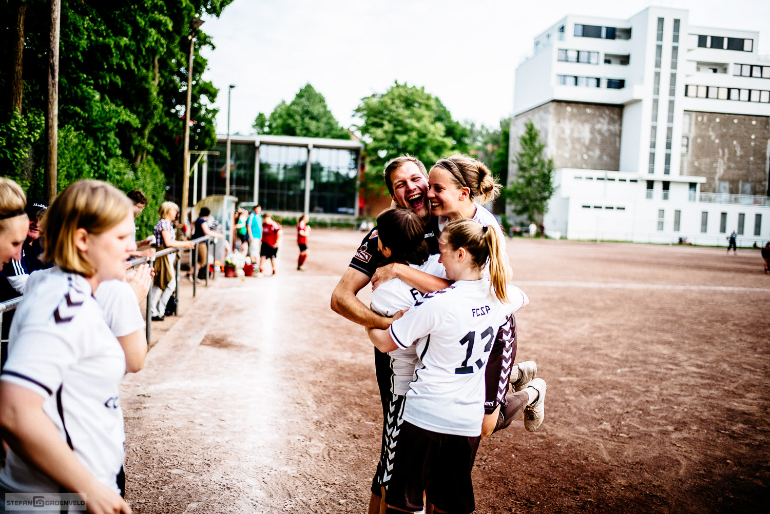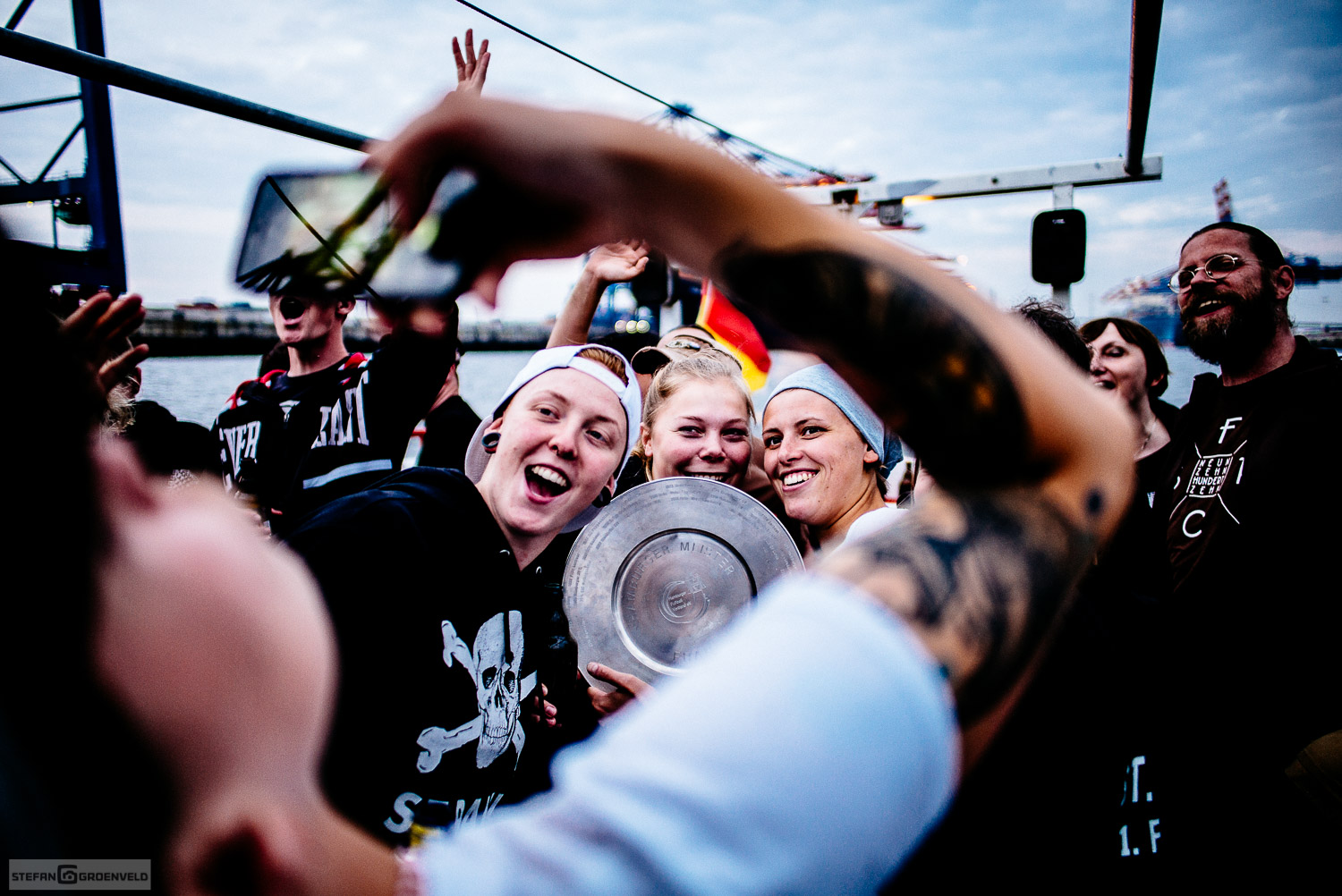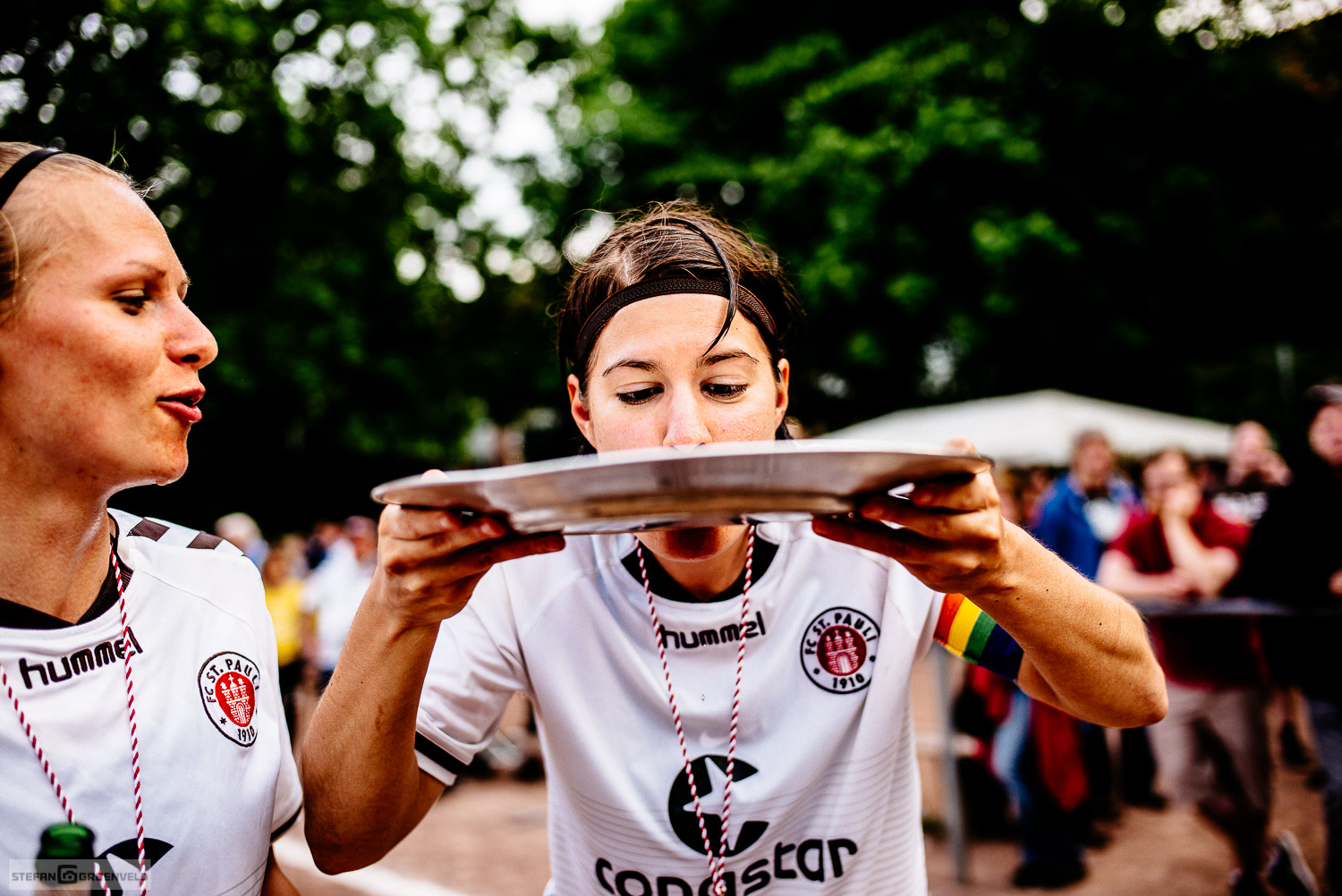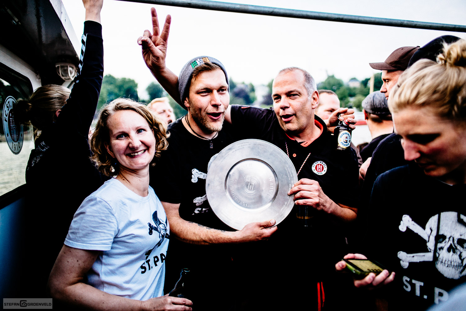 Was für eine Saison bei den 1. Frauen vom FC St. Pauli – 103 zu 9 Tore, ungeschlagen Hamburger Meister geworden, eine Wahnsinnsspielzeit. Und es ist ja lange noch nicht Schluss. In zwei Relegationsspielen geht es nun am nächsten Sonntag gegen die Teilnehmerinnen aus Schleswig-Holstein und noch eine Woche später auswärts gegen das teilnehmende Team aus Bremen. Aber gestern wurde erst mal gefeiert: die Meisterschaft. Aber das war schon die Kür, vorher kam noch die Pflicht mit dem Spiel gegen Eilbek, das souverän mit 9:1 gewonnen wurde. Und hinterher gab es eine wunderschöne Meisterinnenfeier zusammen mit den treusten Fans auf der Barkasse St. Pauli.
