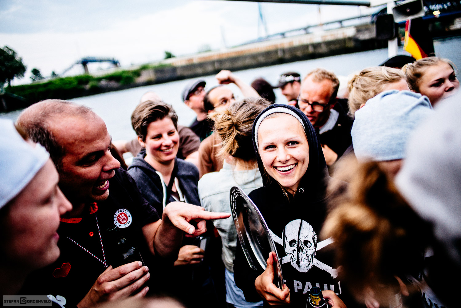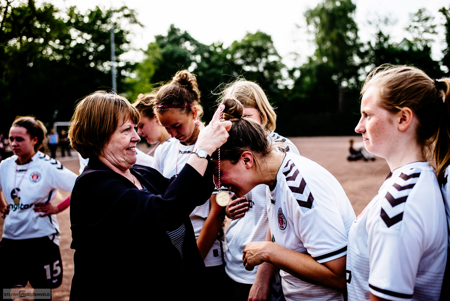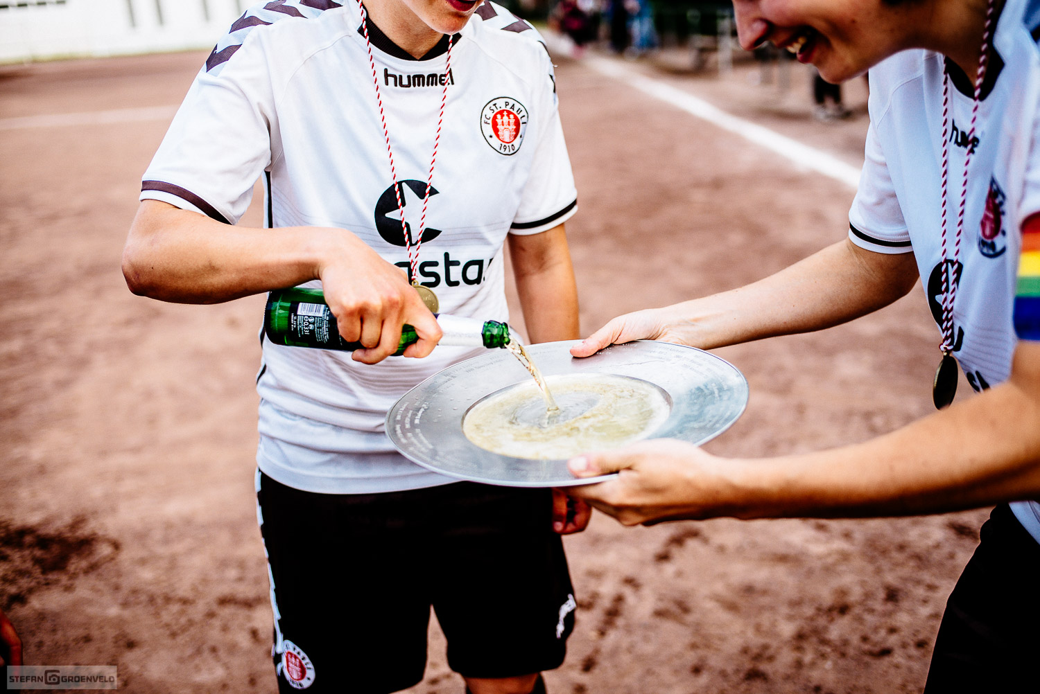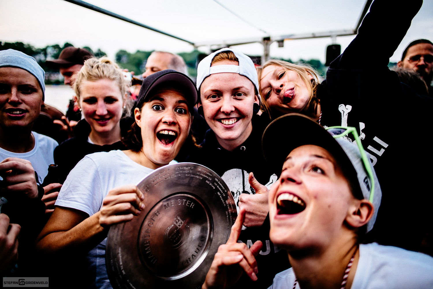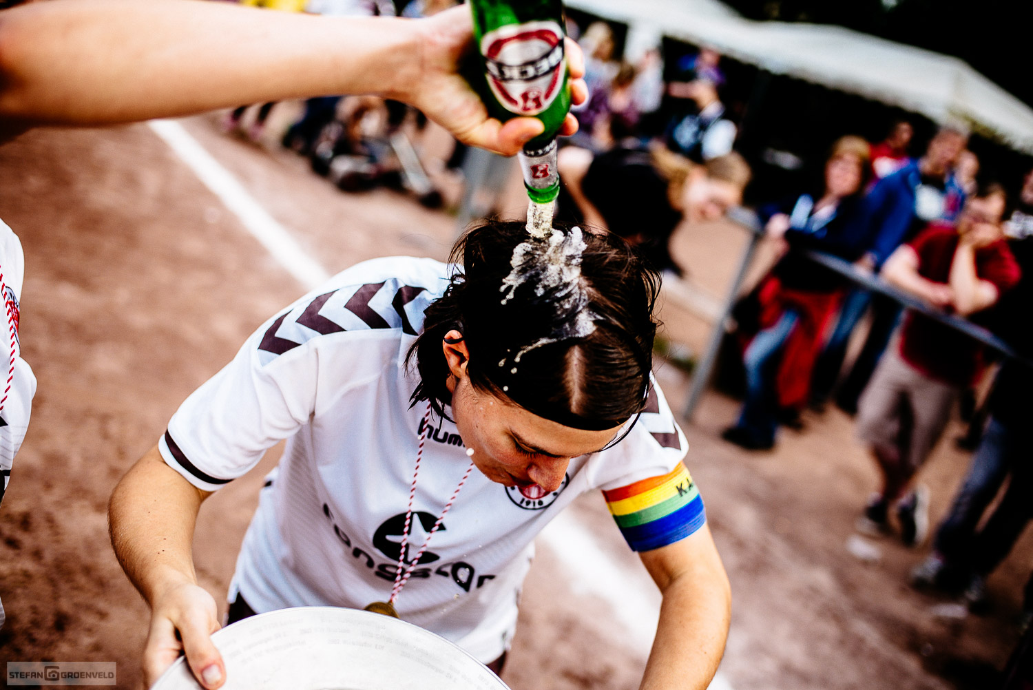 Was für eine Saison bei den 1. Frauen vom FC St. Pauli – 103 zu 9 Tore, ungeschlagen Hamburger Meister geworden, eine Wahnsinnsspielzeit. Und es ist ja lange noch nicht Schluss. In zwei Relegationsspielen geht es nun am nächsten Sonntag gegen die Teilnehmerinnen aus Schleswig-Holstein und noch eine Woche später auswärts gegen das teilnehmende Team aus Bremen. Aber gestern wurde erst mal gefeiert: die Meisterschaft. Aber das war schon die Kür, vorher kam noch die Pflicht mit dem Spiel gegen Eilbek, das souverän mit 9:1 gewonnen wurde. Und hinterher gab es eine wunderschöne Meisterinnenfeier zusammen mit den treusten Fans auf der Barkasse St. Pauli.
