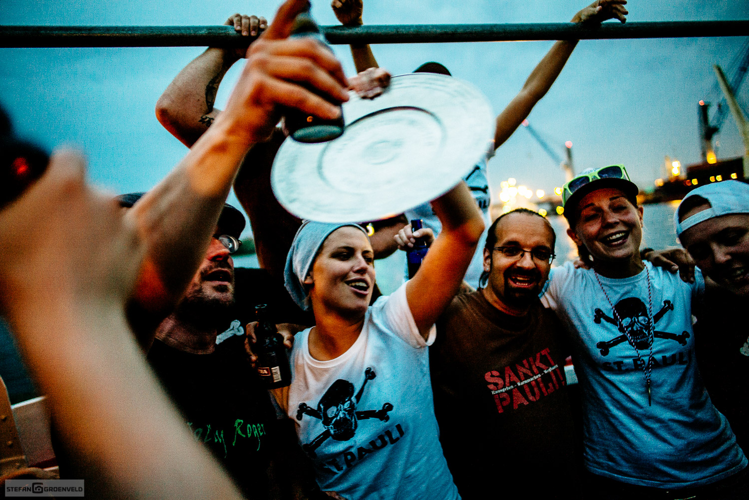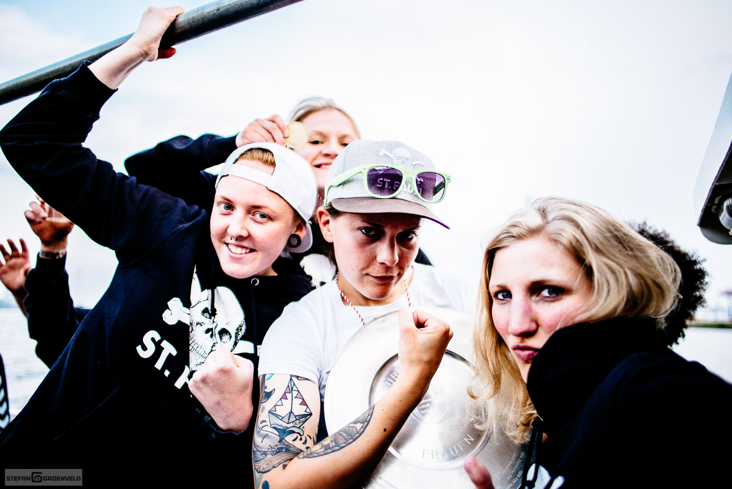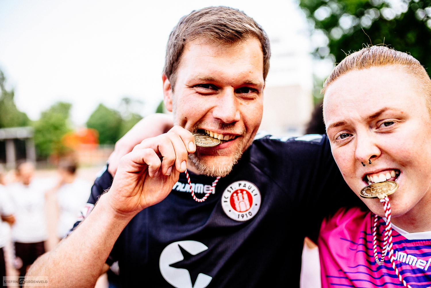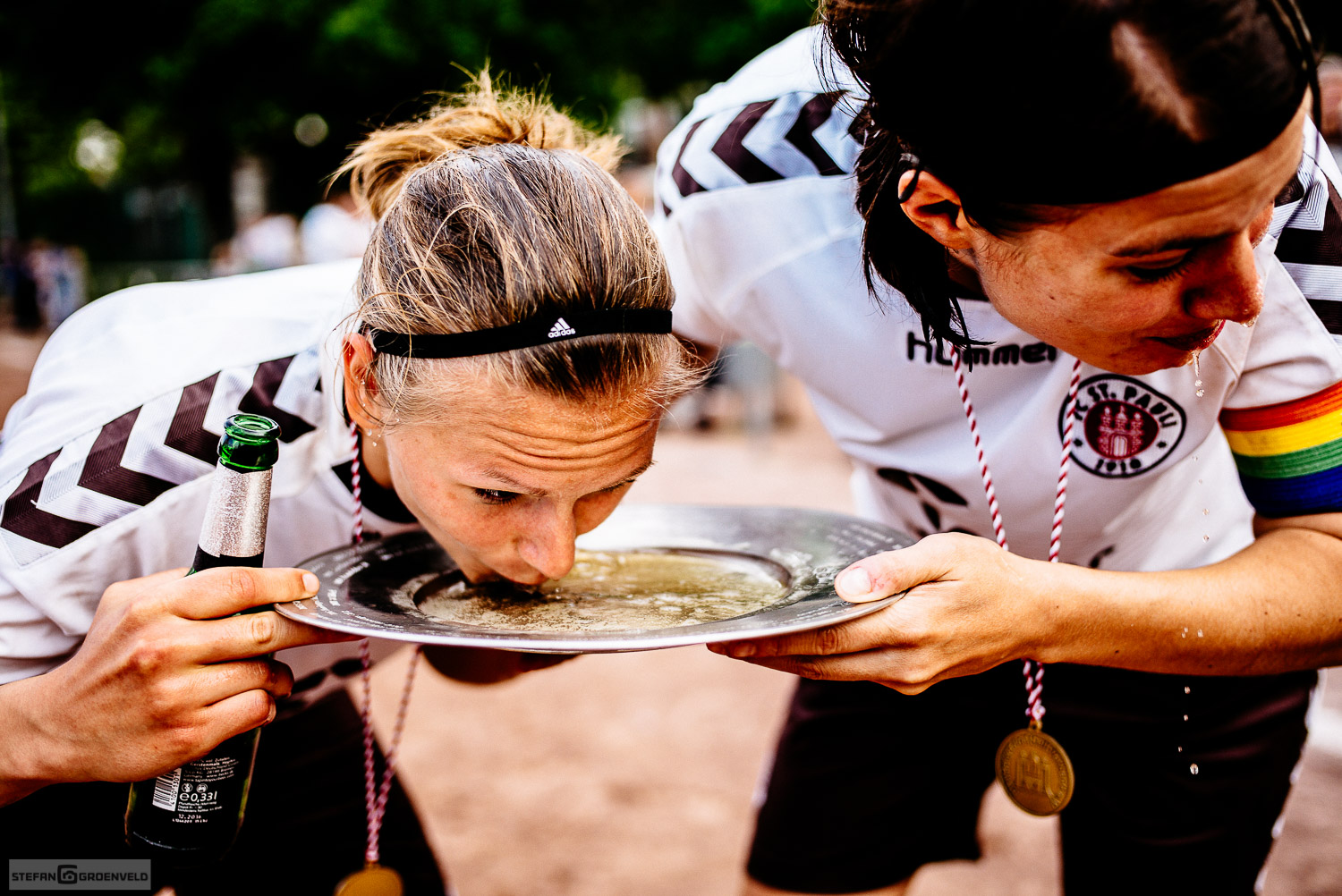 Was für eine Saison bei den 1. Frauen vom FC St. Pauli – 103 zu 9 Tore, ungeschlagen Hamburger Meister geworden, eine Wahnsinnsspielzeit. Und es ist ja lange noch nicht Schluss. In zwei Relegationsspielen geht es nun am nächsten Sonntag gegen die Teilnehmerinnen aus Schleswig-Holstein und noch eine Woche später auswärts gegen das teilnehmende Team aus Bremen. Aber gestern wurde erst mal gefeiert: die Meisterschaft. Aber das war schon die Kür, vorher kam noch die Pflicht mit dem Spiel gegen Eilbek, das souverän mit 9:1 gewonnen wurde. Und hinterher gab es eine wunderschöne Meisterinnenfeier zusammen mit den treusten Fans auf der Barkasse St. Pauli.