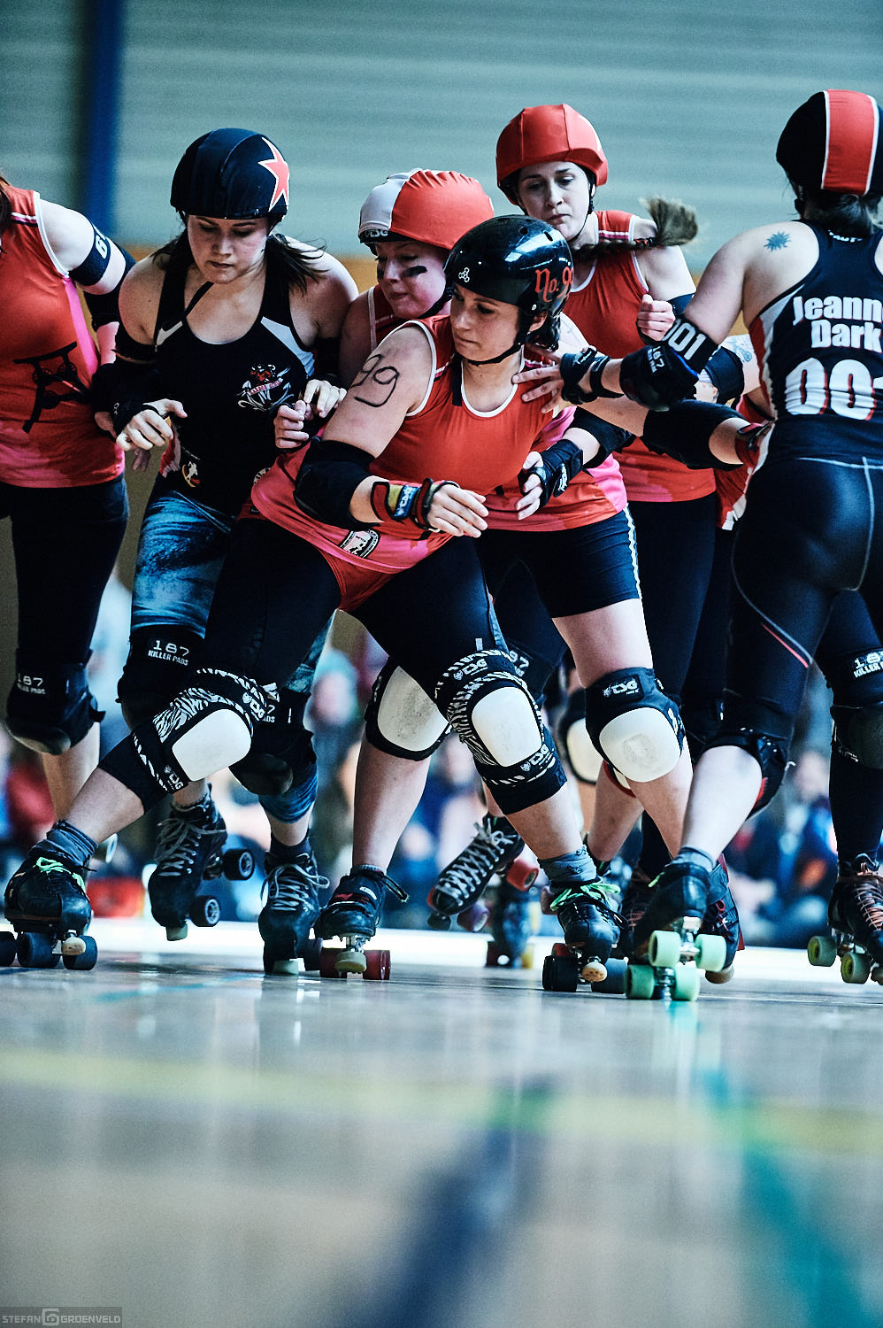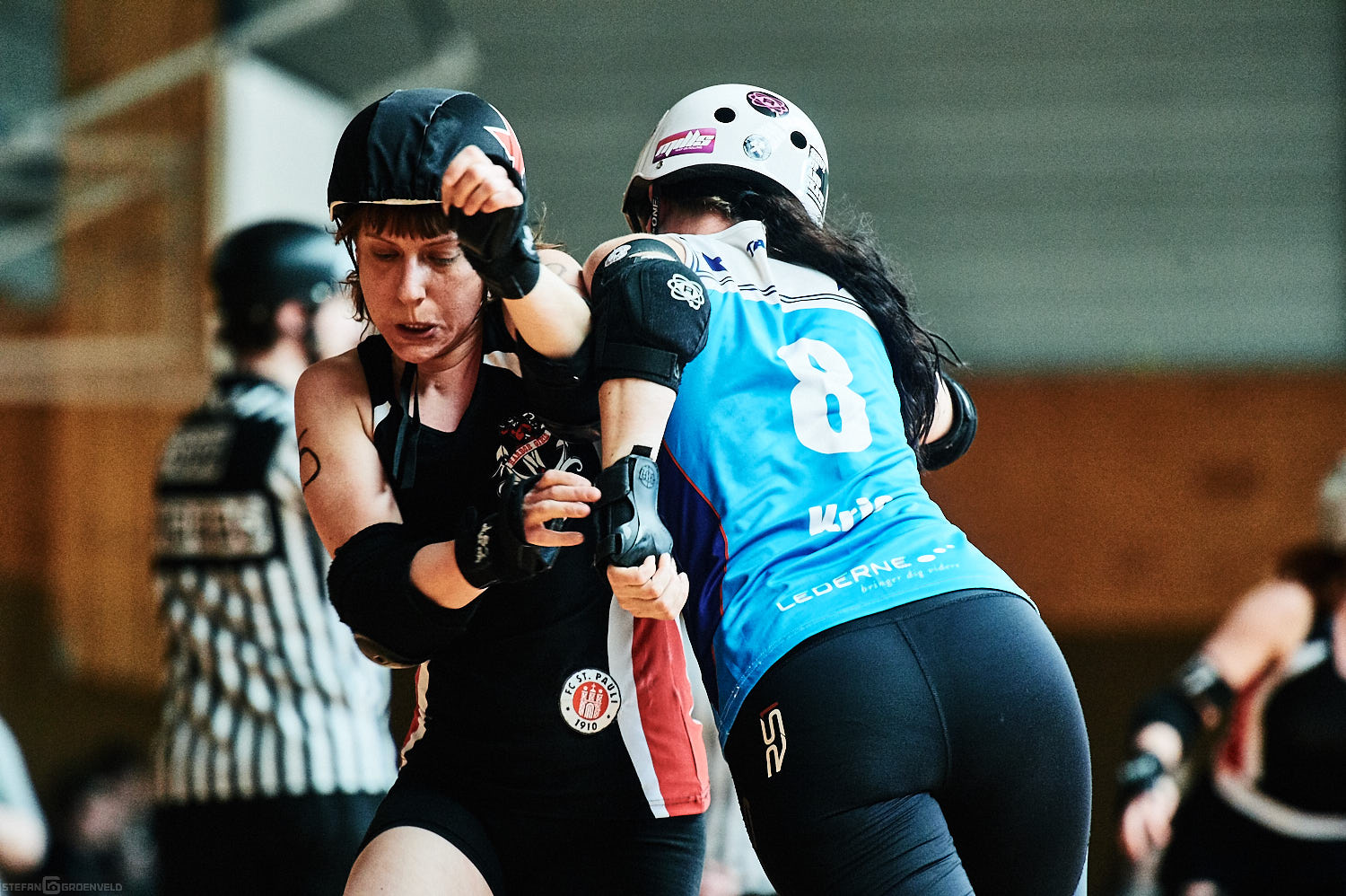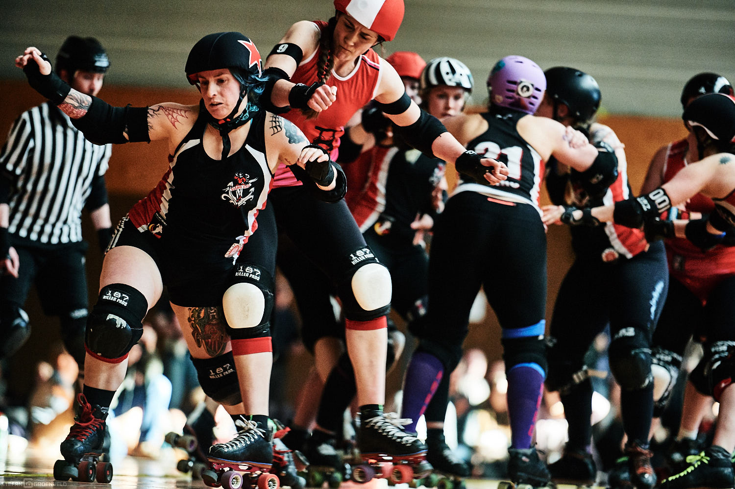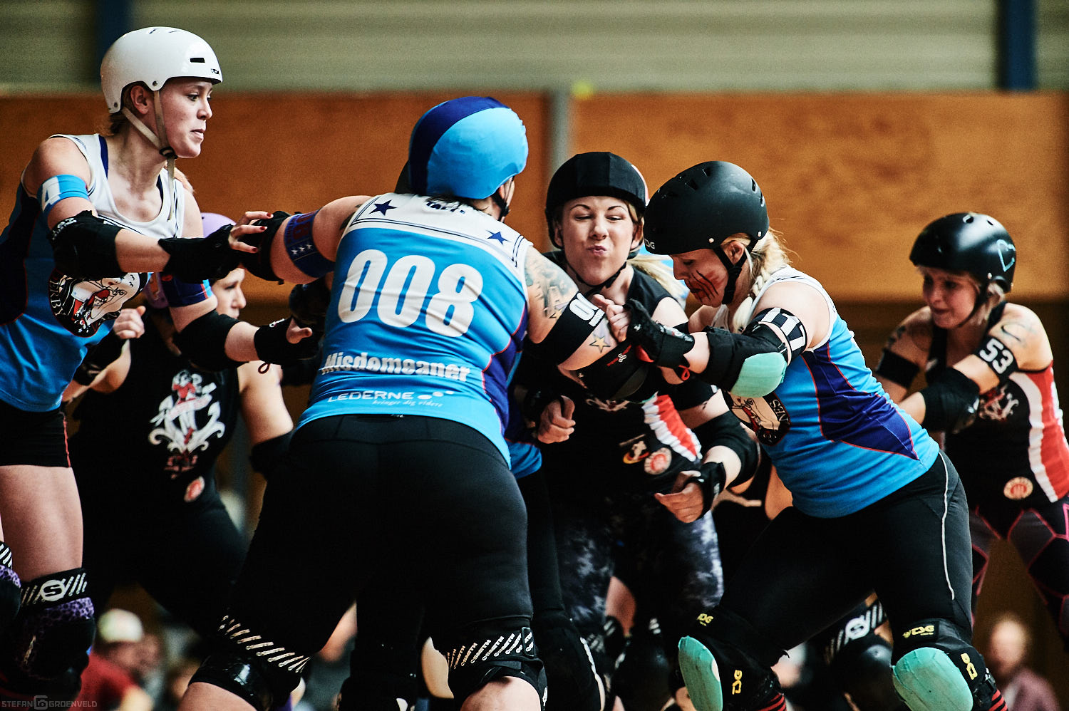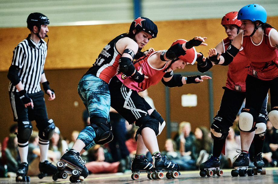 Mein Sportfotowochenende wäre nicht komplett gewesen, ohne am Samstag Bundesliga zu fotografieren. In der frischen Saison ging es beim Bout der Hamburg Harbor Girls gegen die Ruhrpott Roller Girls aus Essen. Und zum Eingewöhnen fighteten vorher noch das sogenannte B-Team der Harbor Girls gegen die Aarhus Derby Danes. Also ein Nachmittag mit Rollerderby vom Feinsten! „Roller Derby ist Vollkontakt auf Rollschuhen. Ähnlich wie Rugby. Aber ohne Ball. Roller Derby wird mit Helm, Mundschutz, Schonern und ohne Schonung gespielt.“ (vermutliche Quelle: Stadionzeitung vom FC St. Pauli beim Spiel gegen 1860 München 😉 )