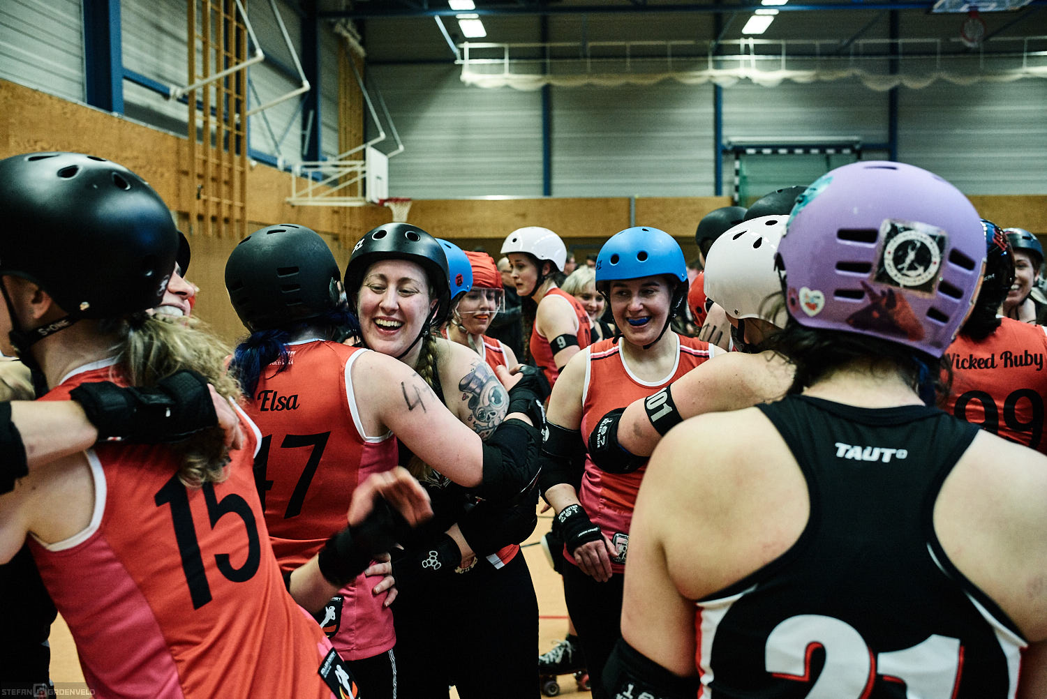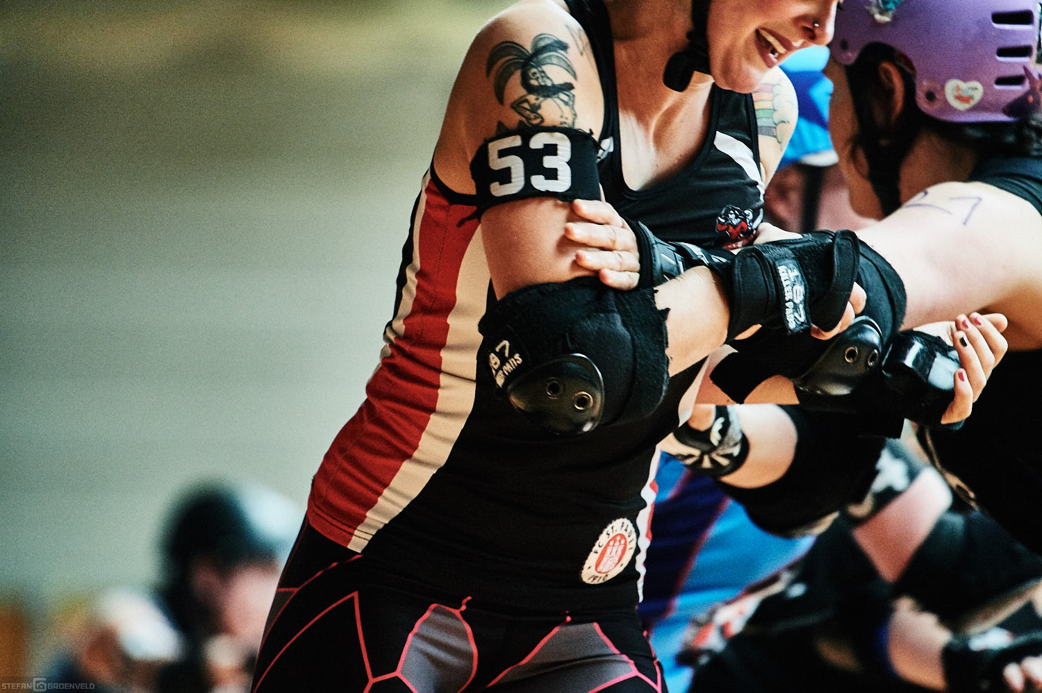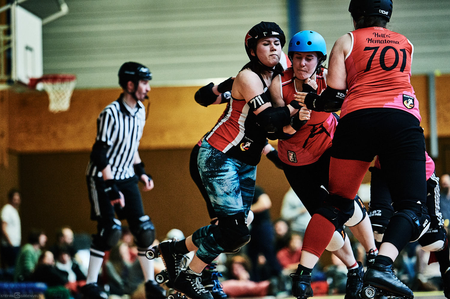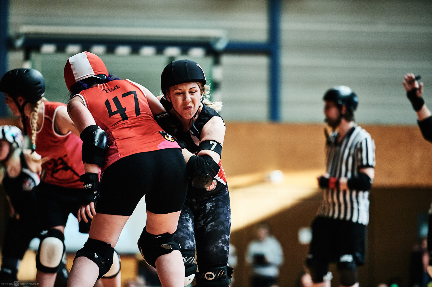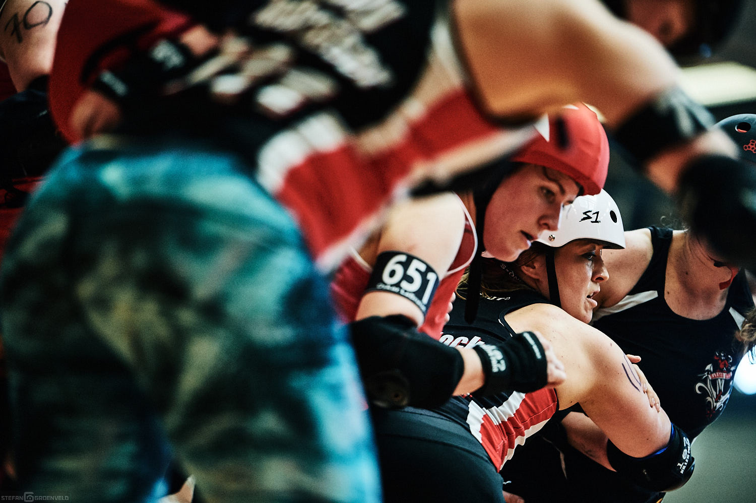Mein Sportfotowochenende wäre nicht komplett gewesen, ohne am Samstag Bundesliga zu fotografieren. In der frischen Saison ging es beim Bout der Hamburg Harbor Girls gegen die Ruhrpott Roller Girls aus Essen. Und zum Eingewöhnen fighteten vorher noch das sogenannte B-Team der Harbor Girls gegen die Aarhus Derby Danes. Also ein Nachmittag mit Rollerderby vom Feinsten! „Roller Derby ist Vollkontakt auf Rollschuhen. Ähnlich wie Rugby. Aber ohne Ball. Roller Derby wird mit Helm, Mundschutz, Schonern und ohne Schonung gespielt.“ (vermutliche Quelle: Stadionzeitung vom FC St. Pauli beim Spiel gegen 1860 München 😉 )