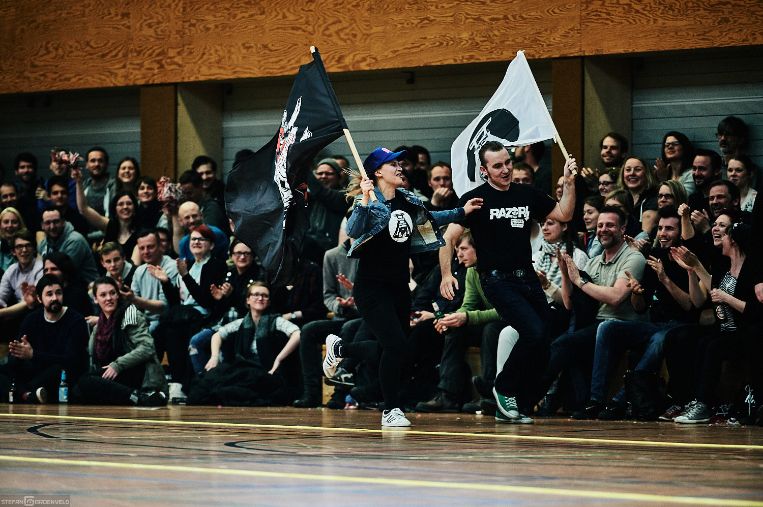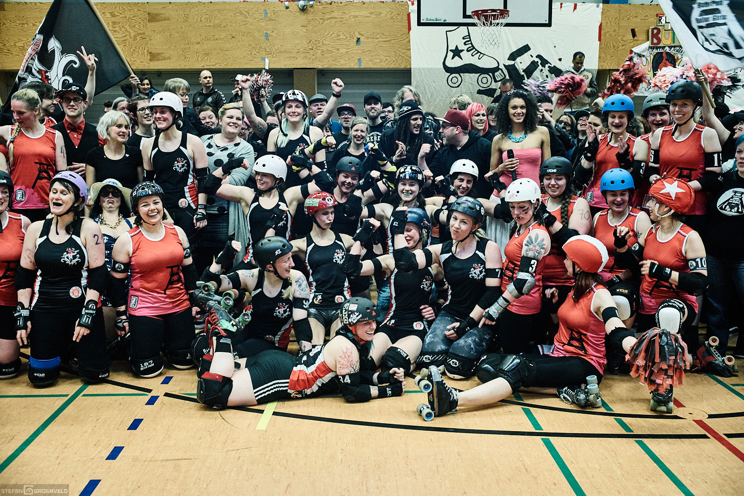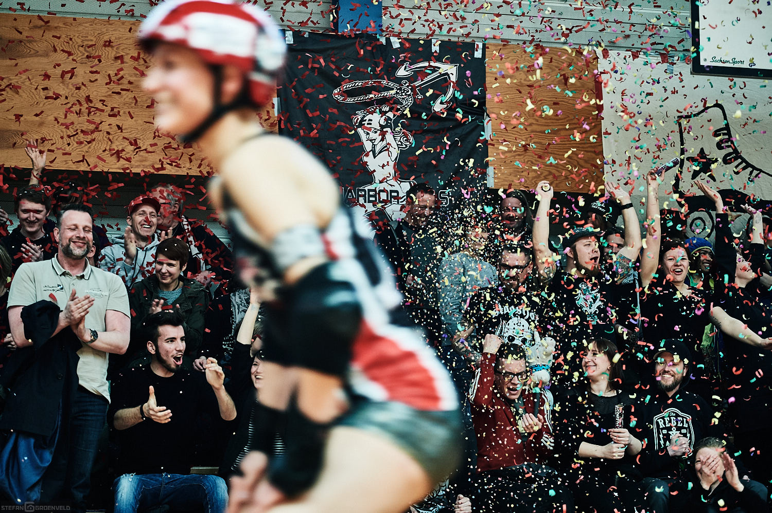 Dafür ging es im sportlichen wichtigen Bundesliga-Bout gegen Essen gleich mit voller Wucht in die bessere Richtung los. Die Harbor Girls rollten auch durch dichteste Packs der Essenerinnen wie ein heißes Messer durch Butter hindurch. Beeindruckend. Geschickt, artistisch, spektakulär. Das Spiel war schnell entschieden. Das tat der guten Stimmung auf den Rängen keinen Abbruch. Die zahlreichen Fans aus Essen sassen direkt neben den Hamburger „Ultras“ und lieferten schöne Singgefechte ab. Bei der obligatorischen Fahnenlaufrunde bei einer der Schiedsrichterberatungsunterbrechnungen wurden dann auch schon mal die Fahnen der „verfeindeten“ Fangruppierungen getauscht. So schön kann Rivalität sein.