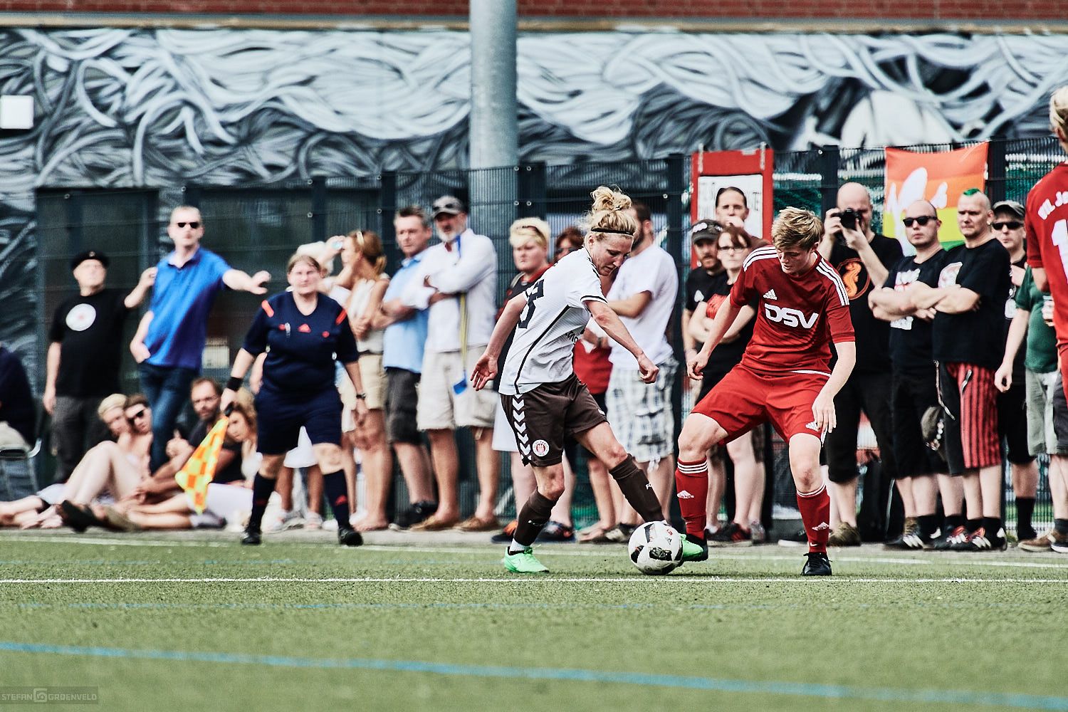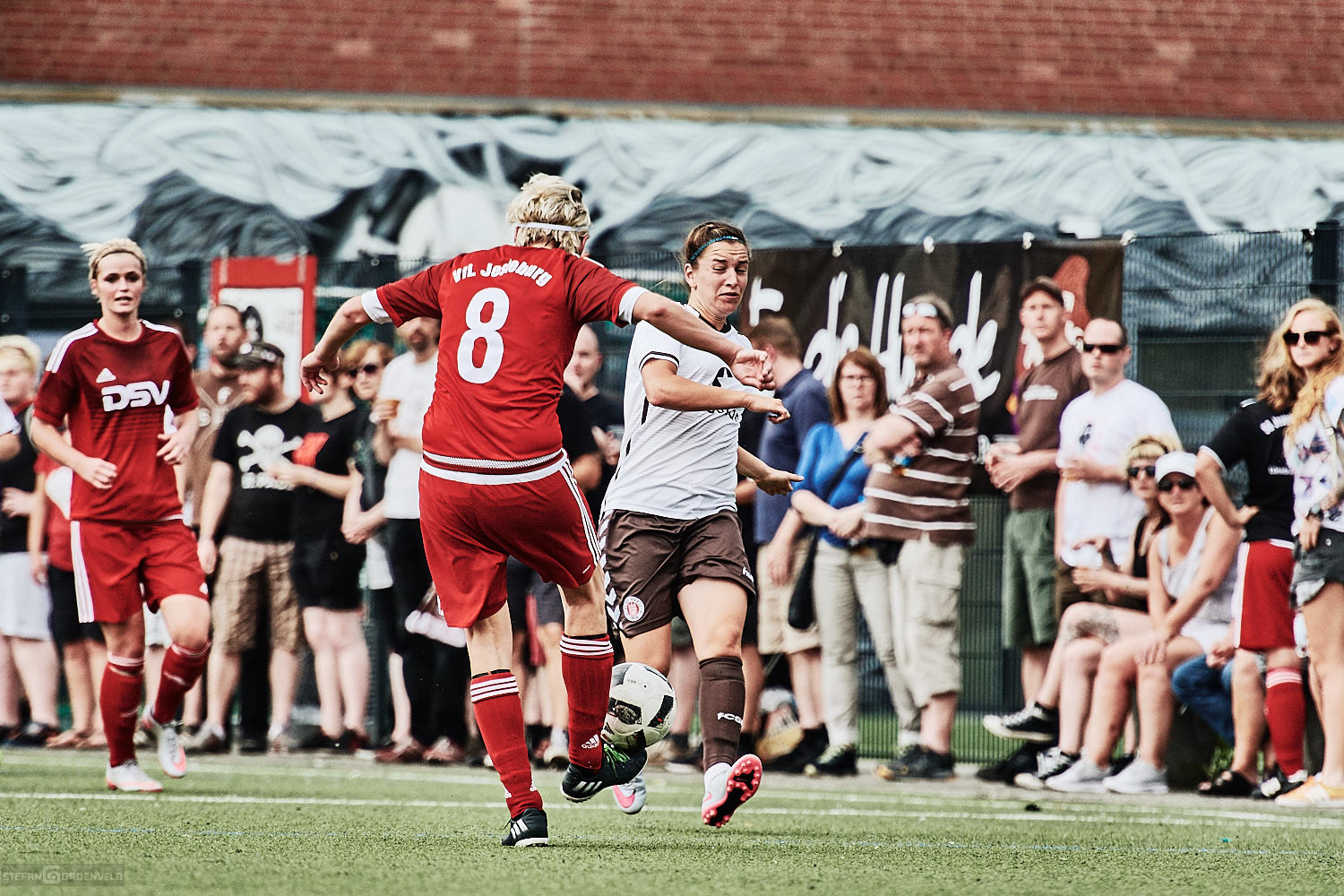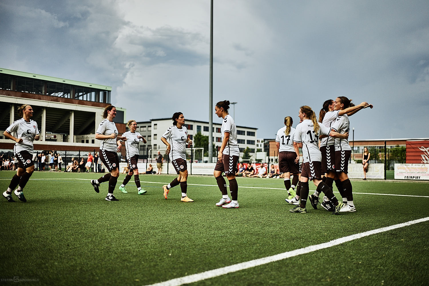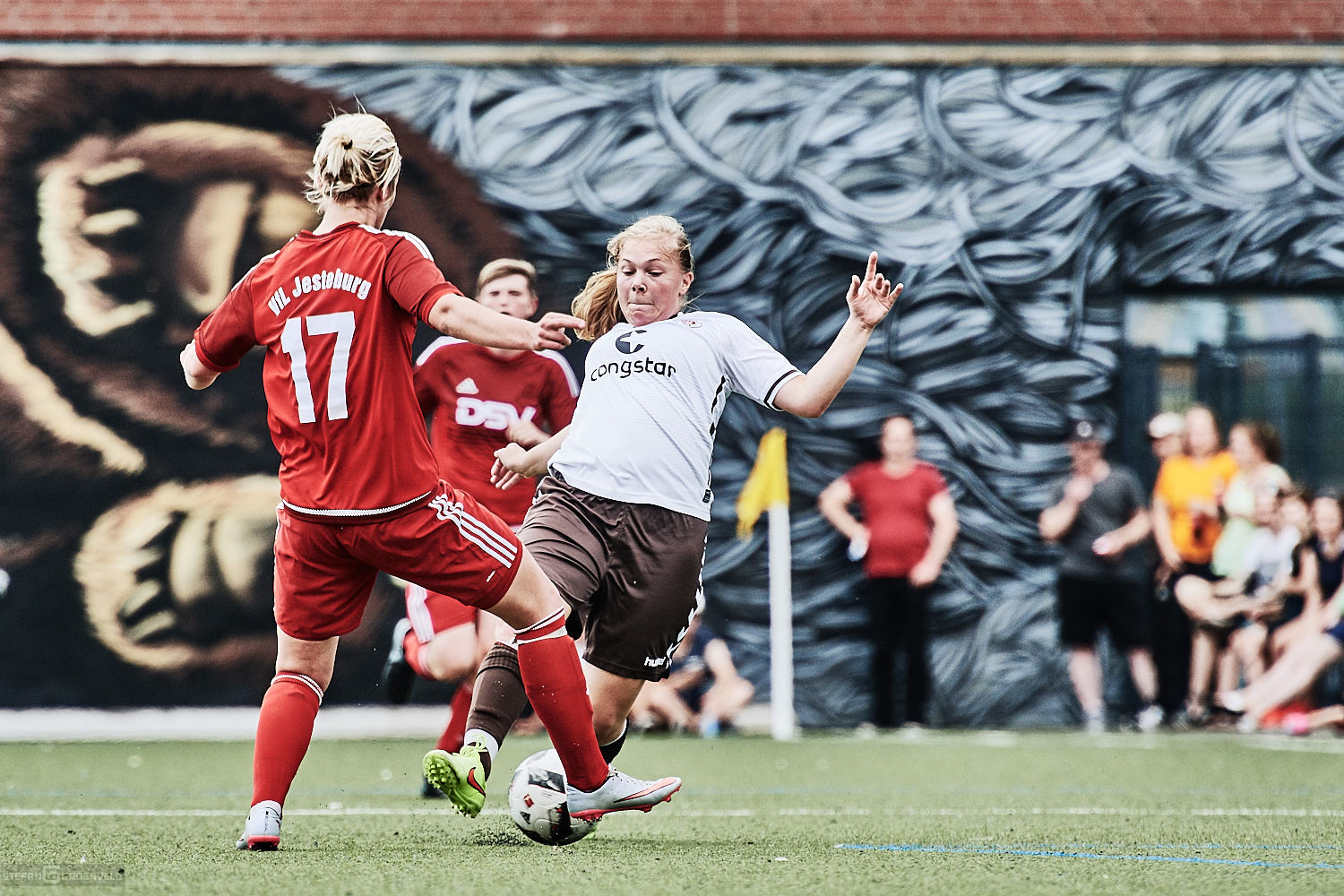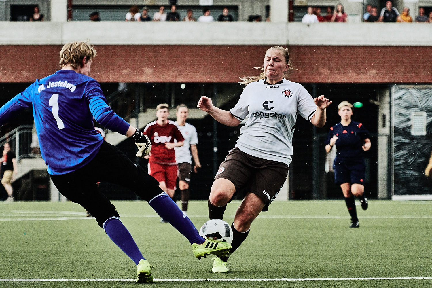 Zu sehen gab es neben den beiden Toren von Nina Philipp auf Seiten der braun-weißen und dem Ausgleich durch einen ins lange Eck gezirkelten Ball von Anna-Lena Günthel von Jesteburg ein kampfbetontes, trotz der zunächst heißen Temperaturen, schnelles Spiel. Jesteburg zunächst besser im Spiel, Francis Wernicke rettete fantastisch auf der Torlinie, Torfrau Tara Zimmermann die anderen Male – nach der Trinkenpause in der Mitte der ersten Halbzeit kamen die braun-weißen Frauen besser ins Spiel. Nina Philipp kam einmal frei vor dem Jesteburger Tor zum Schuss und schon war das Ding drin. Tolle Torjägerin. Leider konnte der FC St. Pauli in der Folge nicht nachlegen. Es ging mit einem knappen 1:0 in die Pause. Die dauerte fast eine Stunde. Ein Gewitter zog über St. Pauli. Die Zuschauer blieben gut gelaunt. Als dann endlich zur zweiten Halbzeit gepfiffen wurde, legte St. Pauli gleich wieder los und hatte mehrere gute Chancen, die Führung auszubauen.