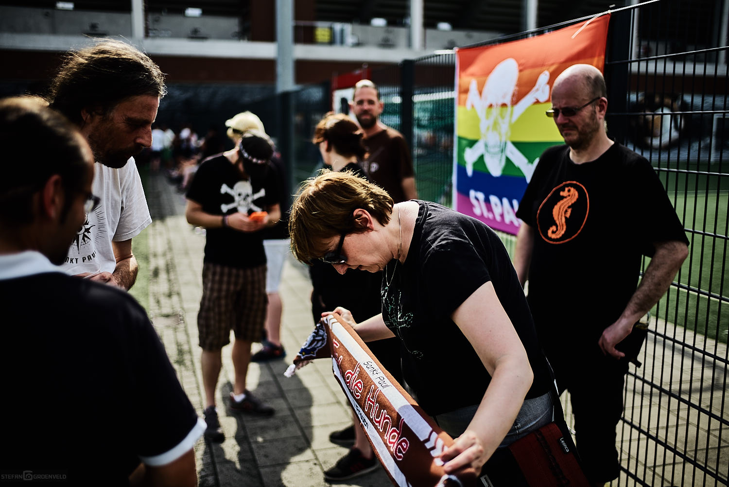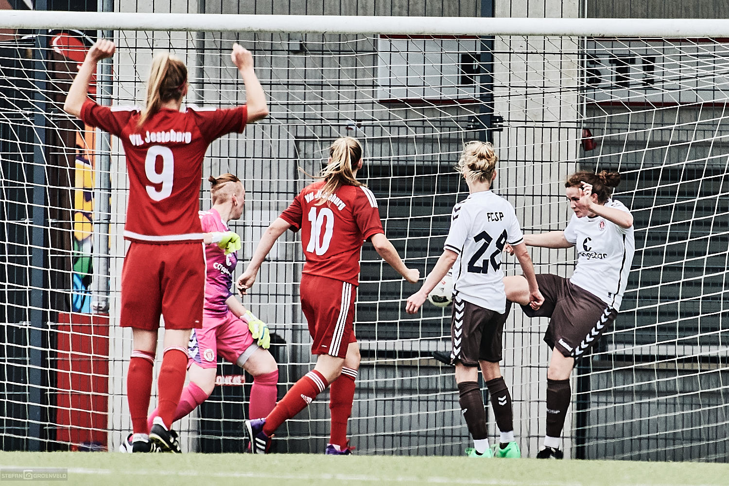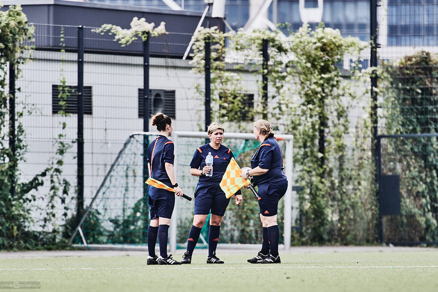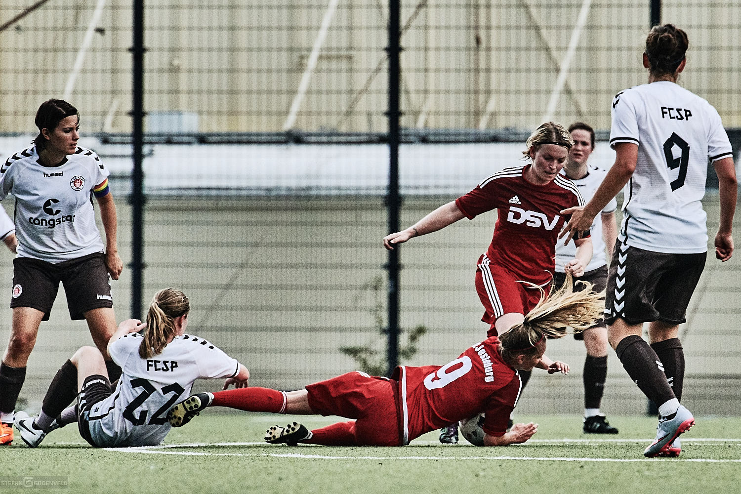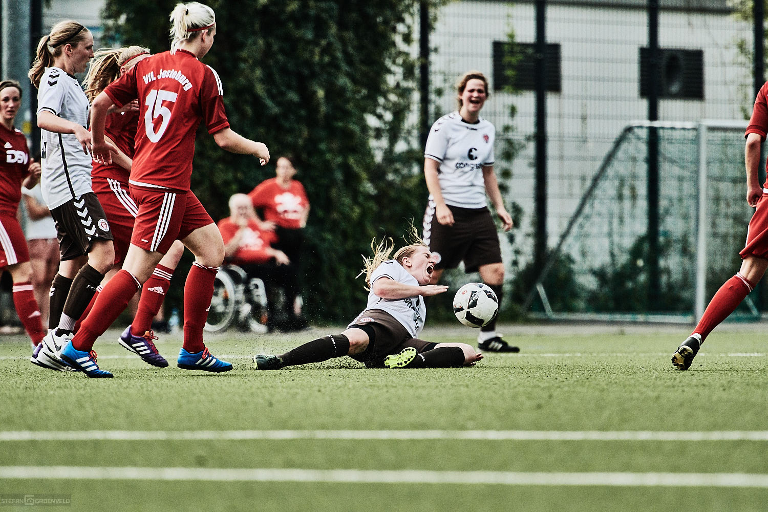 Zu sehen gab es neben den beiden Toren von Nina Philipp auf Seiten der braun-weißen und dem Ausgleich durch einen ins lange Eck gezirkelten Ball von Anna-Lena Günthel von Jesteburg ein kampfbetontes, trotz der zunächst heißen Temperaturen, schnelles Spiel. Jesteburg zunächst besser im Spiel, Francis Wernicke rettete fantastisch auf der Torlinie, Torfrau Tara Zimmermann die anderen Male – nach der Trinkenpause in der Mitte der ersten Halbzeit kamen die braun-weißen Frauen besser ins Spiel. Nina Philipp kam einmal frei vor dem Jesteburger Tor zum Schuss und schon war das Ding drin. Tolle Torjägerin. Leider konnte der FC St. Pauli in der Folge nicht nachlegen. Es ging mit einem knappen 1:0 in die Pause. Die dauerte fast eine Stunde. Ein Gewitter zog über St. Pauli. Die Zuschauer blieben gut gelaunt. Als dann endlich zur zweiten Halbzeit gepfiffen wurde, legte St. Pauli gleich wieder los und hatte mehrere gute Chancen, die Führung auszubauen.