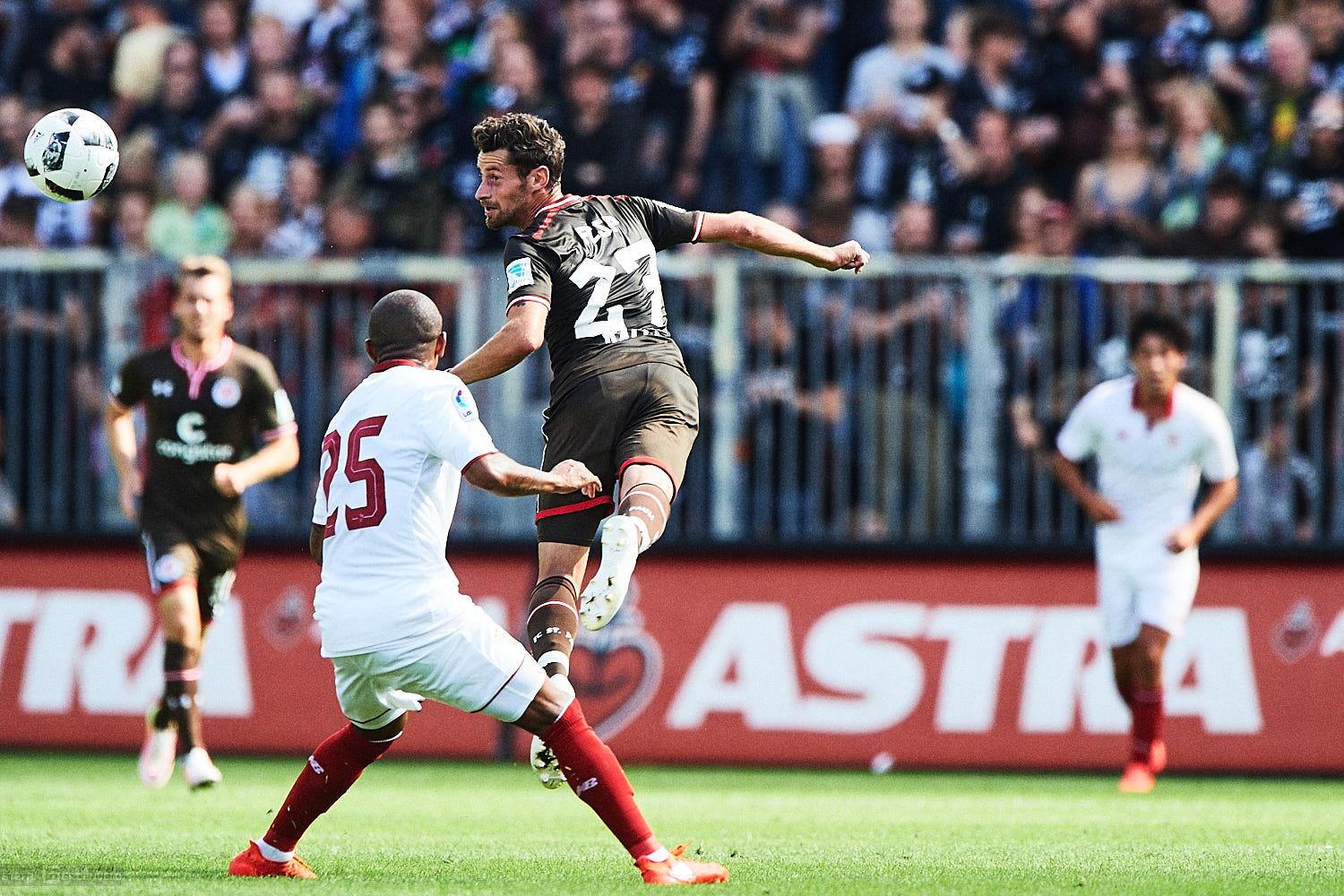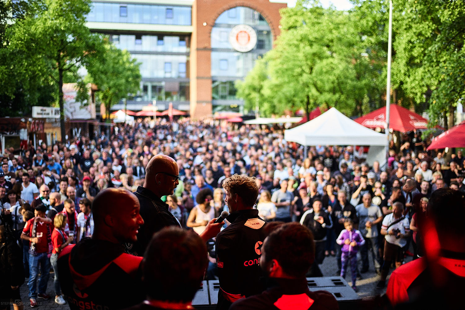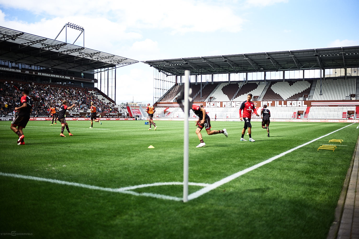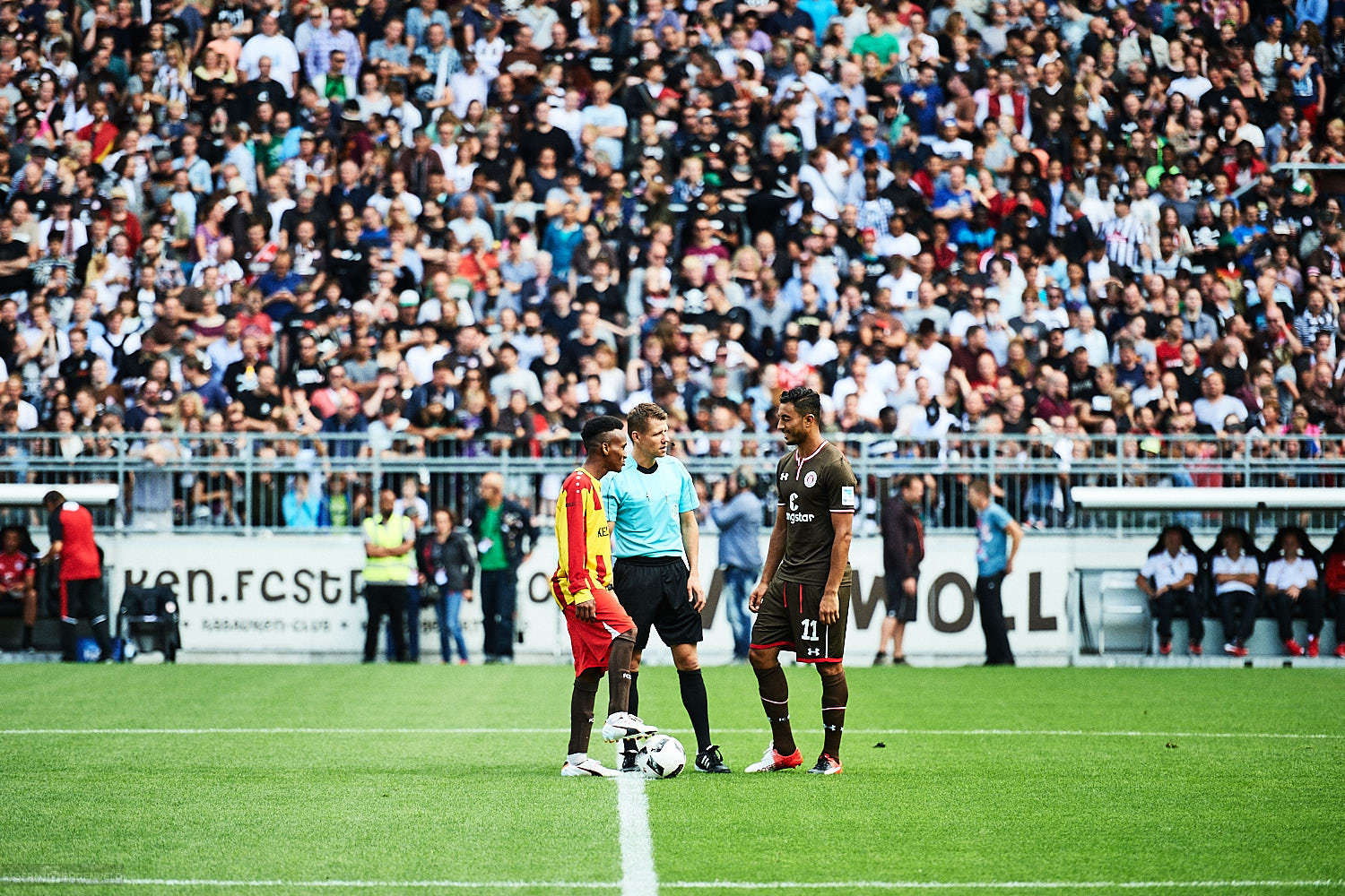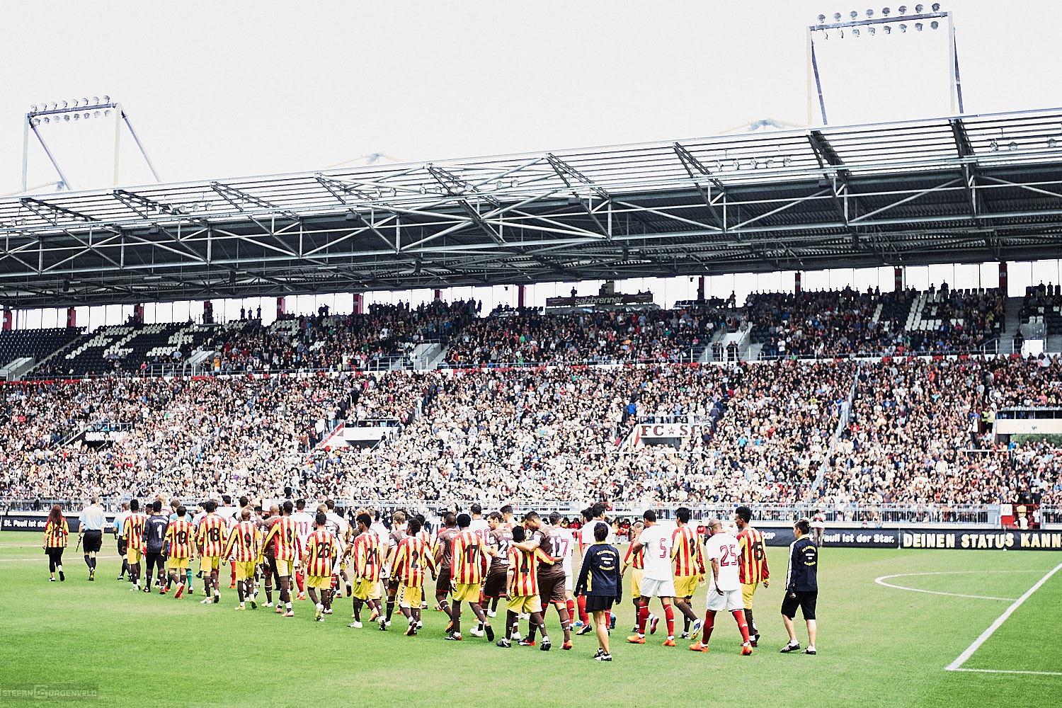 Testspiele haben zwar für die Spieler einen Grund, aber für Zuschauer sind sie eigentlich wertlos. Wie sehr sich die braun-weiße Fussballseele nach dem Ballspiel im heimischen Millerntor sehnt, zeigen die vollbesetzten Ränge im Viereck. So war es trotz allem auch für die Zuschauer schön, die Mannschaft für die neue Saison sehen zu können – ohne, dass gleich wieder Alkohol und Adrenalin um die Vorherrschaft im Blut kämpfen. Und es gab ja einiges zu sehen…