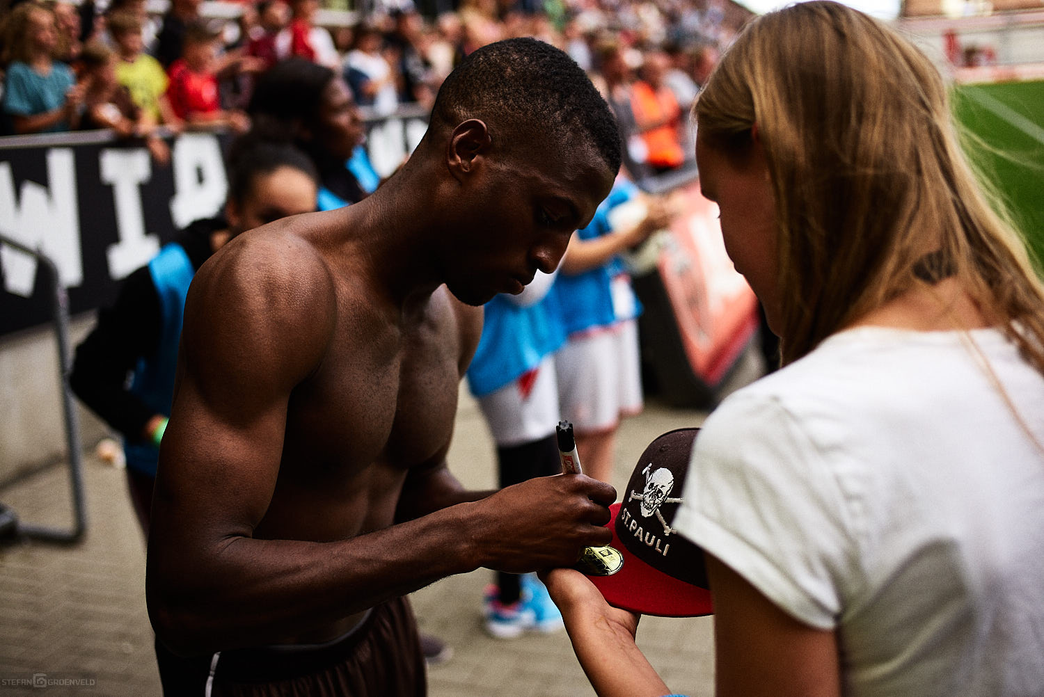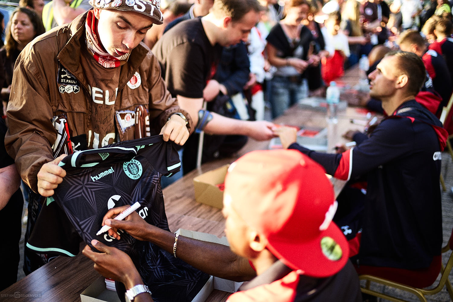Nach dem Spiel gab es dann noch die obligatorische Autogrammstunde (sprich: Autogrammstunden) und Interviewrunde der neuen Spieler vor großem Publikum. Wichtiger war aber vor dem Spiel: der FC Lampedusa als Einlaufkinder ist ein wunderbares Signal gewesen, dass Flüchtlinge nicht in Vergessenheit geraten sind. Gerade nach dem martialischen Auftreten der Hamburger Polizei in der Hafenstrasse in den letzten Wochen sogar ein sehr wichtiges Zeichen. Noch wichtiger aber, dass der FC St. Pauli die Patenschaft für diesen besonderen Fussballclub übernimmt – FC Lampedusa St. Pauli klingt geil und ist es auch. Danke, liebe Verantwortliche, für dieses Zeichen für Austausch und Verständigung! „Und ich weiß, warum ich hier stehe…“