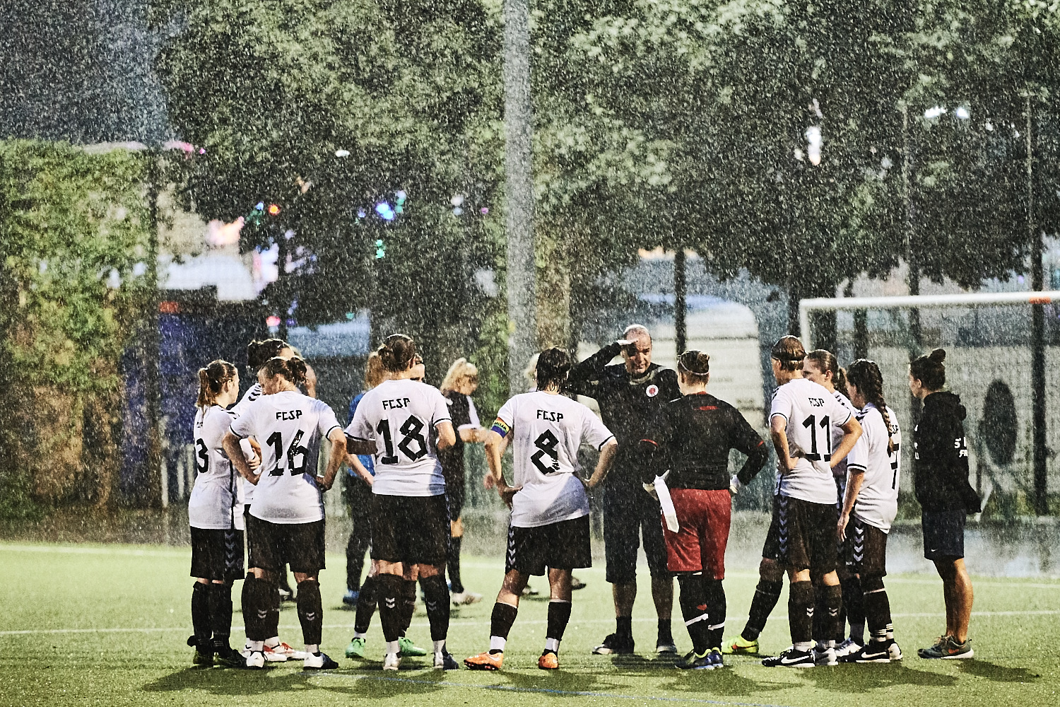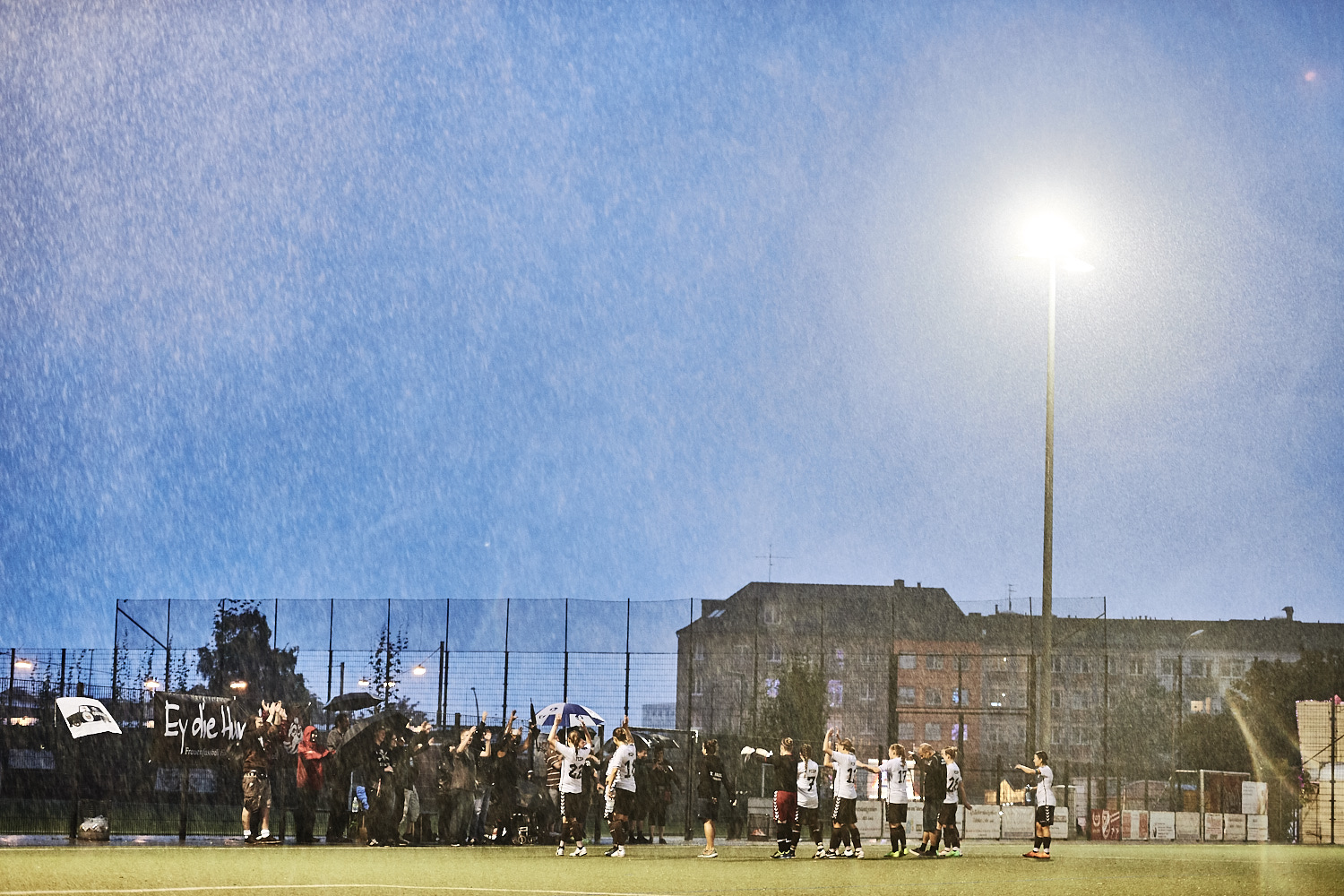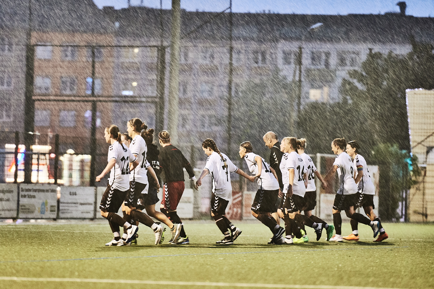 In der zweiten Halbzeit kamen die Gäste besser ins Spiel, die braun-weißen Frauen vielleicht auch wegen der Vorbereitungsstrapazen etwas aus der Puste und insgesamt der große Regen. 4:2 stand es am Ende. Ein großes Lob an die Fans rund um den Fanclub „Ey, die Hunde“, die am Ende eher „Ey, die begossenen Pudel“ hätten heißen müssen. Jedenfalls wurde ich erst richtig nass, als Pat nach dem Spiel in meiner Nähe seinen Kopf hin- und herwirbelte. 😀