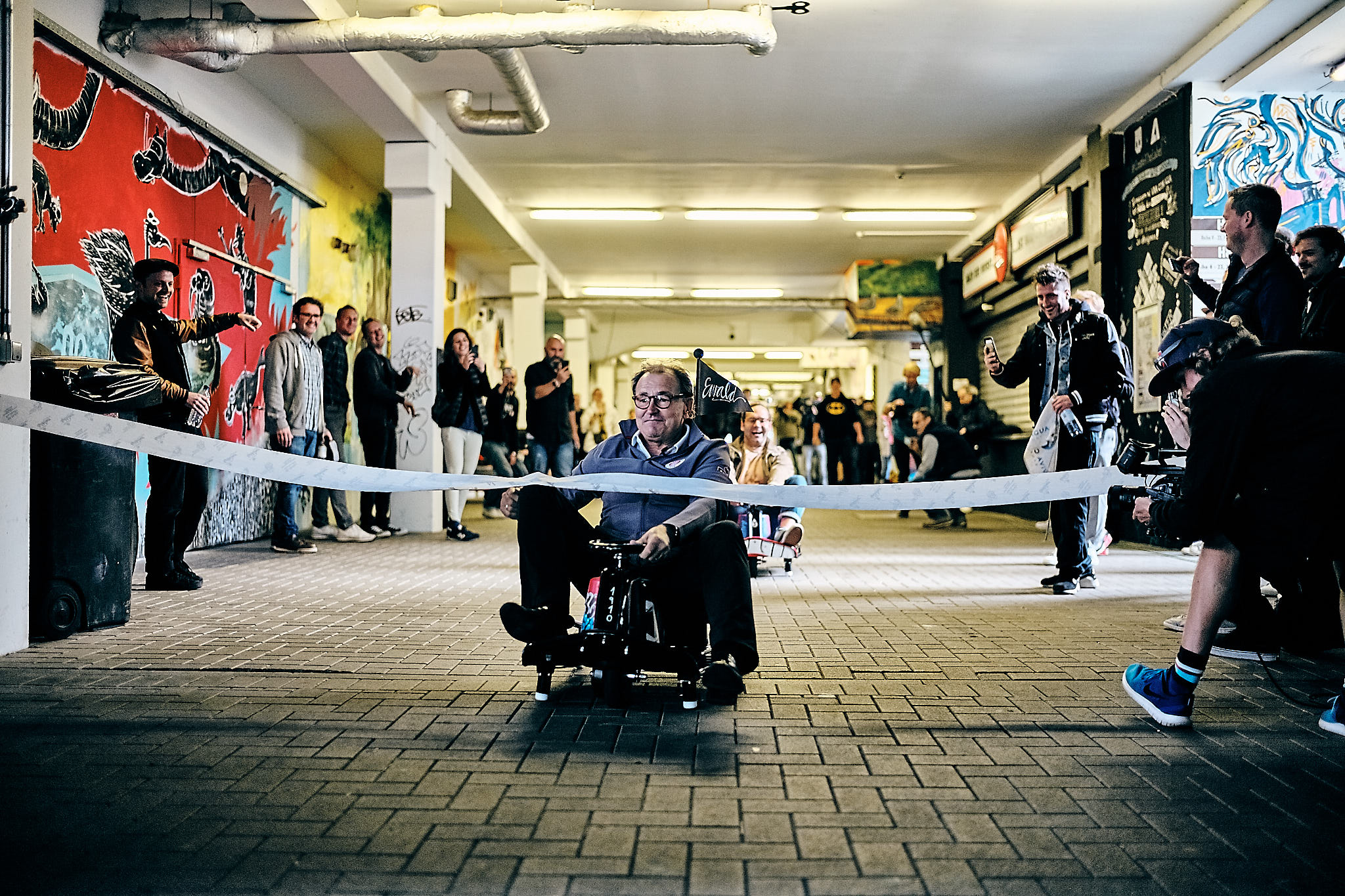 Die erste eCart Weltmeisterschaft wurde in zwei Halbfinale und natürlich einem Finale ausgetragen. Zunächst fuhren Nico Rosberg und Michael Fritz auf die Strecke. Micha hatte extra einen weiten Blouson angezogen, der seinen Körper aerodynamisch verdoppelte. Nico Rosberg gewann locker. Das zweite Halbfinale zwischen Ewald Lienen und Bosse verlief deutlich spannender. Lange Zeit fuhren beide nebeneinander. Erst als Ewald seinen Kontrahenten während der Fahrt fragte, „willst du etwa ins Finale?“ konnte er an Bosse vorbeiziehen.