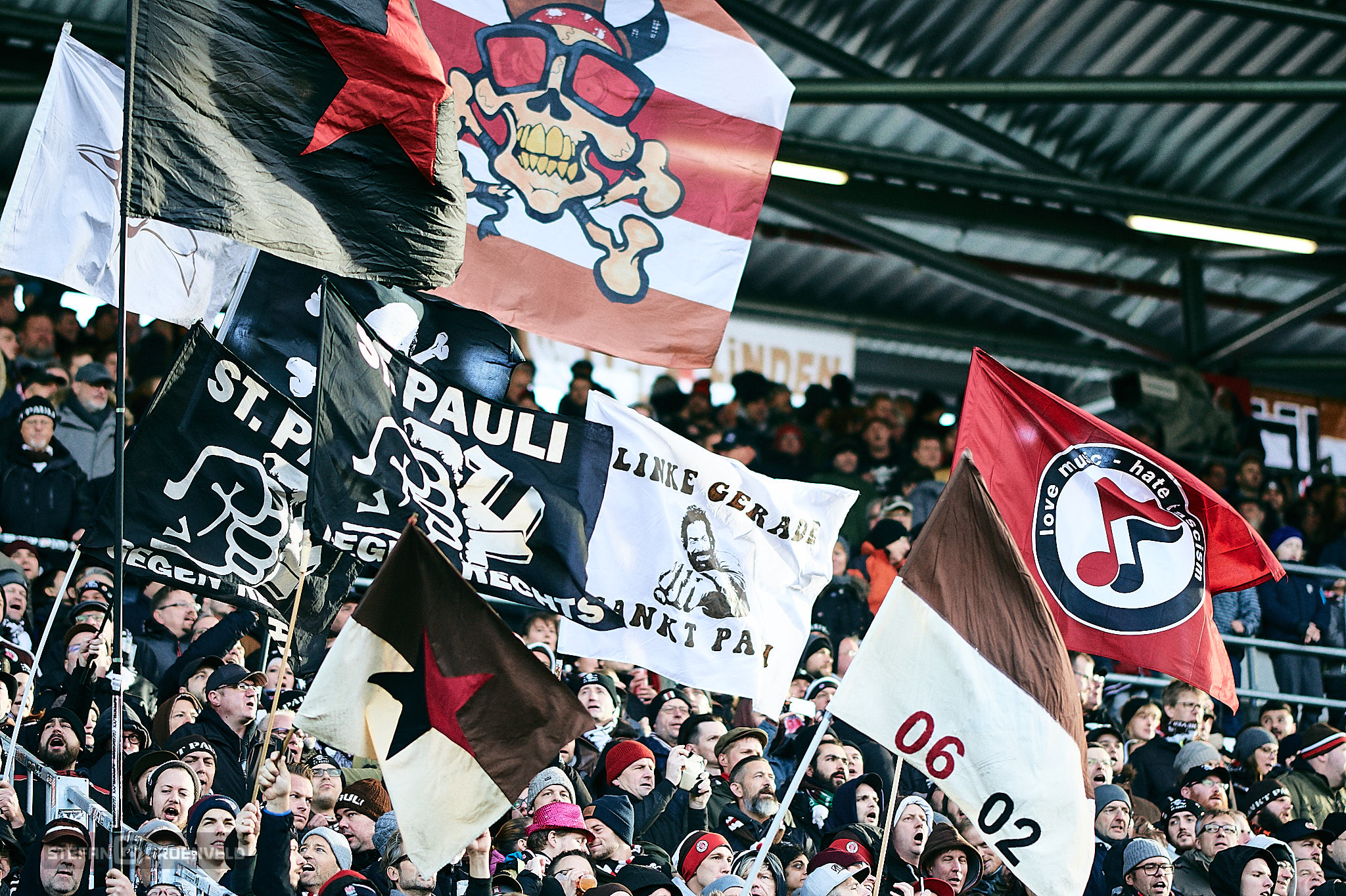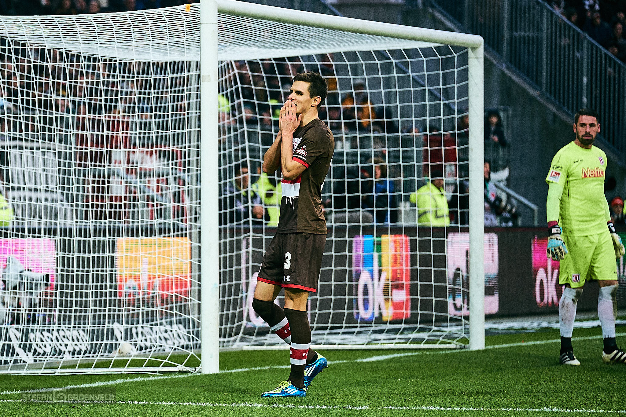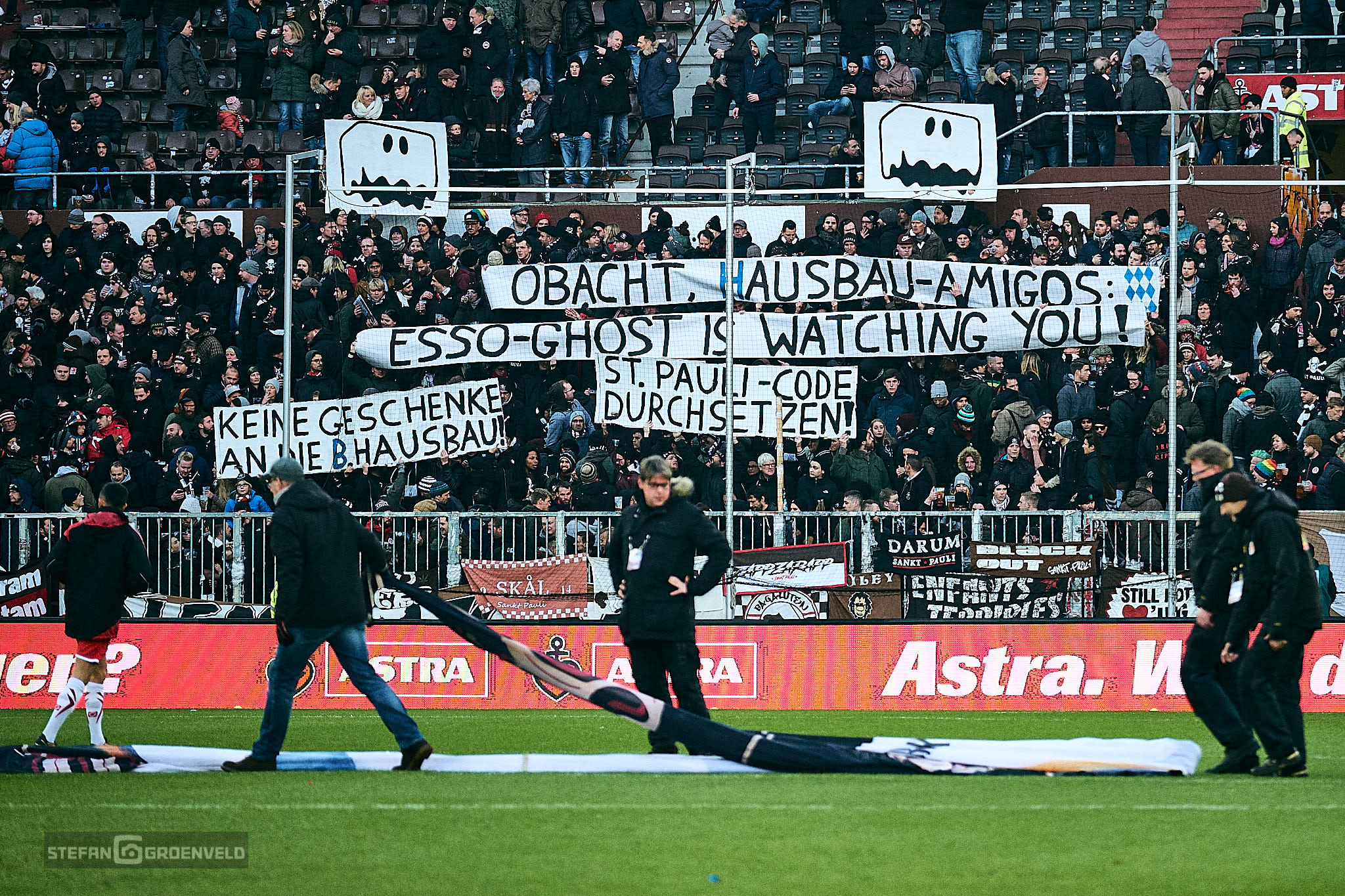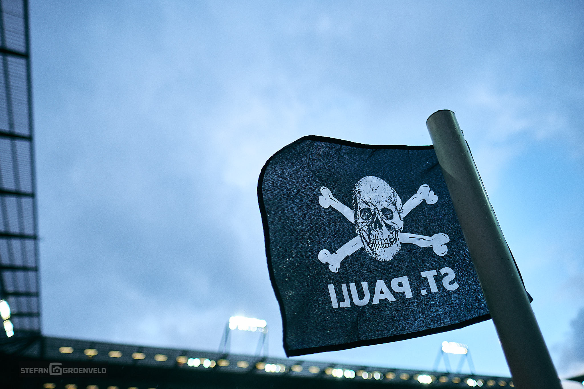 Ein halbe Stunde sind die Männer in braun und weiß überrascht, dass sie gegen ein Team mit einer Idee vom Spiel antreten. Jahn Regensburg ist am Millerntor zunächst immer näher am Ball, setzen den Gegner unter Druck, die eigenen Pässe kommen an und noch bevor es der FC St. Pauli schafft, erstmals auf des Gegners Tor zu schiessen, steht es auch schon 0:2 gegen das Heimteam. „Aufwachen, Aufwachen“ skandieren die Fans. Olaf Janssen wechselt gleich doppelt und die nächsten zwei Torschüsse sind dann auch drin. 2:2 zur Halbzeit, auch wenn der Ausgleich kurz vor der Pause aus nicht mal knapper Abseitsposition erzielt wird. Egal, das macht Hoffnung für die zweiten 45 Minuten.