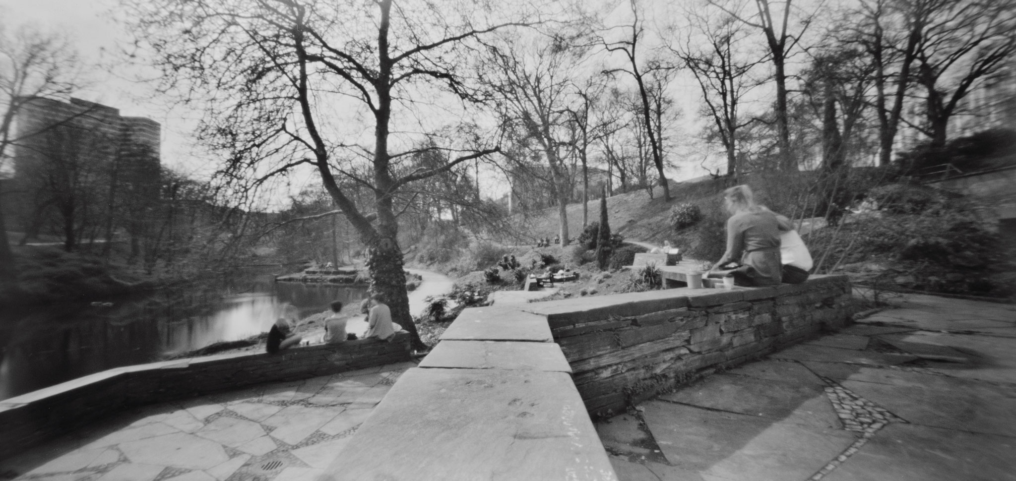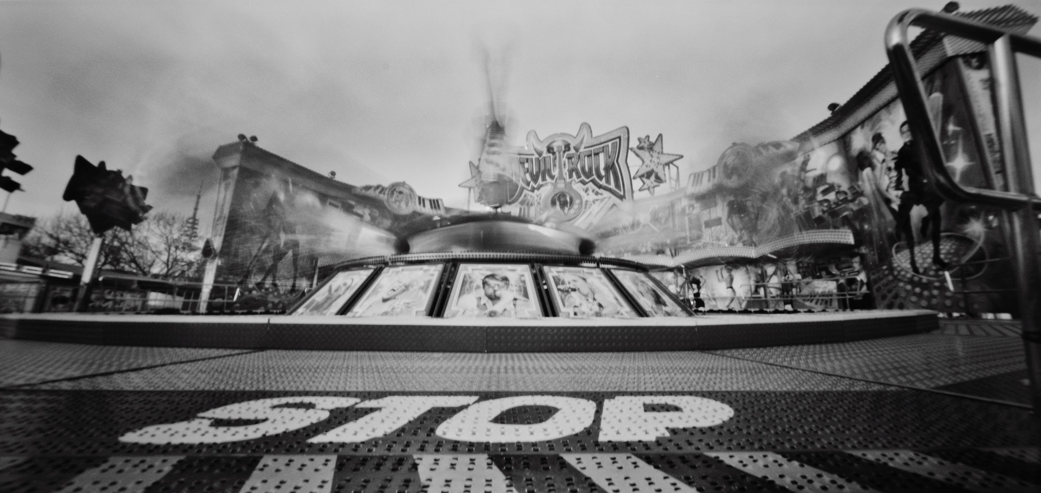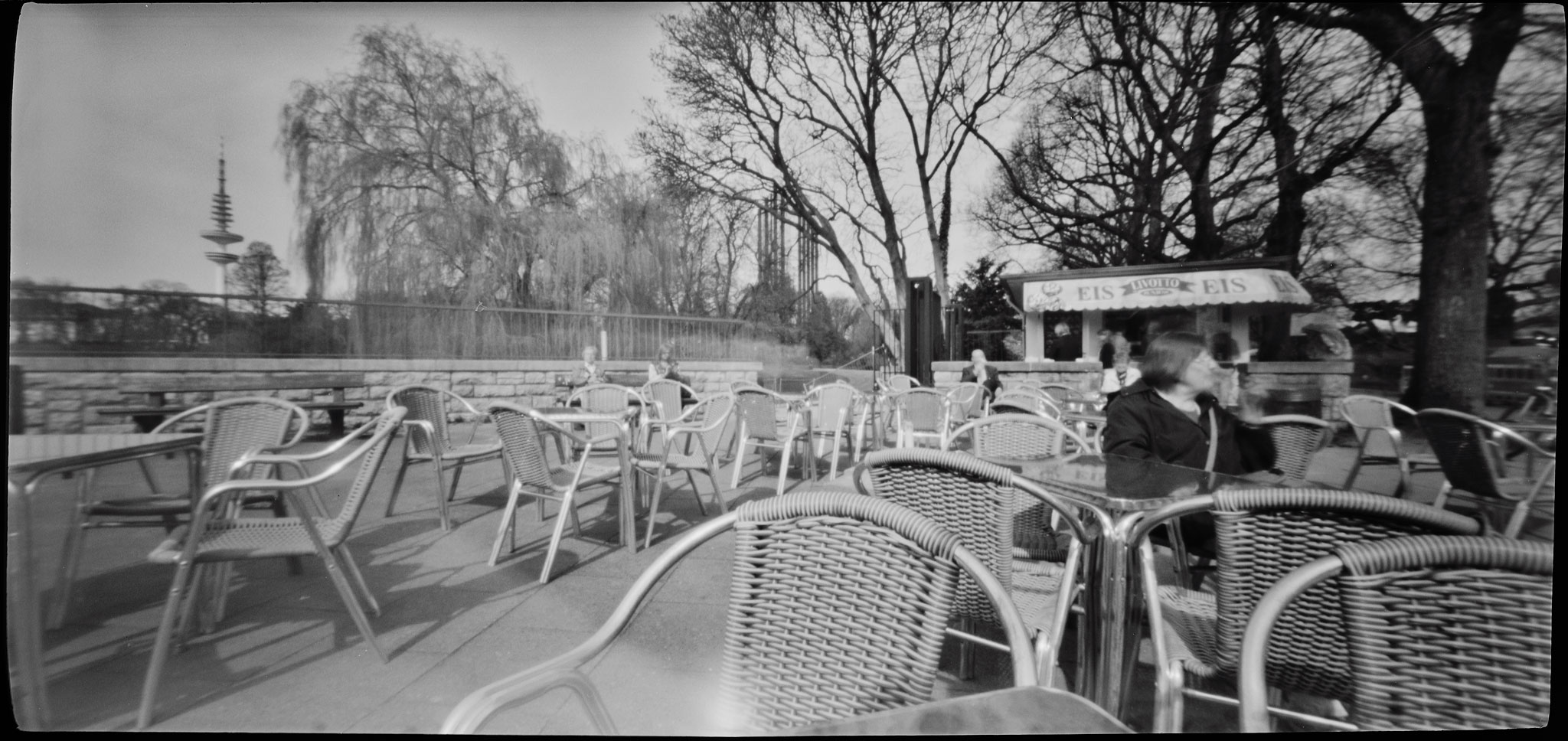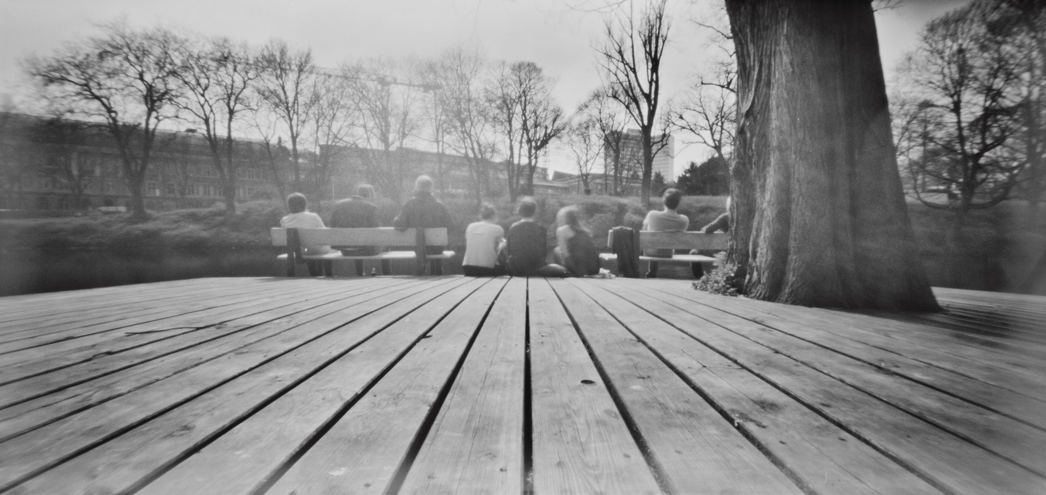 Nun bedingt die Physik, dass natürlich Dinge, die weiter vorne sind, schärfer abgebildet erscheinen als weiter entfernte. Da die Brennweite mit 40mm angegeben ist – was im Querformat auf Kleinbild umgerechnet ca 13mm bedeutet – lohnt es sich eh, nah an die Dinge ranzugehen, die du gerne fotografieren möchtest. Auf Grund der enormen Weite des Negativs – die Kamera heißt Lerouge 612, weil sie im Format 6x12cm abbildet (exakt 54mm x 114mm) – sind die Ränder allerdings schnell unschön verzerrt. Es gibt eben auch keine korrigierenden Linsen im System, die diese Verzerrung korrigieren könnten. Du solltest also darauf achten, keine Menschen an den Bildrand zu postieren.