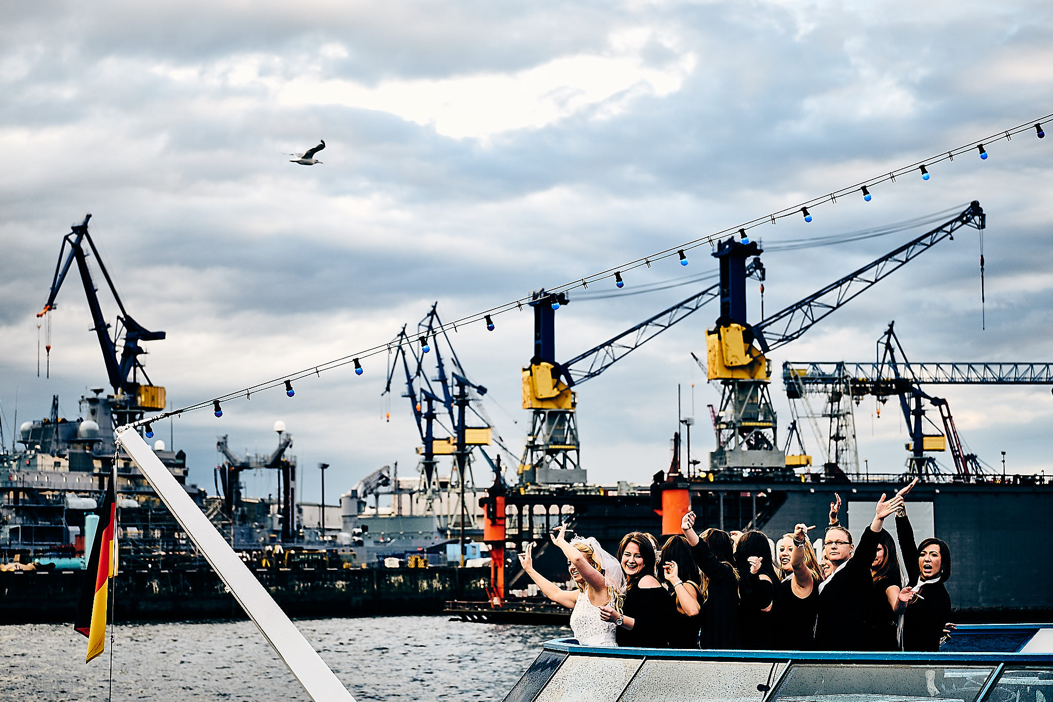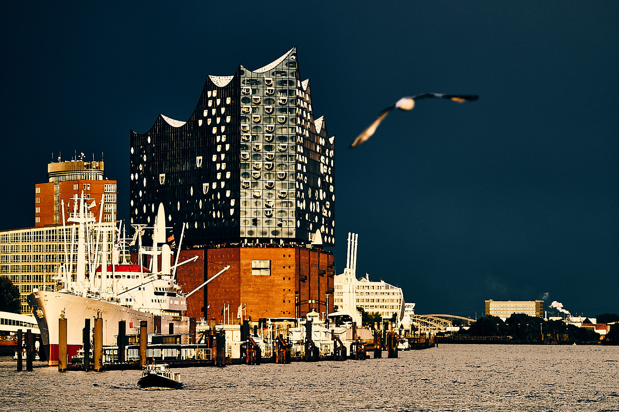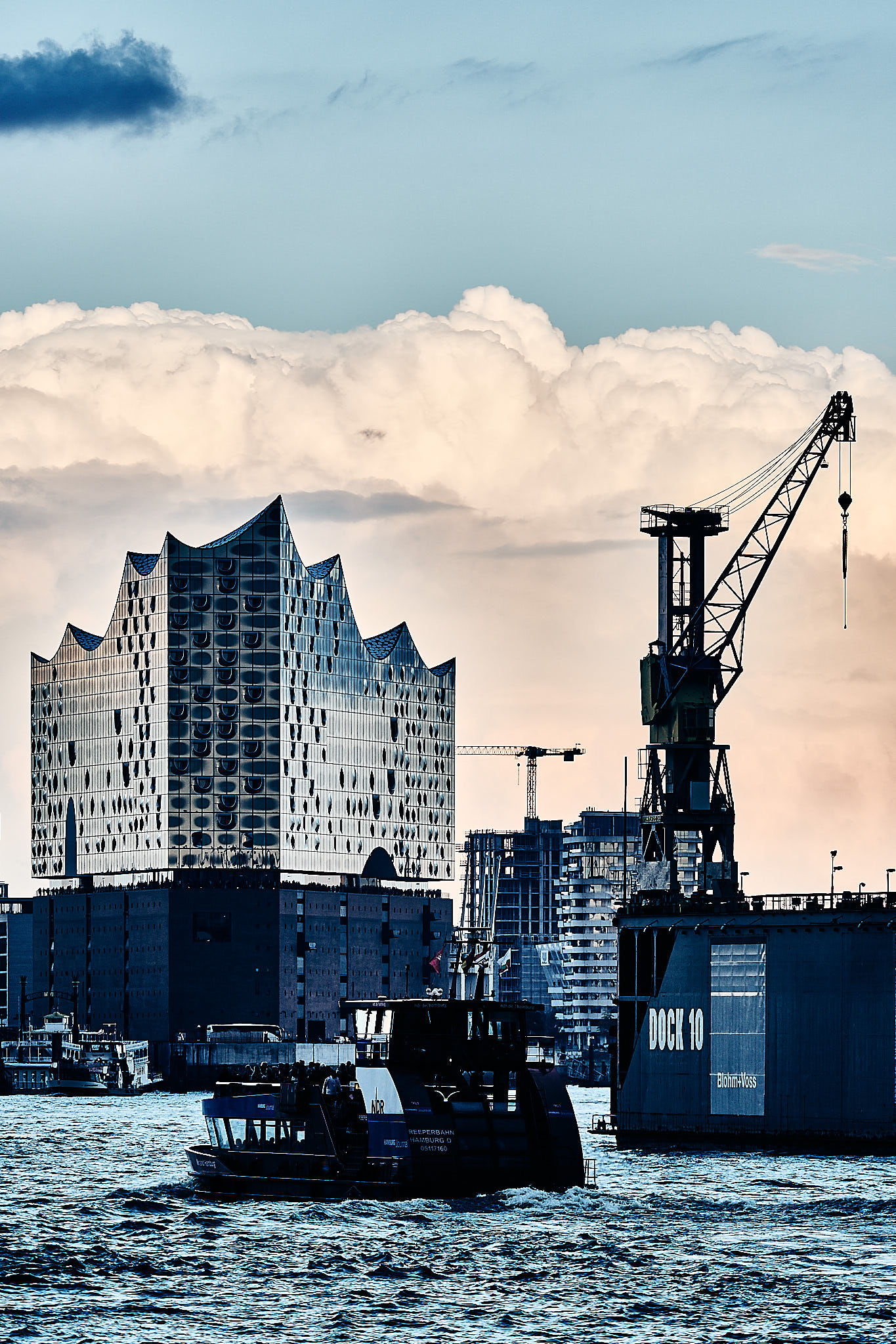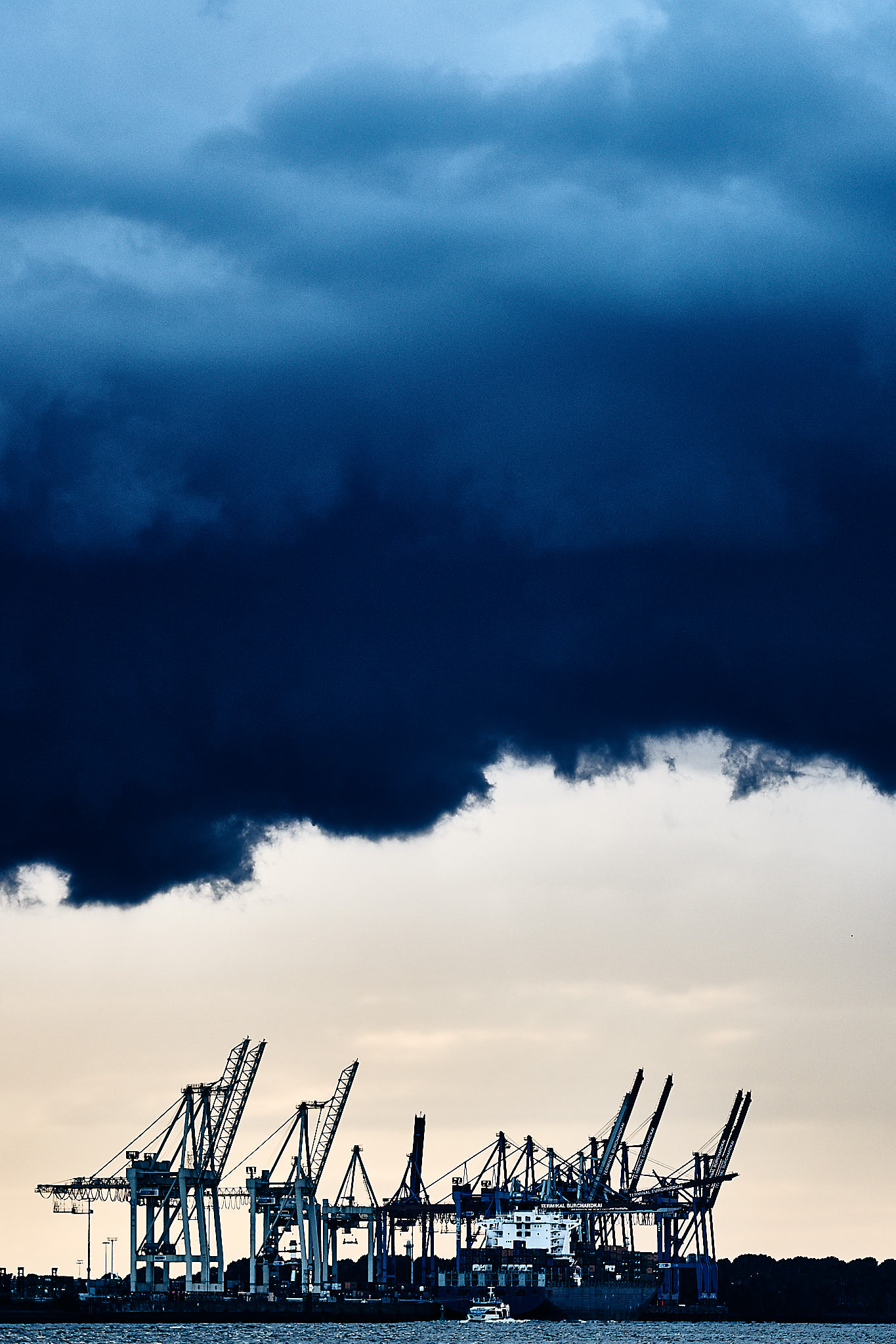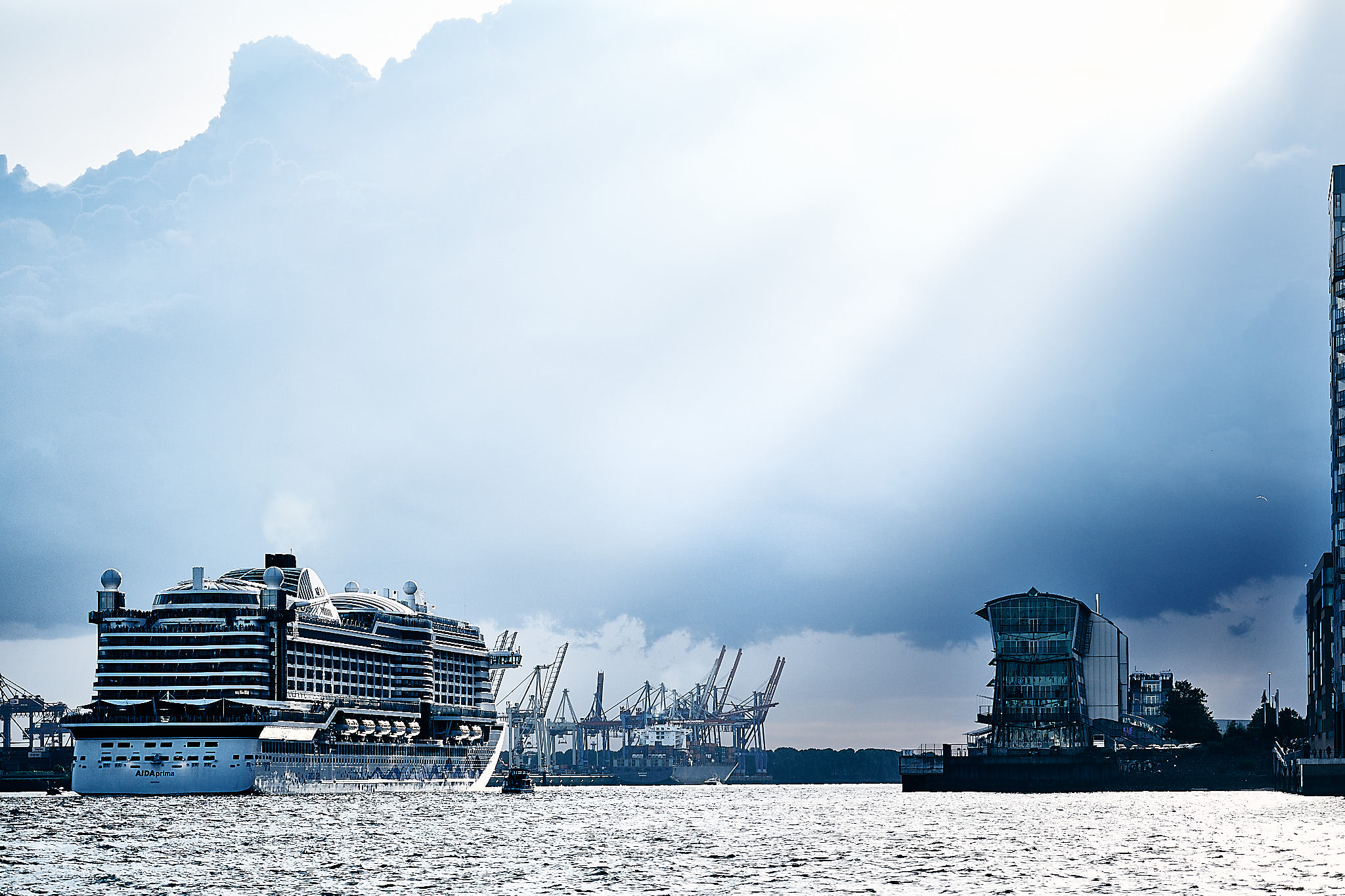 Kaum angekommen, verlässt die Aida Prima den Hafen. Und wenige Minuten später zeigt sich das Hamburger Wetter von seiner besten und vielseitigen Seite. Fast zwei Stunden haben wir dann bei Sonnenschein und strömenden Regen am Hamburger Hafen fotografiert als wären wir das erste Mal da. Dabei hatten wir sehr viel Spaß und haben unsere übliche Herangehensweise ziemlich über Bord geworfen. Ich weiß auch wirklich nicht, wann ich zuletzt mit einer langen Brennweite freiwillig unterwegs war. Normalerweise nutze ich die nur am Spielfeldrand von Sportereignissen.