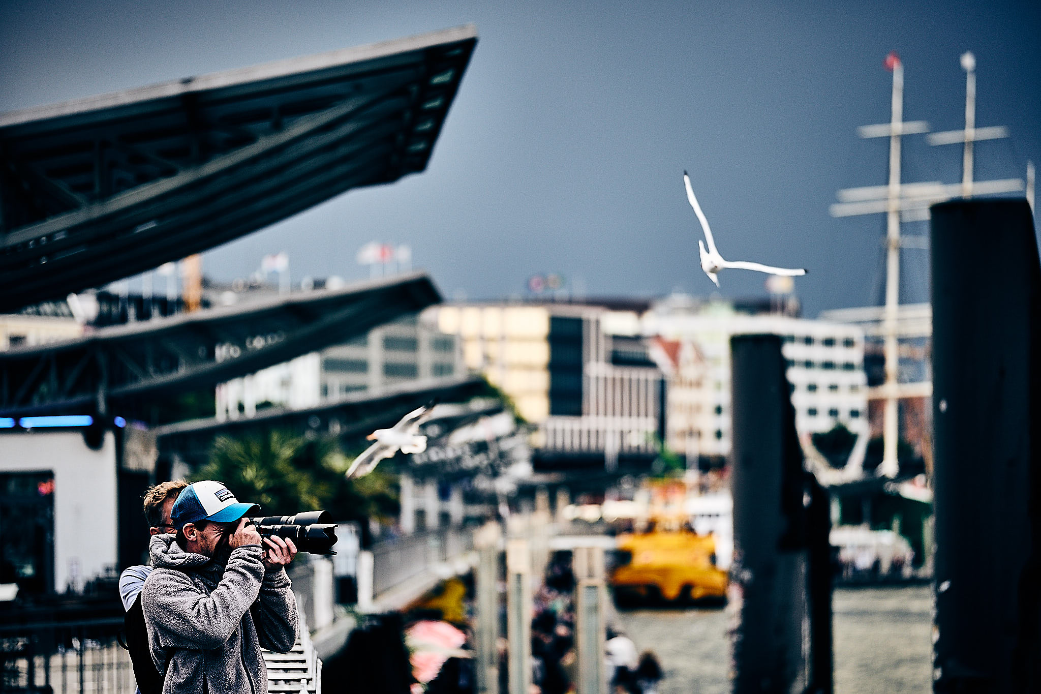 Manchmal gibt es Zufälle, die glaubt einem niemanden und sorgen für jede Menge Spaß trotz völlig atypischen Fotografierverhaltens. Und das kam so: ich sitze im less political bei einem guten Kaffee als völlig unabhängig voneinander und ohne es voneinander zu wissen, zeitgleich meine Fotobuddys Bjørn und Stefan reinkommen. Bjørn hatte sich gerade bei IPS das 50-140/2.8* für seine Fuji X-T20 ausgeliehen. Natürlich wollte er die Linse gleich mal in Action sehen. Tja, aber was tun mit so einer langen Brennweite? Lass mal zum Hamburger Hafen fahren, da können wir wenigstens ein paar Möwen fotografieren…