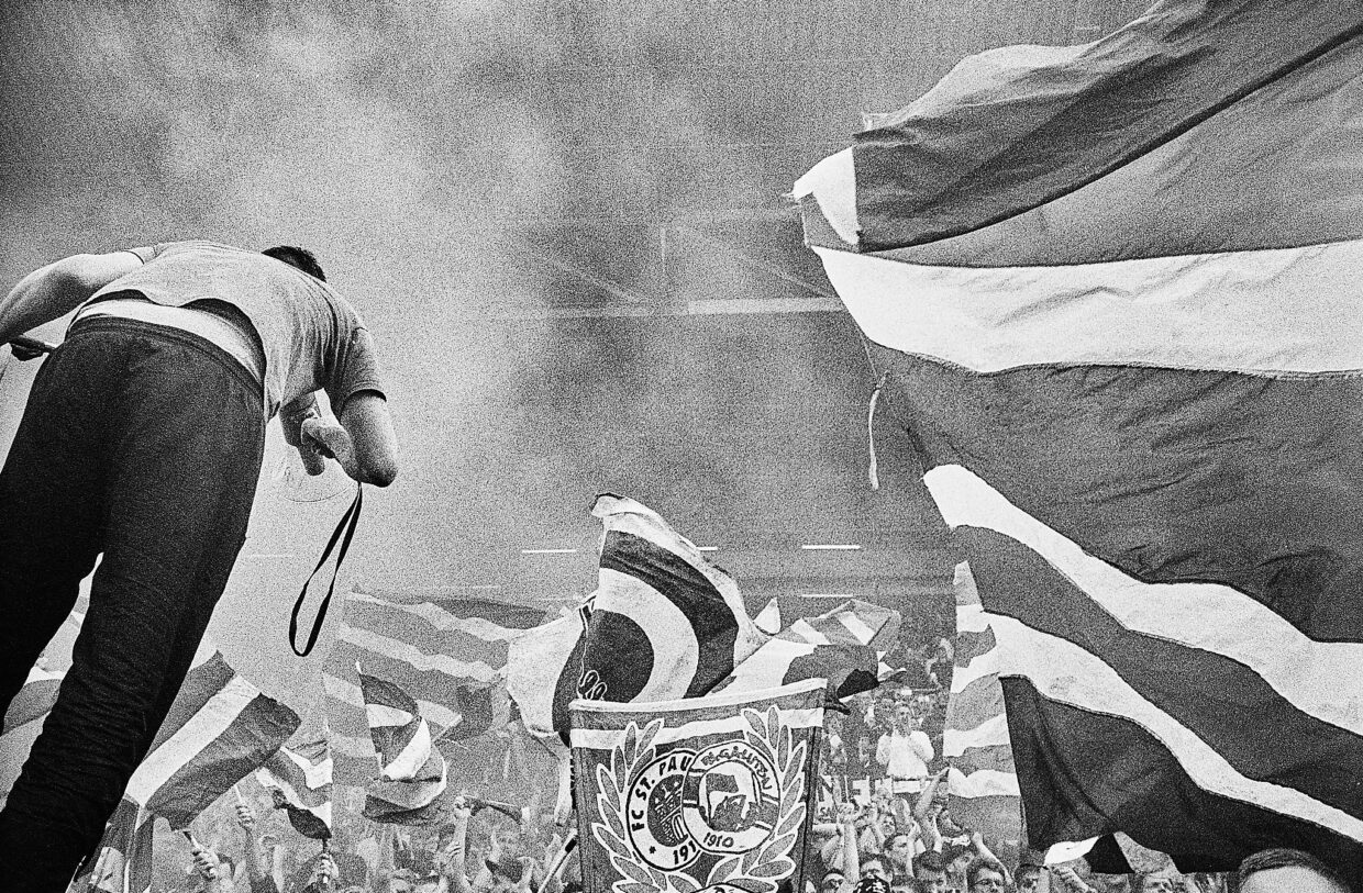 Am Sonntag hatte ich dann noch einen Film in der Kamera, und ich wollte doch wissen, ob die Kamera auch wirklich funktioniert. Also nahm ich sie mit ins Millerntor und habe – hauptsächlich – bei der Schlussrunde des Teams noch ein paar Fotos gemacht. Und siehe da: Ja, sie funktioniert. Die Ästhetik des Films lässt fast einen Zeitsprung vermuten. Vielleicht geht das aber auch nur mir so, denn als ich das Fotografieren am Spielfeldrand lernte, schrieben wir das Jahr 1984 und Digitaltechnik war gerade auf grobschlächtigen Uhren mit fetten Ziffern angekommen.