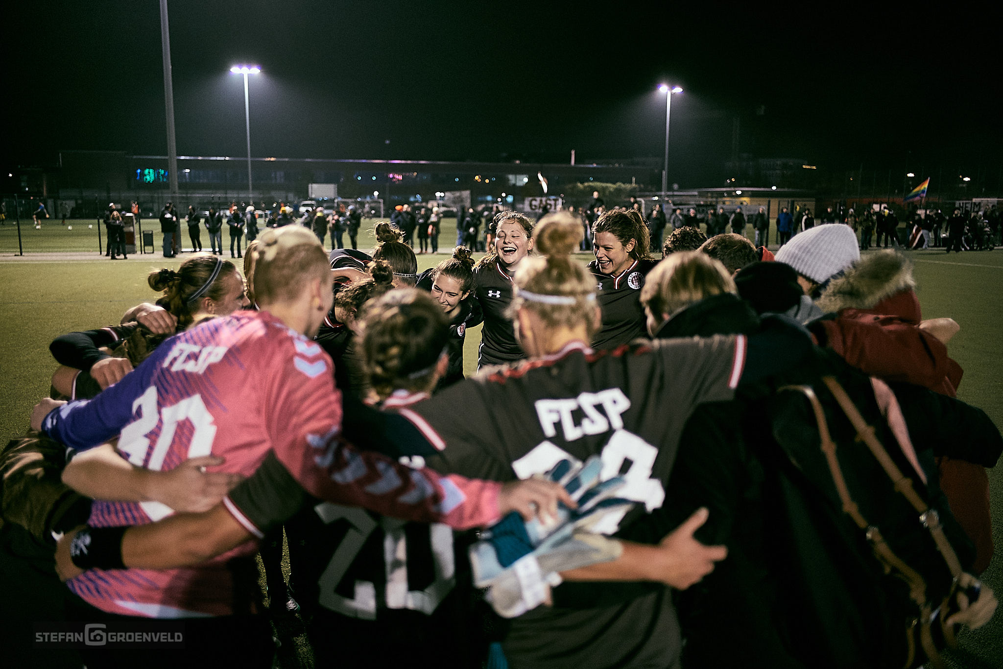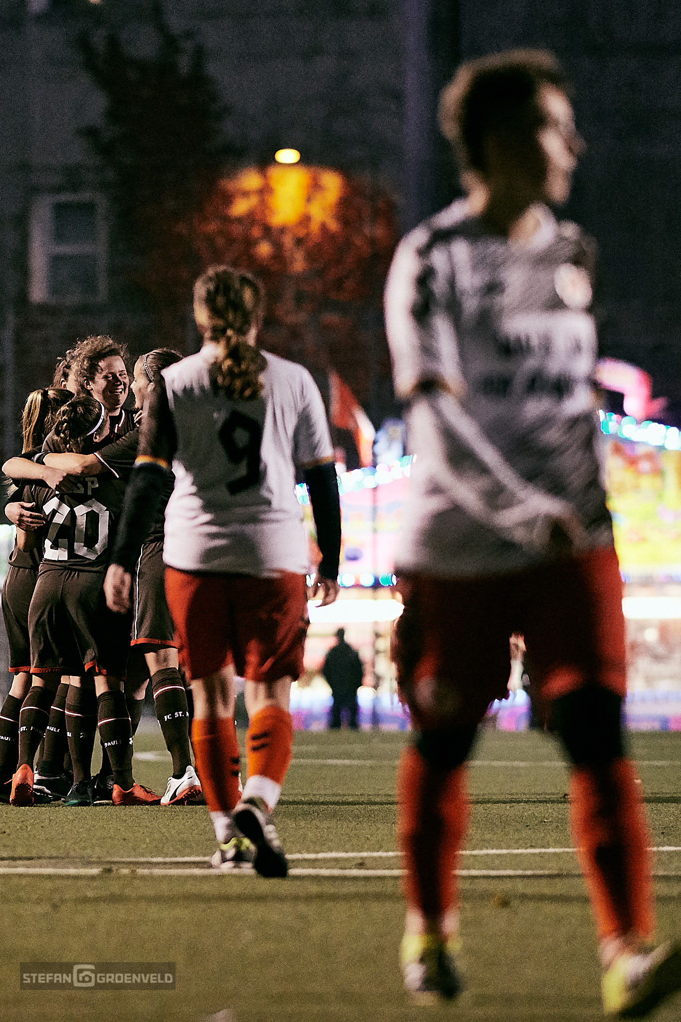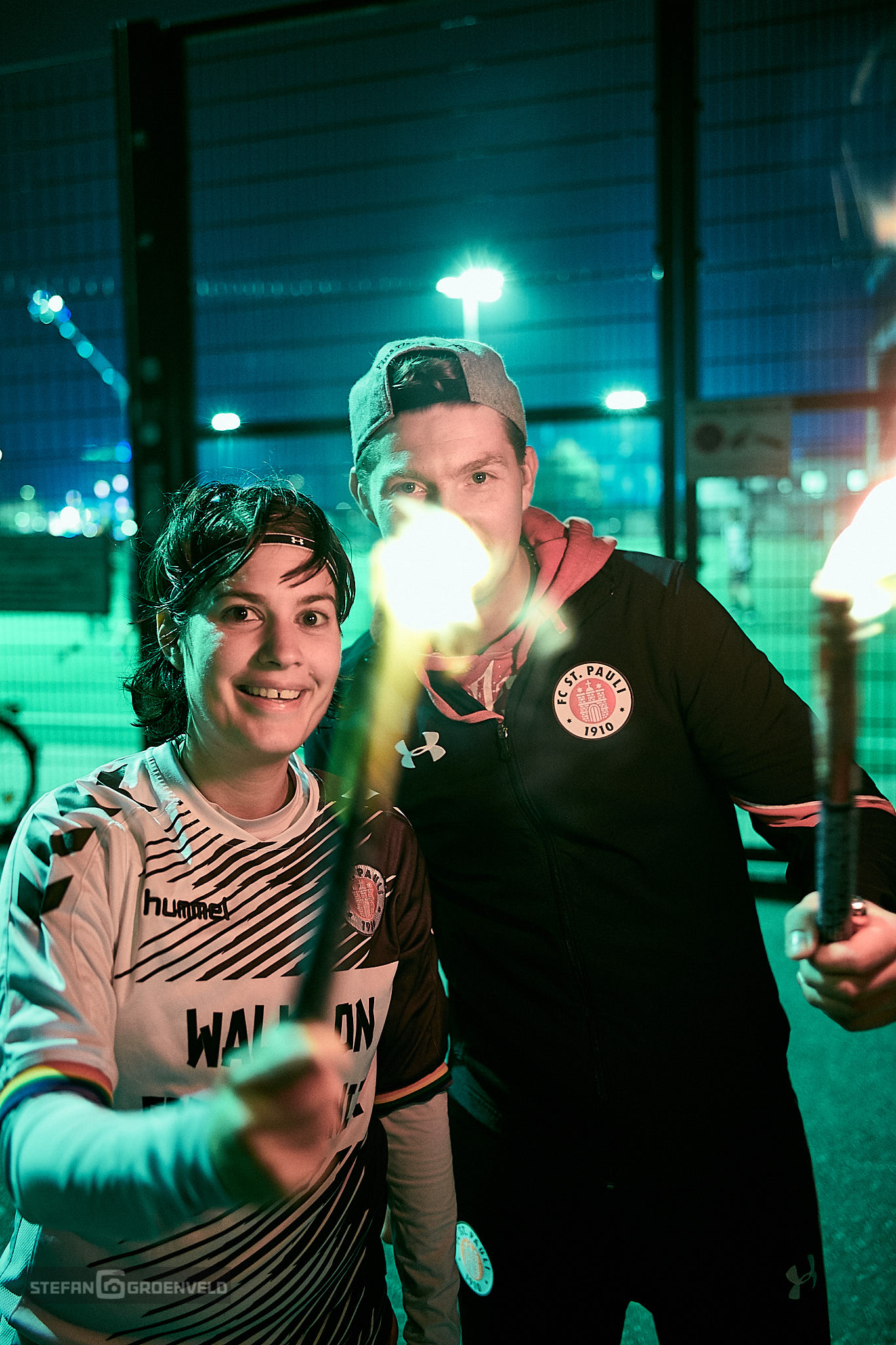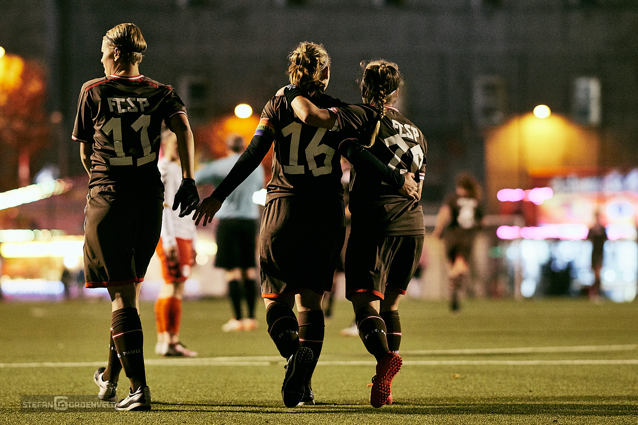Ja, das war etwas merkwürdig in der Feldarena: FC St. Pauli spielt gegen FC St. Pauli – der Pokal hat eben seine eigenen Gesetze. Und so spielten die 1. Frauen als Gast bei den 2. Frauen gestern Abend um den Einzug in die nächste Pokalrunde. Die Supporter teilten sich brav in Heim und Gastfans auf, aber feierten trotzdem irgendwie zusammen. Die Spielerinnen jubelten bei ihren Toren kaum, außer beim zwischenzeitlichen 1:2 Anschlußtreffer der 2. Und am Ende gab es eine gemeinsame Feierwelle mit den Fans. Ein gemeinsames Gruppenbild war dann auch noch drin. Das Ergebnis spielte kaum eine Rolle – irgendwann hatten alle aufgehört zu zählen. Man einigte sich auf ein klassisches 19:10.