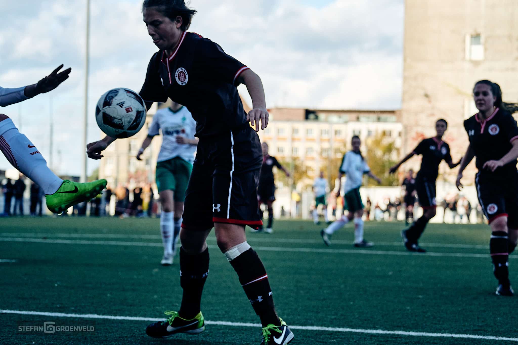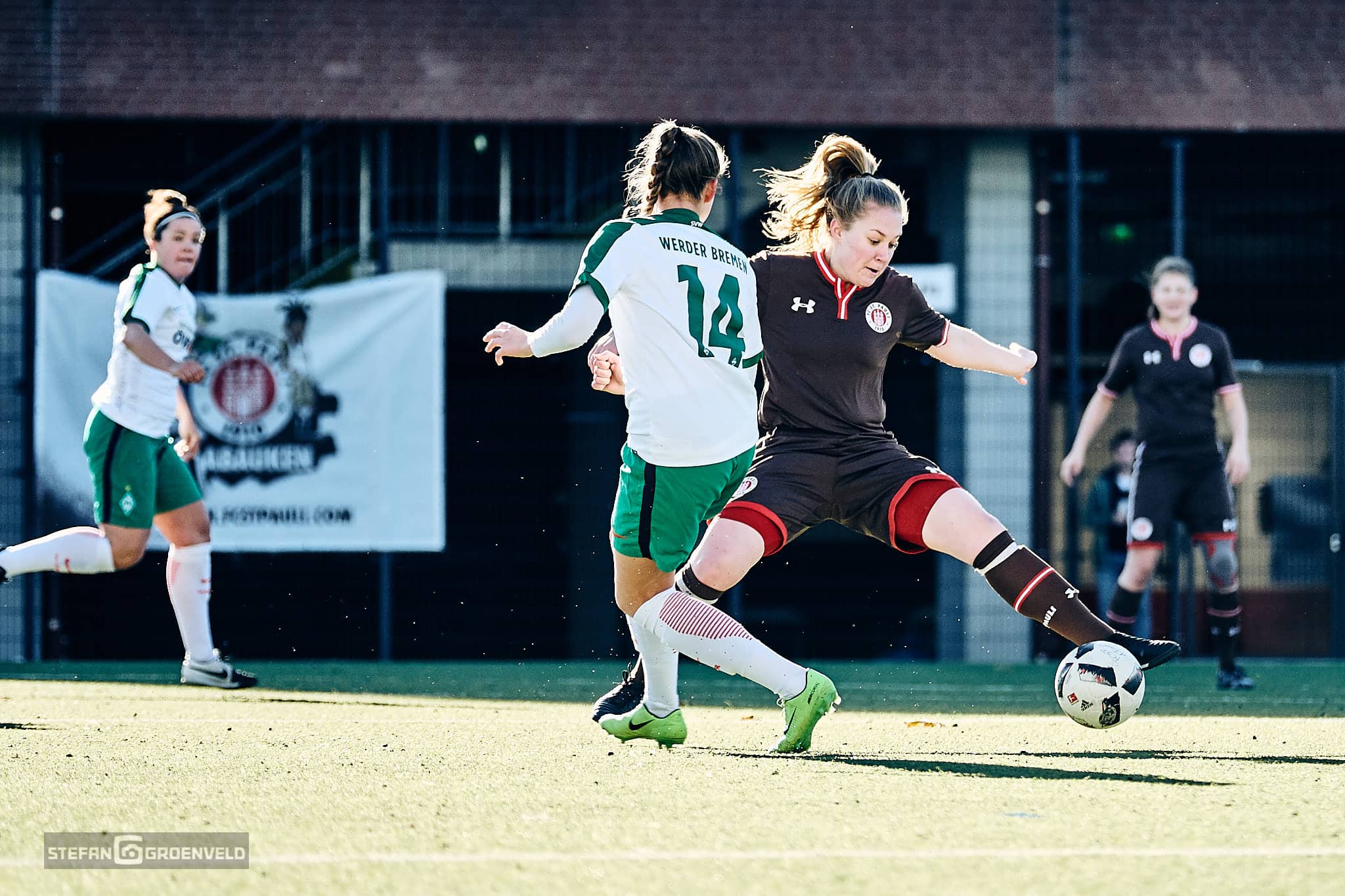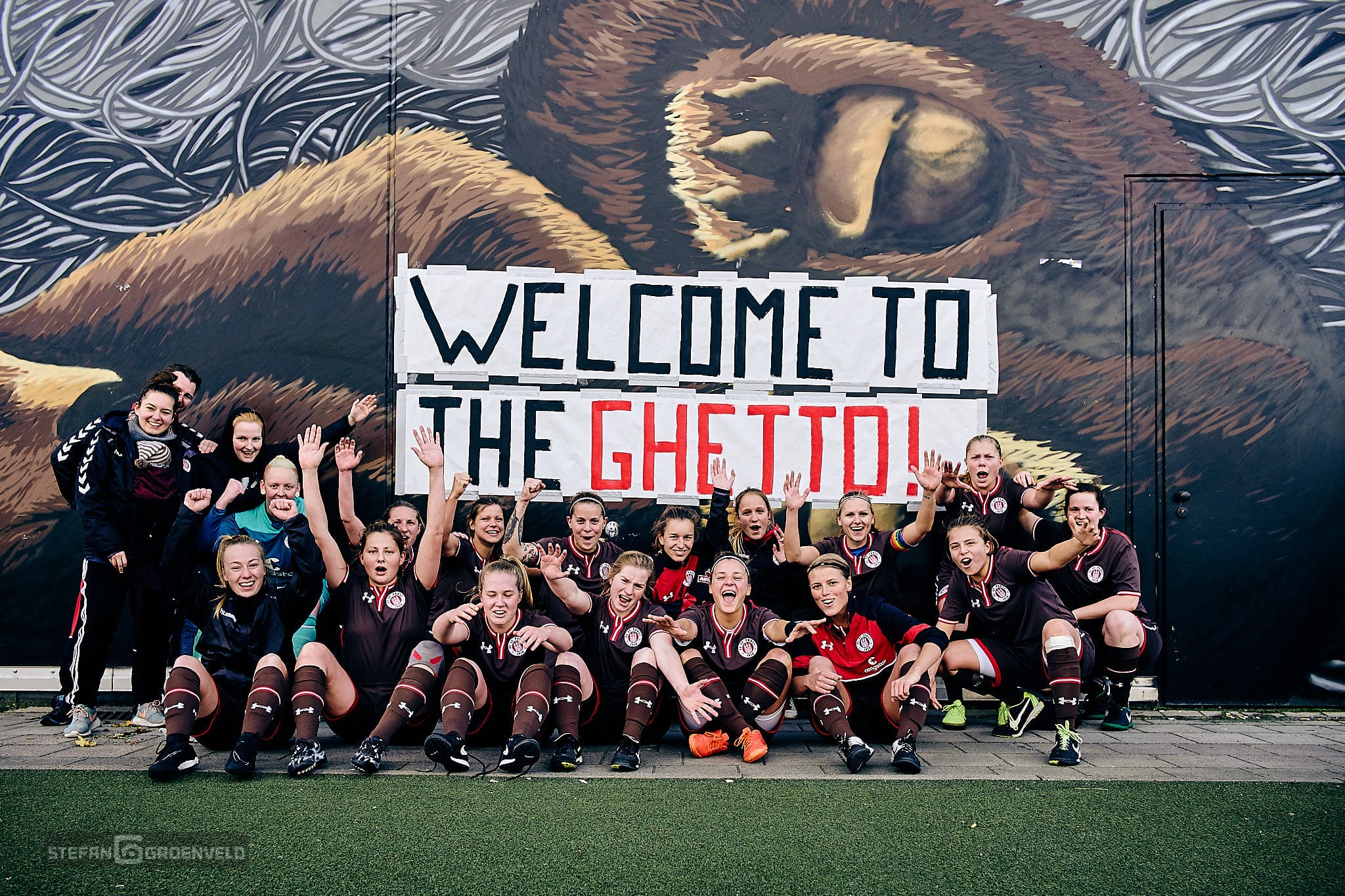 „Welcome to the Ghetto“ steht in großen selbstgemalten Lettern in der Einlaufecke. „Welcome to the Ghetto“ dröhnt aus den selbstgebastelten Stadionbeschallung als die 1. Frauen vom FC St. Pauli und die 2. vom SV Werder Bremen das selbstgemalte Grün betreten. Das war es auch schon mit dem „Welcome“. Bremen kommt nie ins Ghetto und verliert verdient 3:0.