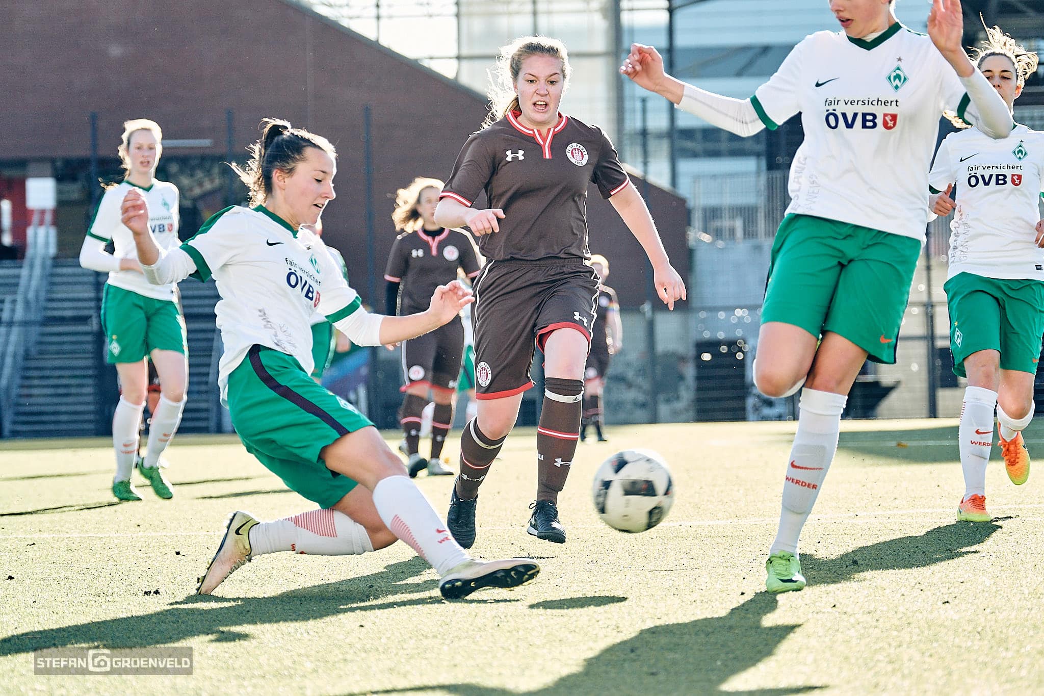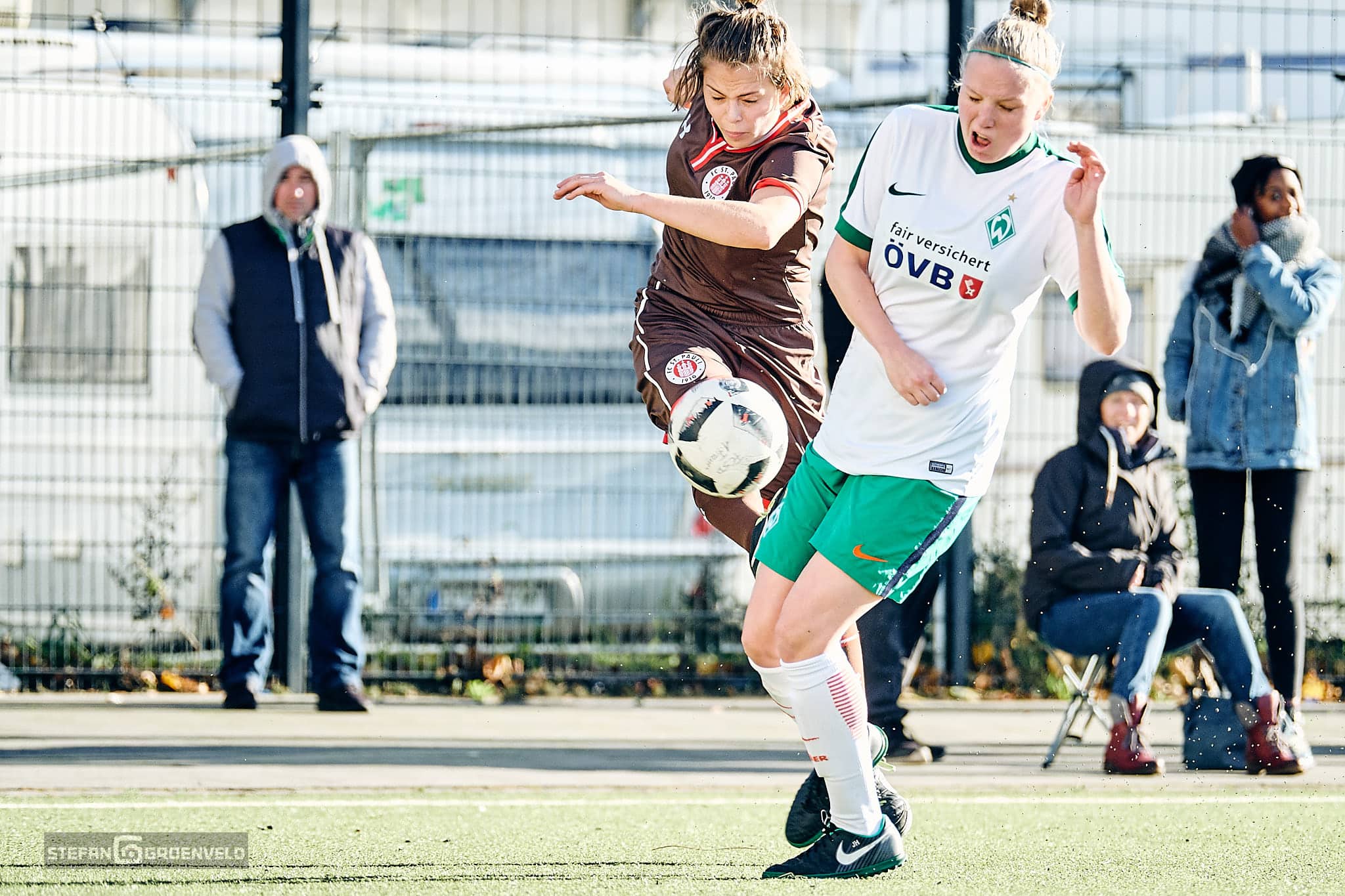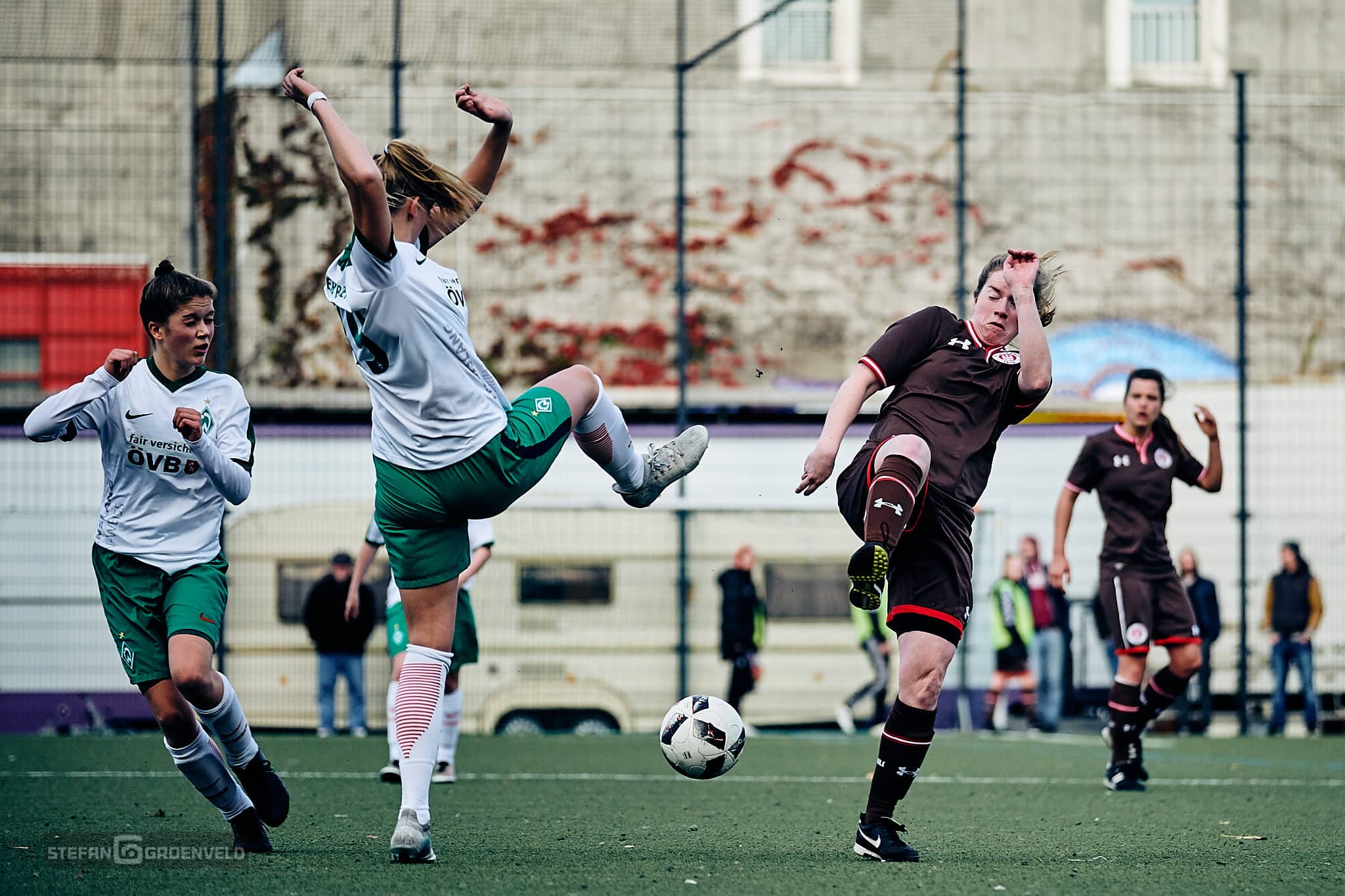 „Welcome to the Ghetto“ steht in großen selbstgemalten Lettern in der Einlaufecke. „Welcome to the Ghetto“ dröhnt aus den selbstgebastelten Stadionbeschallung als die 1. Frauen vom FC St. Pauli und die 2. vom SV Werder Bremen das selbstgemalte Grün betreten. Das war es auch schon mit dem „Welcome“. Bremen kommt nie ins Ghetto und verliert verdient 3:0.