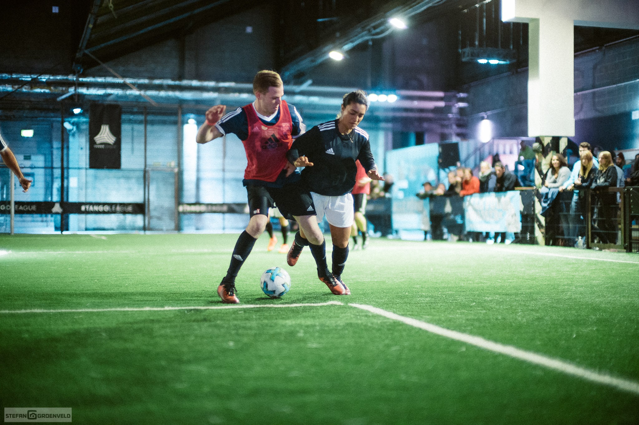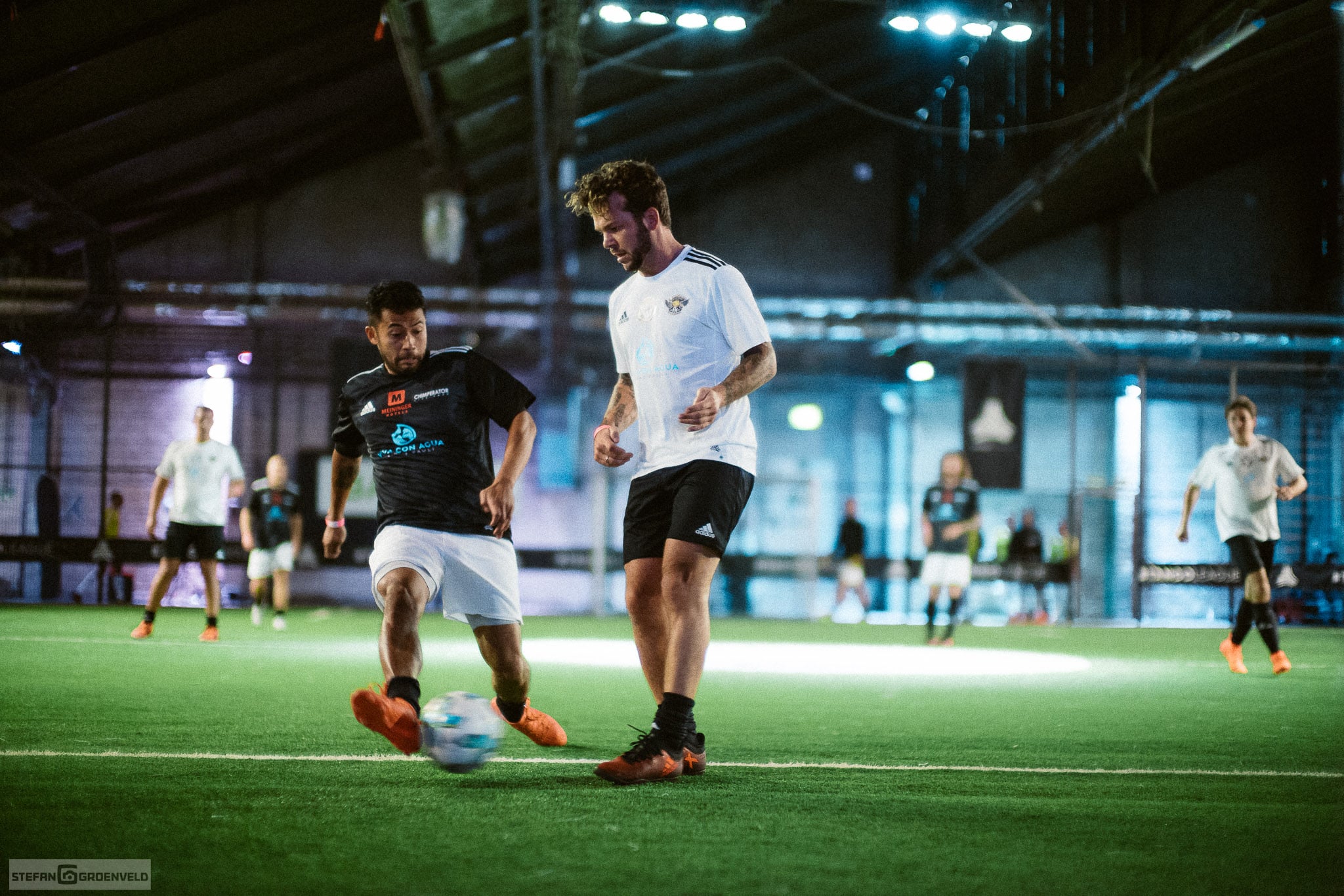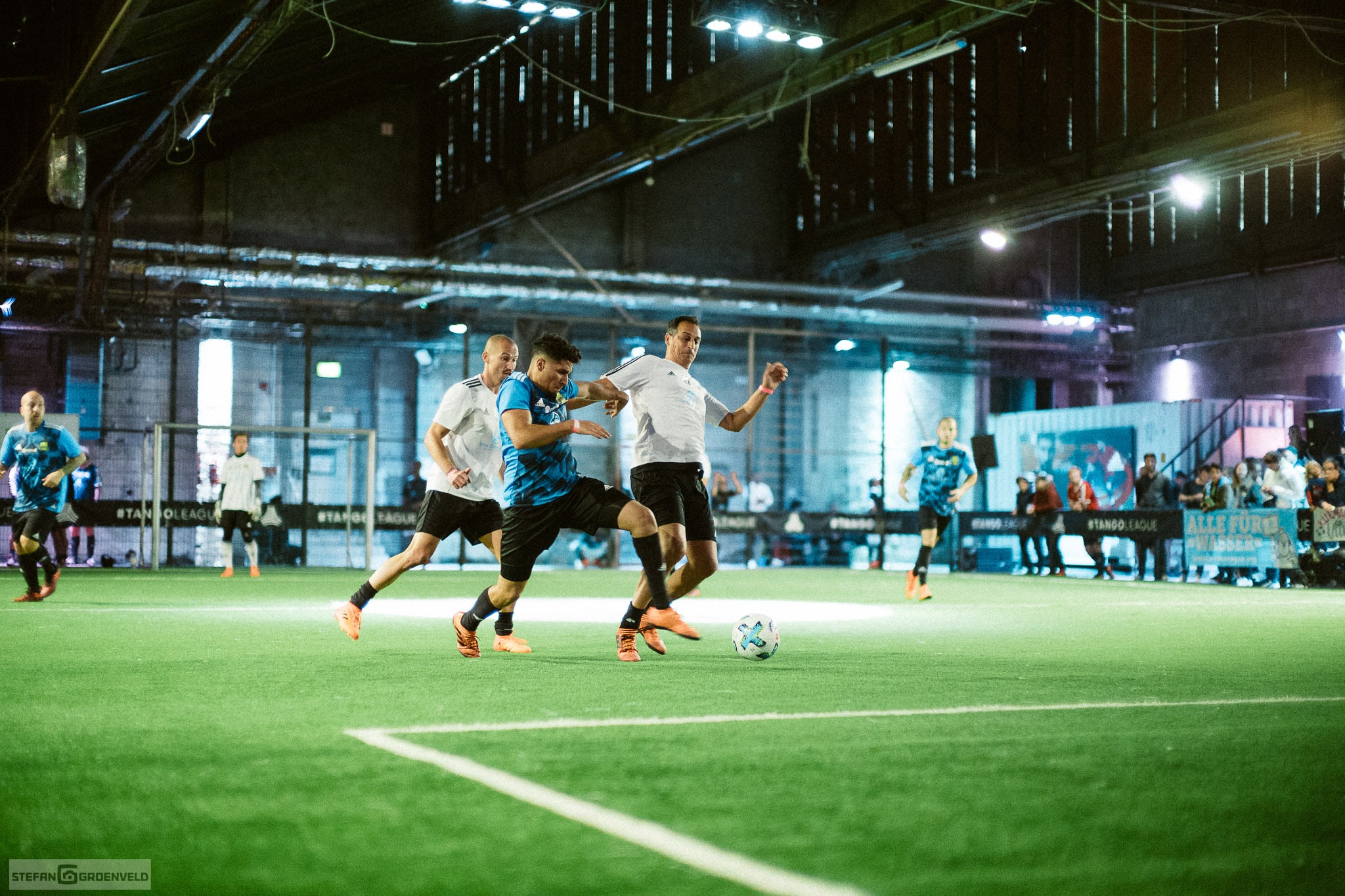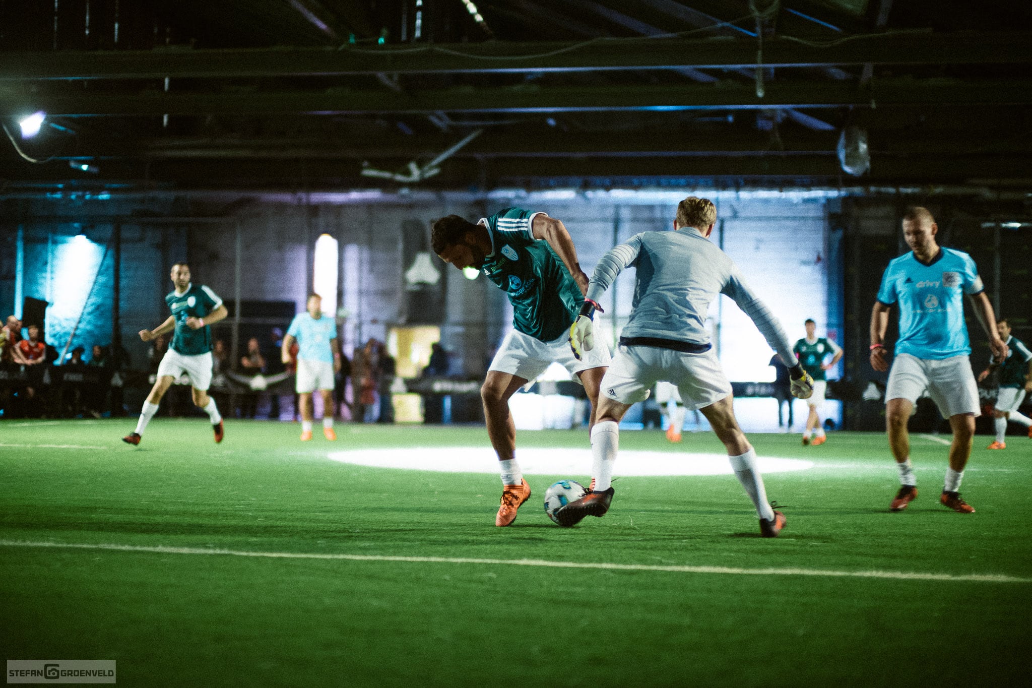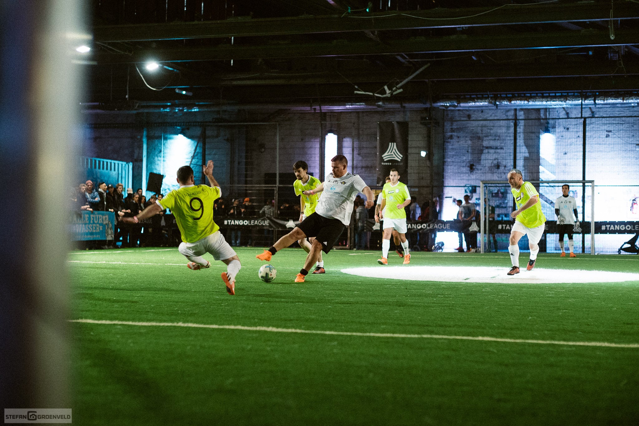 Soviel zum Sportlichen, jetzt kommt der sanfte Übergang zum technischen. Hast du schon mal in so einem modernen Indoor-Fussball-Dings fotografiert? Das Licht ist einfach grausam, wie immer, wenn etwas stylisch rüberkommen soll und doch nur Beton ist. Ich habe meine Fuji XT-2 jedenfalls schnell zur Seite gelegt, sonst würde ich heute noch darauf warten, dass der Autofokus mal was trifft. Ich habe die Sportfotos dann mit dem Noctilux bei Offenblende gemacht und trotzdem noch ISO3200 verwenden müssen. (Für die Nerds unter uns: d.h. selbst mit einer billigen f1.4er Linse wären ISO8000 angesagt gewesen. Problem war eben, dass das Spiel doch so schnell war, dass ich mit einer 1/250s Belichtungszeit fotografieren musste und selbst hier musste ich leichte Bewegungsunschärfen in Kauf nehmen.) 50mm schränken die Möglichkeit zu fotografieren zwar ziemlich ein, aber ich kann warten. Und bei dem Licht interessiert das Tor auf der anderen Seite sowieso nicht…
