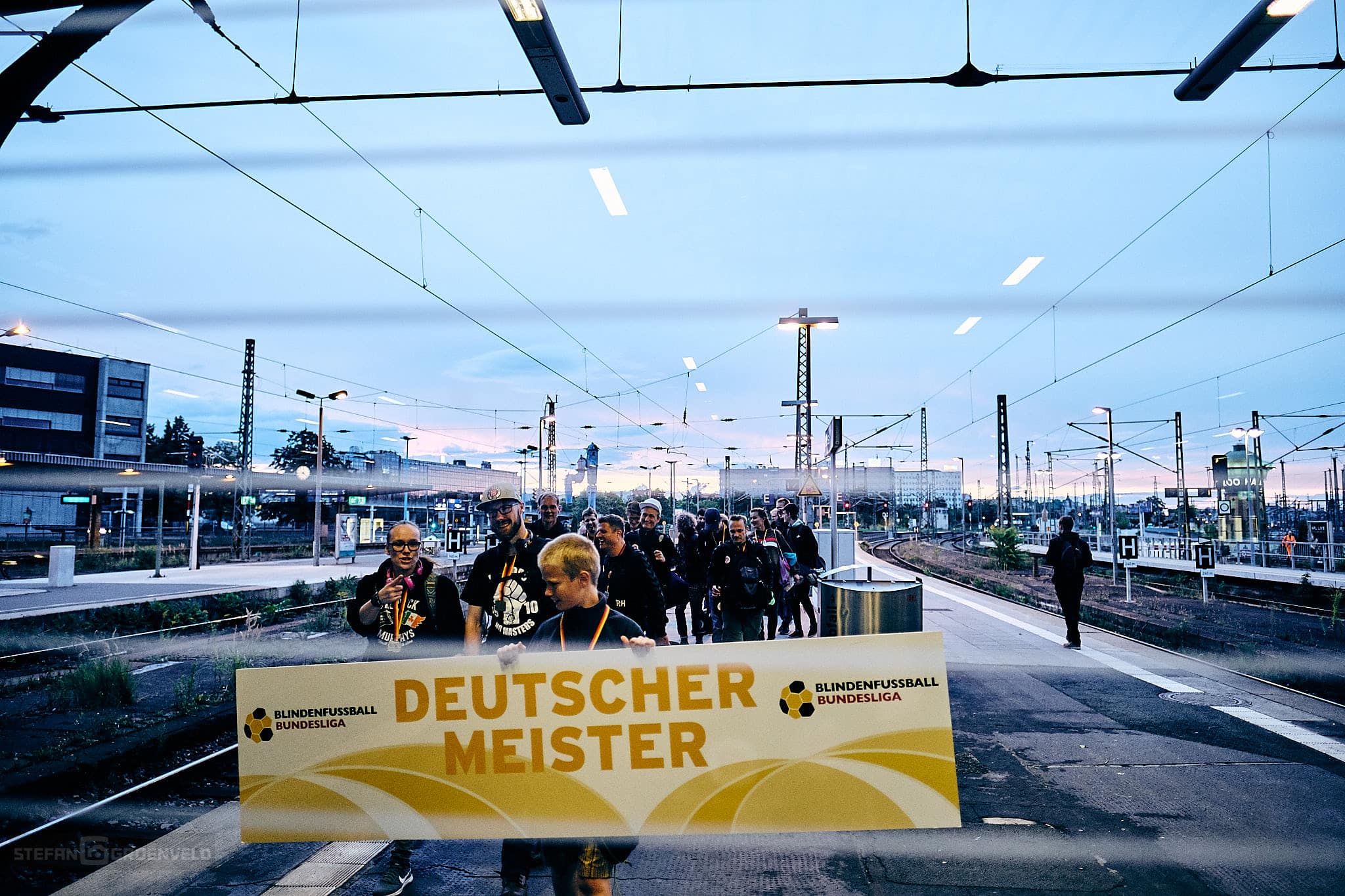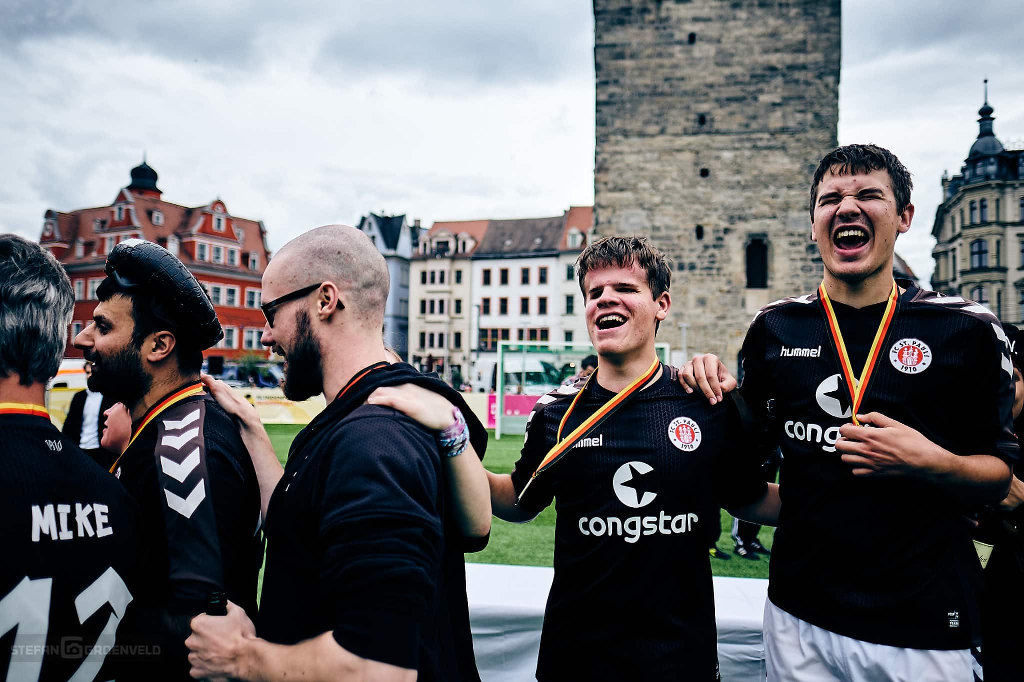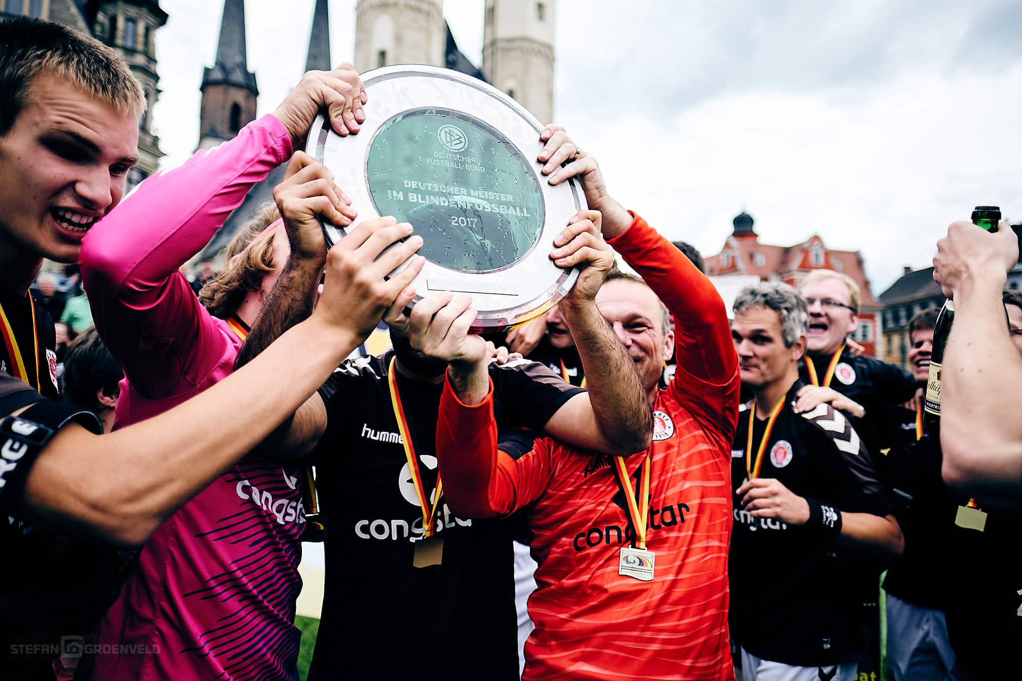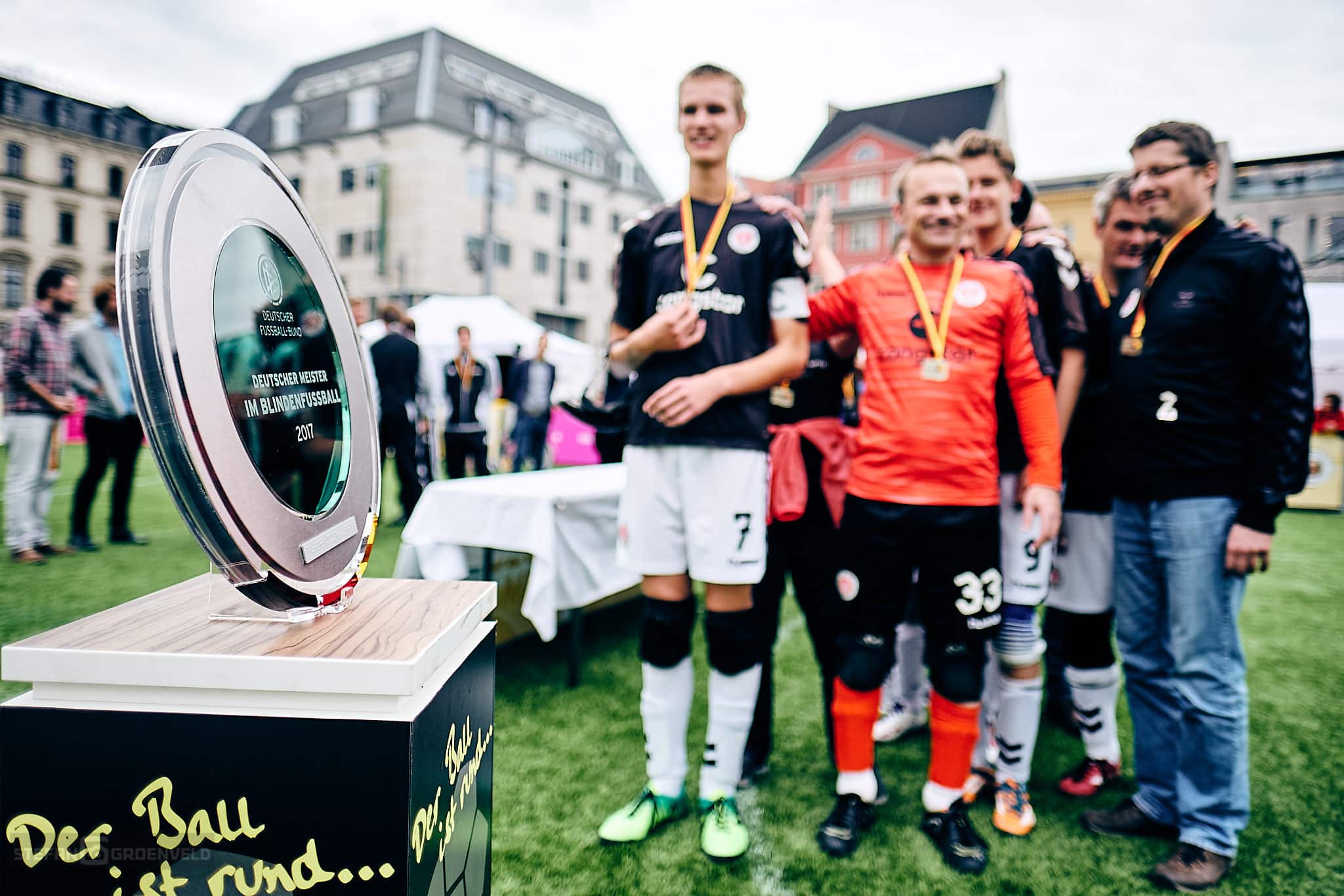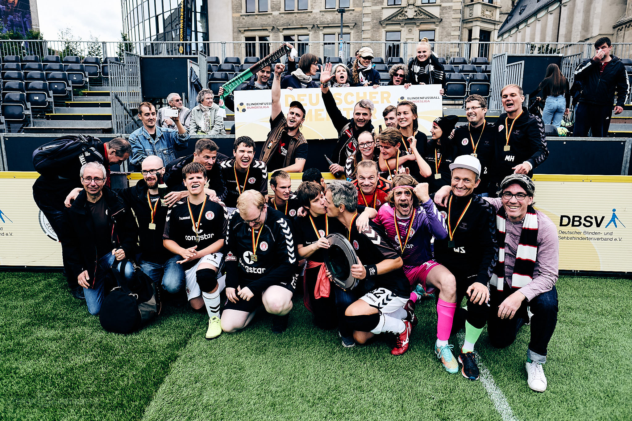 Wie es sich für eine gute deutsche Innenstadt gehört, chillten in der Nähe des Mitten in der Stadt platzierten Spielfelds ein paar Punks. Und natürlich trugen sie St. Pauli Devotionalien und hörten St. Pauli Musik. Ich hatte sie kurz vor dem Spiel entdeckt und freundlich rübergenickt. Da auch ich im Teamoutfit durch die Stadt lief, dämmerte den Jungs, was jetzt gleich nebenan passieren sollte. Spätestens als der Moderator durch die Lautsprecheranlage das Team vom FC St. Pauli begrüßte, hatten der Blindenfussball neue Fans gefunden. Sie verfolgten das Spiel von der Tribüne aus und feierten natürlich am Ende besonders intensiv. Ihr Bier wurde mit der Mannschaft geteilt, weil es sonst nur Sekt gab. Nach dem offiziellen Teil der Mannschaftsehrungen wurde daher die Feier schnell vor die Tribüne verlegt und ein Foto mit Familie und Punks gemacht. Die Jungs haben dann noch für die Zugwegzehrung aka mehr Bier gesorgt, während das Team für die Rückfahrt duschte. Und irgendwie kam das Team auch an das Schild mit der Aufschrift „Deutscher Meister“ von der Siegerehrung.